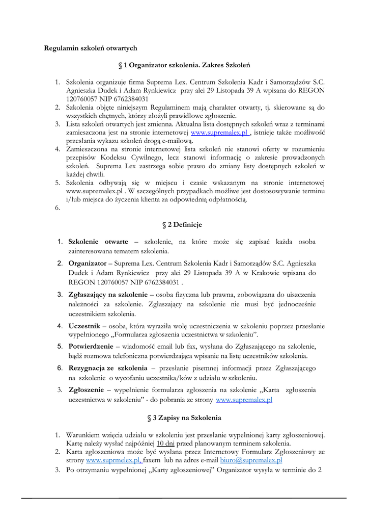 Regulamin szkoleń otwartych § 1 Organizator szkolenia. Zakres Szkoleń 1. Szkolenia organizuje firma Suprema Lex. Centrum Szkolenia Kadr i Samorządzów S.C. Agnieszka Dudek i Adam Rynkiewicz przy alei 29 Listopada 39 A wpisana do REGON 120760057 NIP 6762384031 2. Szkolenia objęte niniejszym Regulaminem mają charakter otwarty, tj. skierowane są do wszystkich chętnych, którzy złożyli prawidłowe zgłoszenie. 3. Lista szkoleń otwartych jest zmienna. Aktualna lista dostępnych szkoleń wraz z terminami zamieszczona jest na stronie internetowej www.supremalex.pl , istnieje także możliwość przesłania wykazu szkoleń drogą e-mailową. 4. Zamieszczona na stronie internetowej lista szkoleń nie stanowi oferty w rozumieniu przepisów Kodeksu Cywilnego, lecz stanowi informację o zakresie prowadzonych szkoleń. Suprema Lex zastrzega sobie prawo do zmiany listy dostępnych szkoleń w każdej chwili. 5. Szkolenia odbywają się w miejscu i czasie wskazanym na stronie internetowej www.supremalex.pl . W szczególnych przypadkach możliwe jest dostosowywanie terminu i/lub miejsca do życzenia klienta za odpowiednią odpłatnością. 6. § 2 Definicje 1. Szkolenie otwarte – szkolenie, na które może się zapisać każda osoba zainteresowana tematem szkolenia. 2. Organizator – Suprema Lex. Centrum Szkolenia Kadr i Samorządów S.C. Agnieszka Dudek i Adam Rynkiewicz przy alei 29 Listopada 39 A w Krakowie wpisana do REGON 120760057 NIP 6762384031 . 3. Zgłaszający na szkolenie – osoba fizyczna lub prawna, zobowiązana do uiszczenia należności za szkolenie. Zgłaszający na szkolenie nie musi być jednocześnie uczestnikiem szkolenia. 4. Uczestnik – osoba, która wyraziła wolę uczestniczenia w szkoleniu poprzez przesłanie wypełnionego „Formularza zgłoszenia uczestnictwa w szkoleniu”. 5. Potwierdzenie – wiadomość email lub fax, wysłana do Zgłaszającego na szkolenie, bądź rozmowa telefoniczna potwierdzająca wpisanie na listę uczestników szkolenia. 6. Rezygnacja ze szkolenia – przesłanie pisemnej informacji przez Zgłaszającego na szkolenie o wycofaniu uczestnika/ków z udziału w szkoleniu. 3. Zgłoszenie – wypełnienie formularza zgłoszenia na szkolenie „Karta zgłoszenia uczestnictwa w szkoleniu” - do pobrania ze strony www.supremalex.pl § 3 Zapisy na Szkolenia 1. Warunkiem wzięcia udziału w szkoleniu jest przesłanie wypełnionej karty zgłoszeniowej. Kartę należy wysłać najpóźniej 10 dni przed planowanym terminem szkolenia. 2. Karta zgłoszeniowa może być wysłana przez Internetowy Formularz Zgłoszeniowy ze strony www.suprmelex.pl, faxem lub na adres e-mail [email protected] 3. Po otrzymaniu wypełnionej „Karty zgłoszeniowej” Organizator wysyła w terminie do 2 dni roboczych, na adres mailowy wskazany w formularzu potwierdzenie przyjęcia zgłoszenia. 4. Warunkiem przeprowadzenia szkolenia otwartego przez Suprema Lex. Centrum Szkolenia Kadr i Samorządów. S.C. jest zgłoszenie do uczestnictwa w szkoleniu minimalnej liczby osób ustalanej indywidualnie dla każdego ze szkoleń. 5. Liczba uczestników szkolenia jest ograniczona, o wpisie na listę uczestników danego szkolenia decyduje kolejność zgłoszeń. 6. Zgłoszenia, które nadejdą po zamknięciu listy będą umieszczone na liście rezerwowej o czym niezwłocznie zostanie poinformowany Zgłaszający na szkolenie. 7. W przypadku rezygnacji przez jednego z Uczestników wpisanych na listę zgłoszonych na szkolenie osoba wpisana na listę rezerwową zostanie powiadomiona o tym przez Suprema Lex. Centrum Szkolenia Kadr i Samorządów. S.C. W przypadku potwierdzenia chęci wzięcia udziału w szkoleniu osoba z listy rezerwowej zostanie zakwalifikowana do udziału w szkoleniu. 8. Przesłanie karty zgłoszeniowej oznacza zaakceptowanie Regulaminu Uczestnictwa umieszczonego na stronie internetowej www.supremalex.pl § 4 Zakres Szkoleń 1. Dokładny zakres merytoryczny szkolenia zawarty jest w jego opisie na stronie internetowej. W informacji tej podane będą następujące informacje: Temat szkolenia, zakres szkolenia, cele szkolenia, czas trwania, grupa docelowa, cena szkolenia. 2. W ramach każdego z organizowanych szkoleń zapewniamy: o Materiały szkoleniowe w formie papierowej i/lub elektronicznej. o Zaświadczenie potwierdzające udział w szkoleniu wystawiane przez Suprema Lex. Centrum Szkolenia Kadr i Samorządów S.C wraz z określeniem jego długości i zakresu. o Pełne wyżywienie wraz z zakwaterowaniem w przypadku szkoleń dwu, trzy, czterodniowych. o Serwis kawowy oraz obiad, salę szkoleniową odpowiednio wyposażoną. 3. Szkolenia prowadzone są z należytą starannością przez osoby posiadające kwalifikacje i uprawnienia merytoryczne. § 5 Potwierdzenie Uczestnictwa. Zmiana terminu 1. Potwierdzenie uczestnictwa wraz z informacjami organizacyjnymi dotyczącymi szkolenia zostanie przekazane najpóźniej na 6 dni przed planowanym rozpoczęciem szkolenia na adres e-mail podany przez uczestnika w karcie zgłoszeniowej, bądź telefoniczne pod wskazany przez Uczestnika numer telefonu. 2. Organizator zastrzega sobie prawo do odwołania szkolenia, zmiany jego terminu, zmiany Ośrodka bądź Hotelu lub jego lokalizacji do 5 dni przed datą rozpoczęcia szkolenia o czym niezwłocznie powiadomi Uczestników. 3. W wypadku odwołania szkolenia organizator informuje o tym fakcie Zgłaszającego na szkolenie. Informacja dotycząca odwołania szkolenia przesyłana jest na adres e-mail wskazany w Zgłoszeniu lub przekazana telefonicznie. 4. W przypadku odwołania Szkolenia przez Organizatora Zgłaszający na szkolenie wydaje dyspozycję dotyczącą wpłaconej zaliczki lub opłaty za szkolenie tj.: a) Zwrot wniesionych opłat na rachunek bankowy, z którego dokonana była płatność. b) Pozostawienie wpłaconych środków na rachunku Organizatora tytułem opłaty za uczestnictwo w szkoleniu, które odbędzie się w późniejszym terminie. 5. Organizator poinformuje Zgłaszając