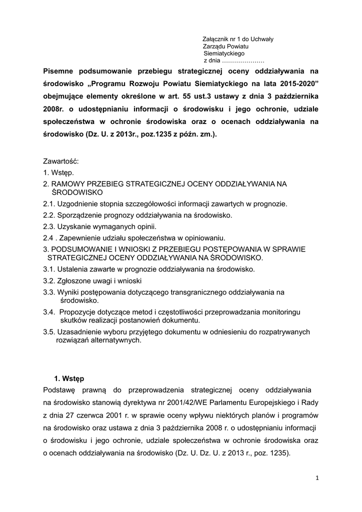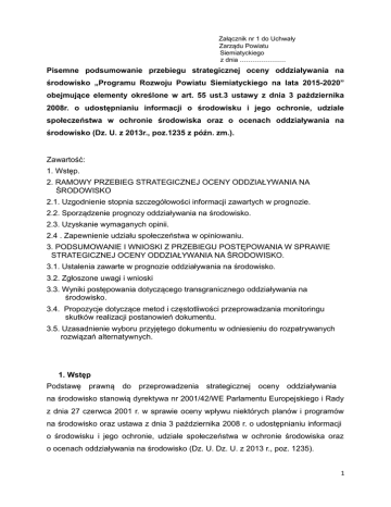 Załącznik nr 1 do Uchwały Zarządu Powiatu Siemiatyckiego z dnia ………………… Pisemne podsumowanie przebiegu strategicznej oceny oddziaływania na środowisko „Programu Rozwoju Powiatu Siemiatyckiego na lata 2015-2020” obejmujące elementy określone w art. 55 ust.3 ustawy z dnia 3 października 2008r. o udostępnianiu informacji o środowisku i jego ochronie, udziale społeczeństwa w ochronie środowiska oraz o ocenach oddziaływania na środowisko (Dz. U. z 2013r., poz.1235 z późn. zm.). Zawartość: 1. Wstęp. 2. RAMOWY PRZEBIEG STRATEGICZNEJ OCENY ODDZIAŁYWANIA NA ŚRODOWISKO 2.1. Uzgodnienie stopnia szczegółowości informacji zawartych w prognozie. 2.2. Sporządzenie prognozy oddziaływania na środowisko. 2.3. Uzyskanie wymaganych opinii. 2.4 . Zapewnienie udziału społeczeństwa w opiniowaniu. 3. PODSUMOWANIE I WNIOSKI Z PRZEBIEGU POSTĘPOWANIA W SPRAWIE STRATEGICZNEJ OCENY ODDZIAŁYWANIA NA ŚRODOWISKO. 3.1. Ustalenia zawarte w prognozie oddziaływania na środowisko. 3.2. Zgłoszone uwagi i wnioski 3.3. Wyniki postępowania dotyczącego transgranicznego oddziaływania na środowisko. 3.4. Propozycje dotyczące metod i częstotliwości przeprowadzania monitoringu skutków realizacji postanowień dokumentu. 3.5. Uzasadnienie wyboru przyjętego dokumentu w odniesieniu do rozpatrywanych rozwiązań alternatywnych. 1. Wstęp Podstawę prawną do przeprowadzenia strategicznej oceny oddziaływania na środowisko stanowią dyrektywa nr 2001/42/WE Parlamentu Europejskiego i Rady z dnia 27 czerwca 2001 r. w sprawie oceny wpływu niektórych planów i programów na środowisko oraz ustawa z dnia 3 października 2008 r. o udostępnianiu informacji o środowisku i jego ochronie, udziale społeczeństwa w ochronie środowiska oraz o ocenach oddziaływania na środowisko (Dz. U. Dz. U. z 2013 r., poz. 1235). 1 Zgodnie z art. 3 pkt 14 ww. ustawy strategiczna ocena oddziaływania na środowisko to postępowanie w sprawie oceny oddziaływania na środowisko skutków realizacji polityk, strategii, planów lub programów. Ocena ta obejmuje: 1. uzgodnienie stopnia szczegółowości informacji zawartych w prognozie oddziaływania na środowisko; 2. sporządzenie prognozy oddziaływania na środowisko; 3. uzyskanie wymaganych opinii; 4. zapewnienie udziału społeczeństwa w postępowaniu. Zgodnie z art. 55 ust. 3 ww. ustawy do przyjętego dokumentu załącza się pisemne podsumowanie zawierające uzasadnienie wyboru przyjętego dokumentu w odniesieniu do rozpatrywanych rozwiązań alternatywnych, a także informację, w jaki sposób zostały wzięte pod uwagę i w jakim zakresie zostały uwzględnione: 1. ustalenia zawarte w prognozie oddziaływania na środowisko; 2. opinie właściwych organów (Regionalnego Dyrektora Ochrony Środowiska oraz Państwowego Wojewódzkiego Inspektora Sanitarnego); 3. zgłoszone uwagi i wnioski; 4. wyniki postępowania dotyczącego transgranicznego oddziaływania na środowisko, jeżeli zostało przeprowadzone; 5. propozycje dotyczące metod i częstotliwości przeprowadzania monitoringu skutków realizacji postanowień dokumentu. Przedmiotem oceny oddziaływania na środowisko jest projekt dokumentu: „Program rozwoju powiatu Siemiatyckiego na lata 2015-2020” . 2. RAMOWY PRZEBIEG STRATEGICZNEJ OCENY ODDZIAŁYWANIA NA ŚRODOWISKO Postępowanie w sprawie strategicznej oceny oddziaływania na środowisko przebiegało w czterech etapach: 1. uzgodnienie stopnia szczegółowości informacji zawartych w prognozie oddziaływania na środowisko; 2. sporządzenie prognozy oddziaływania na środowisko; 2 3. uzyskanie wymaganych opinii; 4. zapewnienie udziału społeczeństwa w postępowaniu. 2.1. Uzgodnienie stopnia szczegółowości informacji zawartych w prognozie. Pismem z dnia 21.05.2015 r. Starosta Siemiatycki w dniu 22.05.2015r. wystąpił do Regionalnego Dyrektora Ochrony Środowiska w Białymstoku o uzgodnienie zakresu i stopnia szczegółowości informacji zawartych w prognozie oddziaływania na środowisko. W tej samej sprawie zostało wystosowane dnia 22.05.2015r. pismo do Państwowego Wojewódzkiego Inspektora Sanitarnego w Białymstoku Regionalny Dyrektor Ochrony Środowiska w Białymstoku WOOŚ-I.411.2.8.2015.AR z dnia 02 czerwca 2015 r. uzgodnił pismem zakres i stopień szczegółowości informacji wymaganych w prognozie oddziaływania na środowisko do projektu „Programu Rozwoju Powiatu Siemiatyckiego na lata 2015-2020” prognozy oddziaływania na środowisko zgodnie z art. 51 ust.2 pkt 1,2,3 przy zachowaniu warunków, o których mowa w art.52 ust 1 i 2 ustawy z dnia 3 października 2008 o udostępnianiu informacji o środowisku i jego ochronie, udziale społeczeństwa w ochronie środowiska oraz o ocenach oddziaływania na środowisko (Dz. U. Dz. U. z 2013 r., poz. 1235). Państwowy Wojewódzki Inspektor Sanitarny w Białymstoku również uzgodnił pismem z dnia 29.05.2015r. znak NZ.0523.58.2015 zakres i stopień szczegółowości informacji wymaganych w prognozie oddziaływania na środowisko przedmiotowego programu. 2.2. Sporządzenie prognozy oddziaływania na środowisko. W lipcu 2015 r. przystąpiono do opracowania wymaganej przez ww. ustawę Prognozy oddziaływania na środowisko „Programu rozwoju powiatu siemiatyckiego na lata 2015-2020”. 2.3. Uzyskanie wymaganych opinii. Zgodnie z art. 54. ust. 1 i art. 58 ust.1 pkt. 2 ww. ustawy Starosta Siemiatycki w dniu 27.08.2015r. przekazał projekt „Programu Rozwoju Powiatu Siemiatyckiego na lata 2015-2020”, wraz z prognozą oddziaływania na środowisko, do zaopiniowania przez 3 Regionalnego Dyrektora Ochrony Środowiska w Białymstoku oraz do Państwowego Wojewódzkiego Inspektora Sanitarnego w Białymstoku. Zgodnie z ustawą w/w. organy wydają opinię w terminie 30 dni od dnia otrzymania wniosku o wydanie opinii. W dniu 18.09.2015 roku pismem WOOŚ-I.410.2.23.2015.AR projekt programu wraz z prognozą został zaopiniowany pozytywnie przez Regionalnego Dyrektora Ochrony Śr