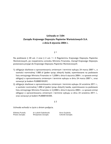 Uchwała nr 7/04 Zarządu Krajowego Depozytu Papierów Wartościowych S.A. z dnia 8 stycznia 2004 r. §1 Na podstawie § 40 ust. 2 oraz § 2 ust. 1 i 4 Regulaminu Krajowego Depozytu Papierów Wartościowych, po rozpatrzeniu wniosku Ministra Finansów, Zarząd Krajowego Depozytu postanawia przyjąć do Krajowego Depozytu Papierów Wartościowych: 1) obligacje skarbowe o oprocentowaniu zmiennym i terminie wykupu 24 marca 2007 r., o wartości nominalnej 1.000 zł (jeden tysiąc złotych) każda, wyemitowane na podstawie listu emisyjnego Ministra Finansów nr 1/2004 z dnia 6 stycznia 2004 r. w sprawie emisji obligacji o oprocentowaniu zmiennym i terminie wykupu w dniu 24 marca 2007 r., oraz oznaczyć je kodem PL0000103297; 2) obligacje skarbowe o oprocentowaniu zmiennym i terminie wykupu 24 września 2011 r., o wartości nominalnej 1.000 zł (jeden tysiąc złotych) każda, wyemitowane na podstawie listu emisyjnego Ministra Finansów nr 2/2004 z dnia 6 stycznia 2004 r. w sprawie emisji obligacji o oprocentowaniu zmiennym i terminie wykupu w dniu 24 września 2011 r., oraz oznaczyć je kodem PL0000103305. §2 Uchwała wchodzi w życie z dniem podjęcia. Elżbieta Pustoła Prezes Zarządu dr Ludwik Sobolewski Wiceprezes Zarządu Anna Szulecka Członek Zarządu