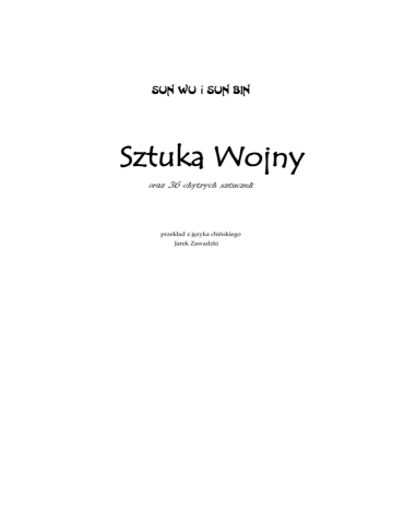 Sun Wu i Sun Bin Sztuka Wojny oraz 36 chytrych sztuczek przekład z języka chińskiego Jarek Zawadzki © Copyright for the Polish translation by Jarosław Zawadzki 2008 Freeware. Second Beta Version. Revised. Still buggy though. 2 Spis treści OD TŁUMACZA................................................................................................6 Nieco na temat ortografii.............................................................................................6 Na temat sztuki przekładu............................................................................................8 Na temat oryginału....................................................................................................11 Na temat autorów......................................................................................................12 SZTUKA WOJNY SUN WU...........................................................................16 I Rozważania wstępne................................................................................................18 II Działania wojenne..................................................................................................20 III Obmyślanie forteli.................................................................................................21 IV Forma militarna....................................................................................................23 V Potencjał bitewny...................................................................................................24 VI Słabe i mocne strony.............................................................................................25 VII Starcie..................................................................................................................27 VIII Zmienne warunki................................................................................................29 IX Ruchy wojsk..........................................................................................................30 X Ukształtowanie terenu............................................................................................32 XI Dziewięć rodzajów terenu.....................................................................................34 XII Użycie ognia........................................................................................................37 XIII Wywiad...............................................................................................................38 SZTUKA WOJNY SUN BIN...........................................................................41 CZĘŚĆ PIERWSZA...............................................................................................................43 I Pojmanie Pang Juana..............................................................................................43 II Audiencja u króla Wej............................................................................................45 III Król Wej pyta........................................................................................................47 IV Tian Ji pyta o fortyfikacje.....................................................................................50 V Jednostki doborowe................................................................................................52 VI Udział księżyca w bitwie.......................................................................................53 VII Formacja klina....................................................................................................54 VIII Skarby w terenie.................................................................................................55 IX Przygotowanie potencjału bitewnego....................................................................56 X Sytuacja w armii.....................................................................................................57 XI Wybór....................................................................................................................58 XII Poświęcenie żołnierskie.......................................................................................59 XIII Utrzymać morale................................................................................................60 XIV Wytyczne dla dowództwa....................................................................................61 XV [Silna armia].......................................................................................................64 XVI Pięć zasad szkolenia...........................................................................................65 3 CZĘŚĆ DRUGA...................................................................................................................67 I Dziesięć sposobów ataku.........................................................................................67 II Dziesięć pytań........................................................................................................70 III Przejęcie żołnierzy................................................................................................72 IV Ofensywa i defensywa...........................................................................................73 V Dobry dowódca......................................................................................................75 VI Szacunek i brutalność............................................................................................76 VII [Porażka].............................................................................................................77 VIII Sprawiedliwość generalska................................................................................78 IX Zalety generała.....................................................................................................79 X Wady generalskie.....................................................................................