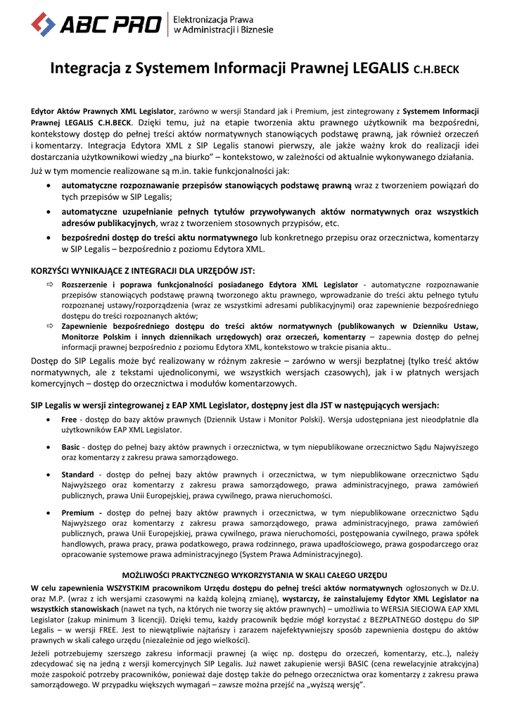 Integracja z Systemem Informacji Prawnej LEGALIS C.H.BECK Edytor Aktów Prawnych XML Legislator, zarówno w wersji Standard jak i Premium, jest zintegrowany z Systemem Informacji Prawnej LEGALIS C.H.BECK. Dzięki temu, już na etapie tworzenia aktu prawnego użytkownik ma bezpośredni, kontekstowy dostęp do pełnej treści aktów normatywnych stanowiących podstawę prawną, jak również orzeczeń i komentarzy. Integracja Edytora XML z SIP Legalis stanowi pierwszy, ale jakże ważny krok do realizacji idei dostarczania użytkownikowi wiedzy „na biurko” – kontekstowo, w zależności od aktualnie wykonywanego działania. Już w tym momencie realizowane są m.in. takie funkcjonalności jak: automatyczne rozpoznawanie przepisów stanowiących podstawę prawną wraz z tworzeniem powiązań do tych przepisów w SIP Legalis; automatyczne uzupełnianie pełnych tytułów przywoływanych aktów normatywnych oraz wszystkich adresów publikacyjnych, wraz z tworzeniem stosownych przypisów, etc. bezpośredni dostęp do treści aktu normatywnego lub konkretnego przepisu oraz orzecznictwa, komentarzy w SIP Legalis – bezpośrednio z poziomu Edytora XML. KORZYŚCI WYNIKAJĄCE Z INTEGRACJI DLA URZĘDÓW JST: Rozszerzenie i poprawa funkcjonalności posiadanego Edytora XML Legislator - automatyczne rozpoznawanie przepisów stanowiących podstawę prawną tworzonego aktu prawnego, wprowadzanie do treści aktu pełnego tytułu rozpoznanej ustawy/rozporządzenia (wraz ze wszystkimi adresami publikacyjnymi) oraz zapewnienie bezpośredniego dostępu do treści rozpoznanych aktów; Zapewnienie bezpośredniego dostępu do treści aktów normatywnych (publikowanych w Dzienniku Ustaw, Monitorze Polskim i innych dziennikach urzędowych) oraz orzeczeń, komentarzy – zapewnia dostęp do pełnej informacji prawnej bezpośrednio z poziomu Edytora XML, kontekstowo w trakcie pisania aktu.. Dostęp do SIP Legalis może być realizowany w różnym zakresie – zarówno w wersji bezpłatnej (tylko treść aktów normatywnych, ale z tekstami ujednoliconymi, we wszystkich wersjach czasowych), jak i w płatnych wersjach komercyjnych – dostęp do orzecznictwa i modułów komentarzowych. SIP Legalis w wersji zintegrowanej z EAP XML Legislator, dostępny jest dla JST w następujących wersjach: Free - dostęp do bazy aktów prawnych (Dziennik Ustaw i Monitor Polski). Wersja udostępniana jest nieodpłatnie dla użytkowników EAP XML Legislator. Basic - dostęp do pełnej bazy aktów prawnych i orzecznictwa, w tym niepublikowane orzecznictwo Sądu Najwyższego oraz komentarzy z zakresu prawa samorządowego. Standard - dostęp do pełnej bazy aktów prawnych i orzecznictwa, w tym niepublikowane orzecznictwo Sądu Najwyższego oraz komentarzy z zakresu prawa samorządowego, prawa administracyjnego, prawa zamówień publicznych, prawa Unii Europejskiej, prawa cywilnego, prawa nieruchomości. Premium - dostęp do pełnej bazy aktów prawnych i orzecznictwa, w tym niepublikowane orzecznictwo Sądu Najwyższego oraz komentarzy z zakresu prawa samorządowego, prawa administracyjnego, prawa zamówień publicznych, prawa Unii Europejskiej, prawa cywilnego, prawa nieruchomości, postępowania cywilnego, prawa spółek handlowych, prawa pracy, prawa podatkowego, prawa rodzinnego, prawa upadłościowego, prawa gospodarczego oraz opracowanie systemowe prawa administracyjnego (System Prawa Administracyjnego). MOŻLIWOŚCI PRAKTYCZNEGO WYKORZYSTANIA W SKALI CAŁEGO URZĘDU W celu zapewnienia WSZYSTKIM pracownikom Urzędu dostępu do pełnej treści aktów normatywnych ogłoszonych w Dz.U. oraz M.P. (wraz z ich wersjami czasowymi na każdą kolejną zmianę), wystarczy, że zainstalujemy Edytor XML Legislator na wszystkich stanowiskach (nawet na tych, na których nie tworzy się aktów prawnych) – umożliwia to WERSJA SIECIOWA EAP XML Legislator (zakup minimum 3 licencji). Dzięki temu, każdy pracownik będzie mógł korzystać z BEZPŁATNEGO dostępu do SIP Legalis – w wersji FREE. Jest to niewątpliwie najtańszy i zarazem najefektywniejszy sposób zapewnienia dostępu do aktów prawnych w skali całego urzędu (niezależnie od jego wielkości). Jeżeli potrzebujemy szerszego zakresu informacji prawnej (a więc np. dostępu do orzeczeń, komentarzy, etc..), należy zdecydować się na jedną z wersji komercyjnych SIP Legalis. Już nawet zakupienie wersji BASIC (cena rewelacyjnie atrakcyjna) może zaspokoić potrzeby pracowników, ponieważ daje dostęp także do pełnego orzecznictwa oraz komentarzy z zakresu prawa samorządowego. W przypadku większych wymagań – zawsze można przejść na „wyższą wersję”. INTEGRACJA Z SIP LEGALIS – Jak to wygląda i jak działa? DOSTĘP DO SIP LEGALIS – bezpośrednio z poziomu Edytora Aktów Prawnych XML Legislator (w wersji Standard i Premium) AUTOMATYCZNE ROZPOZNAWANIE PRZEPISÓW STANOWIĄCYCH PODSTAWĘ PRAWNĄ Wystarczy, że wpiszemy właściwe artykuły i nawet bardzo ogólnie podamy tytuł ustawy (innego aktu stanowiącego podstawę prawną) – przykład widzimy poniżej: Po zakończeniu pisania „podstawy prawnej”, po kliknięciu ENTER, edytor automatycznie wyszuka w Systemie Informacji Prawnej LEGALIS akty stanowiące podstawę prawną – wyszuka je na podstawie takich danych, jakie wpiszemy (nawet niepełnych). Taka sama operacja wyszukiwania zostanie wykonana, gdy klikniemy przycisk „WYSZUKAJ PONOWNIE”. Wynik widzimy poniżej: Po kliknięciu przycisku POPRAW PODSTAWĘ PRAWNĄ, system automatycznie uzupełnia w treści PEŁNY TYTUŁ aktu prawnego i ponadto przywołuje wszystkie adresy publikacyjne danego aktu normatywnego – w przypadku dużej liczby zmian, umieszcza je w stosownym odnośniku (przypisie), zgodnie z „zasadami techniki prawodawczej”. Efekt tej operacji widzimy poniżej: oraz przypisy z adresami publikacyjnymi (utworzone automatycznie):