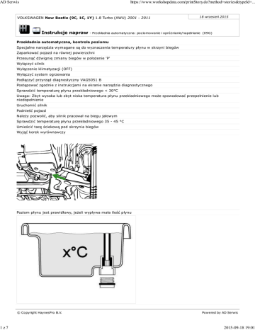 AD Serwis 1z7 https://www.workshopdata.com/printStory.do?method=stories&typeId=... VOLKSWAGEN New Beetle (9C, 1C, 1Y) 1.8 Turbo (AWU) 2001 - 2011 Instrukcje napraw 18 wrzesień 2015 - Przekładnia automatyczna: poziomowanie i opróżnianie/napełnianie (09G) Przekładnia automatyczna, kontrola poziomu Specjalne narzędzia wymagane są do wyznaczenia temperatury płynu w skrzyni biegów Zaparkować pojazd na równej powierzchni Przesunąć dźwignię zmiany biegów w położenie 'P' Wyłączyć silnik Wyłączenie klimatyzacji (OFF) Wyłączyć system ogrzewania Podłączyć przyrząd diagnostyczny VAG5051 B Postępować zgodnie z instrukcjami na ekranie narzędzia diagnostycznego Sprawdzić temperaturę płynu przekładniowego < 30°C Uwaga: Zbyt wysoka lub zbyt niska temperatura płynu przekładniowego może spowodować przepełnienie lub niedopełnienie Uruchomić silnik Podnieść pojazd Należy pozwolić, aby silnik pracował na biegu jałowym Sprawdzić temperaturę płynu przekładniowego 35 - 45 °C Umieścić tacę ściekową pod skrzynia biegów Wyjąć korek wyrównawczy Poziom płynu jest prawidłowy, jeżeli wypływa mała ilość płynu © Copyright HaynesPro B.V. Powered by AD Serwis 2015-09-18 19:01 AD Serwis 2z7 https://www.workshopdata.com/printStory.do?method=stories&typeId=... VOLKSWAGEN New Beetle (9C, 1C, 1Y) 1.8 Turbo (AWU) 2001 - 2011 Instrukcje napraw 18 wrzesień 2015 - Przekładnia automatyczna: poziomowanie i opróżnianie/napełnianie (09G) Przekładnia automatyczna, kontrola poziomu Uwaga: Temperatura nie może przekraczać 45° C Uwaga: Zbyt wysoka lub zbyt niska temperatura płynu przekładniowego może spowodować przepełnienie lub niedopełnienie W razie potrzeby poprawić Przy pomocy przyrządu specjalnego A VAS 6262/2 Przy pomocy przyrządu specjalnego B = VAG 6262 Dolać 1,0 litr ATF (cieczy do przekładni hydrokinetycznych) Zdemontować przyrząd specjalny Poczekać aż odpłynie nadmiar płynu Poziom płynu jest prawidłowy, jeżeli wypływa mała ilość płynu Ponownie zamontować korek poziomu oleju Wymienić uszczelkę 15 Nm Przekładnia automatyczna, opróżnianie/napełnianie Umieścić tacę ściekową pod skrzynia biegów Wyjąć korek wyrównawczy B Zdemontować rurę przelewową A © Copyright HaynesPro B.V. Powered by AD Serwis 2015-09-18 19:01 AD Serwis 3z7 https://www.workshopdata.com/printStory.do?method=stories&typeId=... VOLKSWAGEN New Beetle (9C, 1C, 1Y) 1.8 Turbo (AWU) 2001 - 2011 Instrukcje napraw 18 wrzesień 2015 - Przekładnia automatyczna: poziomowanie i opróżnianie/napełnianie (09G) Przekładnia automatyczna, kontrola poziomu Spuścić olej przekładniowy ze skrzyni biegów Wymienić uszczelkę Ponownie zamontować rurę przelewową A = 2 Nm Uzupełnić olej w skrzyni biegów Metoda 1 Przy pomocy przyrządu specjalnego A = VAS 6262/2 Uzupełniać płyn, dopóki nie będzie on wypływał z otworu w korku wyrównawczym B = VAS 6262 © Copyright HaynesPro B.V. VAS 6262/2 VAS 6262 Powered by AD Serwis 2015-09-18 19:01 AD Serwis 4z7 https://www.workshopdata.com/printStory.do?method=stories&typeId=... VOLKSWAGEN New Beetle (9C, 1C, 1Y) 1.8 Turbo (AWU) 2001 - 2011 Instrukcje napraw 18 wrzesień 2015 - Przekładnia automatyczna: poziomowanie i opróżnianie/napełnianie (09G) Przekładnia automatyczna, kontrola poziomu Ponownie zamontować korek poziomu oleju Uwaga: Tylko dokręcić palcami Metoda 2 Jeżeli zostały zamontowane: Wyjąć korek wlewu Przy pomocy przyrządu specjalnego VAG 1924 Dla obu metod: Przesunąć dźwignię zmiany biegów w położenie 'P' Uruchomić silnik Przełączyć przez wszystkie koła zębate przekładni, przystając na każdym biegu na 10 sekund Sprawdzić temperaturę płynu przekładniowego 35 - 45° C Uwaga: Zbyt wysoka lub zbyt niska temperatura płynu przekładniowego może spowodować przepełnienie lub niedopełnienie Wyjąć korek wyrównawczy © Copyright HaynesPro B.V. Powered by AD Serwis 2015-09-18 19:01 AD Serwis 5z7 https://www.workshopdata.com/printStory.do?method=stories&typeId=... VOLKSWAGEN New Beetle (9C, 1C, 1Y) 1.8 Turbo (AWU) 2001 - 2011 Instrukcje napraw 18 wrzesień 2015 - Przekładnia automatyczna: poziomowanie i opróżnianie/napełnianie (09G) Przekładnia automatyczna, kontrola poziomu Poziom płynu jest prawidłowy, jeżeli wypływa mała ilość płynu W razie konieczności uzupełnić Temperatura płynu przekładniowego nie powinna przekraczać 45 °C Ponownie zamontować korek poziomu oleju Uwaga: Używane są różne typy Wymienić uszczelkę © Copyright HaynesPro B.V. Powered by AD Serwis 2015-09-18 19:01 AD Serwis 6z7 https://www.workshopdata.com/printStory.do?method=stories&typeId=... VOLKSWAGEN New Beetle (9C, 1C, 1Y) 1.8 Turbo (AWU) 2001 - 2011 Instrukcje napraw 18 wrzesień 2015 - Przekładnia automatyczna: poziomowanie i opróżnianie/napełnianie (09G) Przekładnia automatyczna, kontrola poziomu Sprawdzić poziom płynu w skrzyni biegów Ustawienia momentu obrotowego Rura przelewowa 2 Nm Korek wyrównawczy przekładni automatycznej Korek wyrównawczy przekładni automatycznej 27 (Nm) Narzędzia specjalne Narzędzie do napełniania ATF A Narzędzie do napełniania ATF: B = VAS 6262 © Copyright HaynesPro B.V. VAS 6262/2 VAS 6262 Powered by AD Serwis 2015-09-18 19:01 AD Serwis 7z7 https://www.workshopdata.com/printStory.do?method=stories&typeId=... VOLKSWAGEN New Beetle (9C, 1C, 1Y) 1.8 Turbo (AWU) 2001 - 2011 Instrukcje napraw 18 wrzesień 2015 - Przekładnia automatyczna: poziomowanie i opróżnianie/napełnianie (09G) Przekładnia automatyczna, kontrola poziomu Narzędzie do napełniania ATF: © Copyright HaynesPro B.V. VAG 1924 Powered by AD Serwis 2015-09-18 19:01