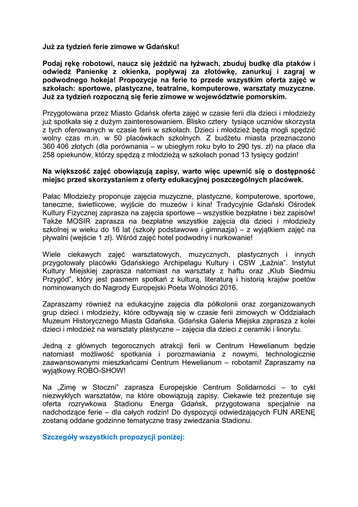 Już za tydzień ferie zimowe w Gdańsku! Podaj rękę robotowi, naucz się jeździć na łyżwach, zbuduj budkę dla ptaków i odwiedź Panienkę z okienka, popływaj za złotówkę, zanurkuj i zagraj w podwodnego hokeja! Propozycje na ferie to przede wszystkim oferta zajęć w szkołach: sportowe, plastyczne, teatralne, komputerowe, warsztaty muzyczne. Już za tydzień rozpoczną się ferie zimowe w województwie pomorskim. Przygotowana przez Miasto Gdańsk oferta zajęć w czasie ferii dla dzieci i młodzieży już spotkała się z dużym zainteresowaniem. Blisko cztery tysiące uczniów skorzysta z tych oferowanych w czasie ferii w szkołach. Dzieci i młodzież będą mogli spędzić wolny czas m.in. w 50 placówkach szkolnych. Z budżetu miasta przeznaczono 360 406 złotych (dla porównania – w ubiegłym roku było to 290 tys. zł) na płace dla 258 opiekunów, którzy spędzą z młodzieżą w szkołach ponad 13 tysięcy godzin! Na większość zajęć obowiązują zapisy, warto więc upewnić się o dostępność miejsc przed skorzystaniem z oferty edukacyjnej poszczególnych placówek. Pałac Młodzieży proponuje zajęcia muzyczne, plastyczne, komputerowe, sportowe, taneczne, świetlicowe, wyjście do muzeów i kina! Tradycyjnie Gdański Ośrodek Kultury Fizycznej zaprasza na zajęcia sportowe – wszystkie bezpłatne i bez zapisów! Także MOSIR zaprasza na bezpłatne wszystkie zajęcia dla dzieci i młodzieży szkolnej w wieku do 16 lat (szkoły podstawowe i gimnazja) – z wyjątkiem zajęć na pływalni (wejście 1 zł). Wśród zajęć hotel podwodny i nurkowanie! Wiele ciekawych zajęć warsztatowych, muzycznych, plastycznych i innych przygotowały placówki Gdańskiego Archipelagu Kultury i CSW „Łaźnia”. Instytut Kultury Miejskiej zaprasza natomiast na warsztaty z haftu oraz „Klub Siedmiu Przygód”, który jest pasmem spotkań z kulturą, literaturą i historią krajów poetów nominowanych do Nagrody Europejski Poeta Wolności 2016. Zapraszamy również na edukacyjne zajęcia dla półkolonii oraz zorganizowanych grup dzieci i młodzieży, które odbywają się w czasie ferii zimowych w Oddziałach Muzeum Historycznego Miasta Gdańska. Gdańska Galeria Miejska zaprasza z kolei dzieci i młodzież na warsztaty plastyczne – zajęcia dla dzieci z ceramiki i linorytu. Jedną z głównych tegorocznych atrakcji ferii w Centrum Hewelianum będzie natomiast możliwość spotkania i porozmawiania z nowymi, technologicznie zaawansowanymi mieszkańcami Centrum Hewelianum – robotami! Zapraszamy na wyjątkowy ROBO-SHOW! Na „Zimę w Stoczni” zaprasza Europejskie Centrum Solidarności – to cykl niezwykłych warsztatów, na które obowiązują zapisy. Ciekawie też prezentuje się oferta rozrywkowa Stadionu Energa Gdańsk, przygotowana specjalnie na nadchodzące ferie – dla całych rodzin! Do dyspozycji odwiedzających FUN ARENĘ zostaną oddane godzinne tematyczne trasy zwiedzania Stadionu. Szczegóły wszystkich propozycji poniżej: LP Wykaz placówek, w których odbywają się zajęcia w czasie ferii . nazwa adres dzielnica telefon rodzaj zajęć termin placówki zajęć 1. Szkoła Łąkowa 61 ŚRÓDMI 58 301- zajęcia 22.II EŚCIE 54-31 świetlicowe, Podstawowa nr 2016 4 sportowe, turystyczne, kulturalne, plastycznotechniczne 2. Szkoła ul. Dragana CHEŁM 58 303- zajęcia 22.II Podstawowa nr 2 65-79 opiekuńczo2016 8 wychowawcze i sportoworekreacyjne 3. Szkoła ul. UJEŚCIS 58 785- zajęcia 15.II Podstawowa nr Człuchows KO01-00 sportowo2016 12 ka 6 ŁOSTOW rekreacyjne, ICE plastycznomuzyczne, zajęcia w pracowni komputerowej, zajęcia ekologiczne, wędrówki po Gdańsku 15.II 4. Szkoła ul. ANIOŁKI 58 520- zajęcia Podstawowa nr Smoluchow 39-97 rekreacyjno2016 15 skiego 13 sportowe, artystyczne, zabawy i ćwiczenia z elementami pedagogiki zabawy, ruchu rozwijającego, konstrukcyjne, z wykorzystanie m technologii informacyjno- lic godziny zb zajęć a d ni 26.II. 5 800 - 1600 26.II. 5 800 - 1600 26.II. 1 700 - 1600 0 19.II. 5 730 - 1530 komputerowej, edukacja w plenerze ul. WRZESZ 58 341- zajęcia 5. Szkoła 15.II Podstawowa nr Czarnieckie CZ 09-20 opiekuńczo2016 17 rgo 2 GÓRNY wychowawcze i sportoworekreacyjne 6. Szkoła ul. Wczasy BRZEŹN 58 343- zajęcia 15.II Podstawowa nr 3 O 58-00 świetlicowo2016 20 warsztatowosportowoturystyczne ,,Jestem z Gdańska'' 7. Szkoła ul. Opacka OLIWA 58 552- zajęcia 15.II Podstawowa nr 7 17-77 świetlicowe, 2016 23 sportoworekreacyjne, zajęcia plastyczne 8. Szkoła ul. Lilii WRZESZ 58 344- półkolonie 15.II Podstawowa nr Wenedy 19 CZ 90-32 2016 24 DOLNY 19.II. 5 800 - 1600 19.II. 5 730 - 1530 26.II. 1 700 - 1700 0 19.II. 5 730 - 1530 ul. WRZESZ 58 341- zajęcia 15.II - 26.II. 1 9. Szkoła 19-60 Podstawowa nr Obywatelsk CZ sportowe i 2016 0 39 a1 GÓRNY rekreacyjnopoznawcze 10. Szkoła ul. Stroma ORUNIA- 58 309- półkolonie 15.II - 26.II. 1 Podstawowa nr 19 ŚW. 06-16 ''kulturalnie i 2016 0 40 WOJCIE sportowo" CHLIPCE 11. Szkoła ul. PRZYMO 58 553- zajęcia 15.II - 19.II. 5 Podstawowa nr Jagiellońsk RZE 04-71 komputerowe, 2016 44 a 24 Wielkie plastyczne, sportowe i artystyczne 12. Szkoła ul. Matki WRZESZ 58 341- zajęcia 15.II - 19.II. 5 Podstawowa nr Polki 3a CZ 47-13 kreatywne, 2016 45 GÓRNY edukacja kulturalna, zajęcia sportoworekreacyjne oraz 700 - 1500 700 - 1500 800 - 1600 800 - 1600 przyrodniczoekologiczne ul. 13. Szkoła Podstawowa nr Arkońska 46 17 PRZYMO 58 553- zajęcia 15.II - 26.II. 1 800 - 1600 RZE Małe 27-23 opiekuńczo2016 0 wychowawcze 14. Szkoła ul. CHEŁM Podstawowa nr Reformack 47 a 18 al. 15. Szkoła Podstawowa nr Legionów 49 11 58 302- zajęcia 15.II - 19.II. 5 730 - 1530 03-28 opiekuńczo2016 wychowawcze WRZESZ 58 341- zajęciakulturaln 15.II - 26.II. 1 730 - 1530 CZ 37-33 osportowo- 2016 0 DOLNY rekreacyjne 16. Szkoła ul. Grobla ŚRÓDMI 58 301- zajęcia 15.II Podstawowa nr IV 8 EŚCIE 18-48 przyrodniczo- 2016 50 techniczne "Odkrywam świat", zajęcia aktywności twórczej "Plastyka n
