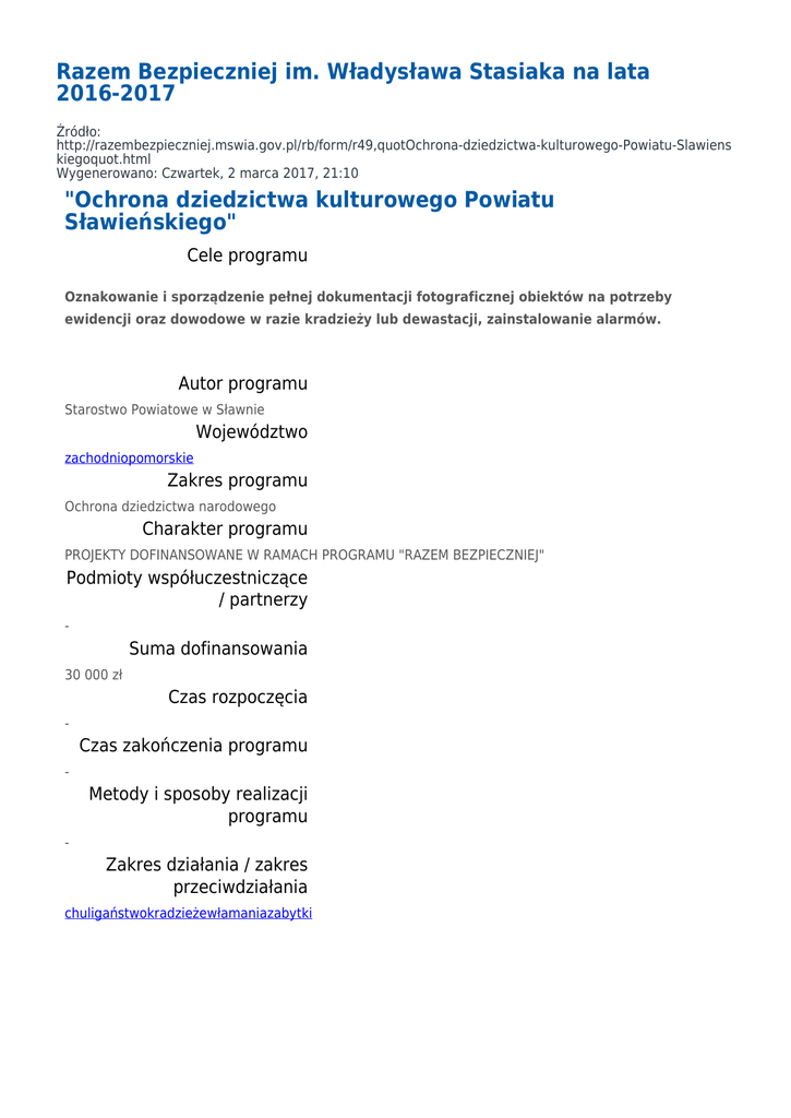 Razem Bezpieczniej im. Władysława Stasiaka na lata 2016-2017 Źródło: http://razembezpieczniej.mswia.gov.pl/rb/form/r49,quotOchrona-dziedzictwa-kulturowego-Powiatu-Slawiens kiegoquot.html Wygenerowano: Czwartek, 2 marca 2017, 21:10 "Ochrona dziedzictwa kulturowego Powiatu Sławieńskiego" Cele programu Oznakowanie i sporządzenie pełnej dokumentacji fotograficznej obiektów na potrzeby ewidencji oraz dowodowe w razie kradzieży lub dewastacji, zainstalowanie alarmów. Autor programu Starostwo Powiatowe w Sławnie Województwo zachodniopomorskie Zakres programu Ochrona dziedzictwa narodowego Charakter programu PROJEKTY DOFINANSOWANE W RAMACH PROGRAMU "RAZEM BEZPIECZNIEJ" Podmioty współuczestniczące / partnerzy - Suma dofinansowania 30 000 zł Czas rozpoczęcia - Czas zakończenia programu - Metody i sposoby realizacji programu - Zakres działania / zakres przeciwdziałania chuligaństwokradzieżewłamaniazabytki