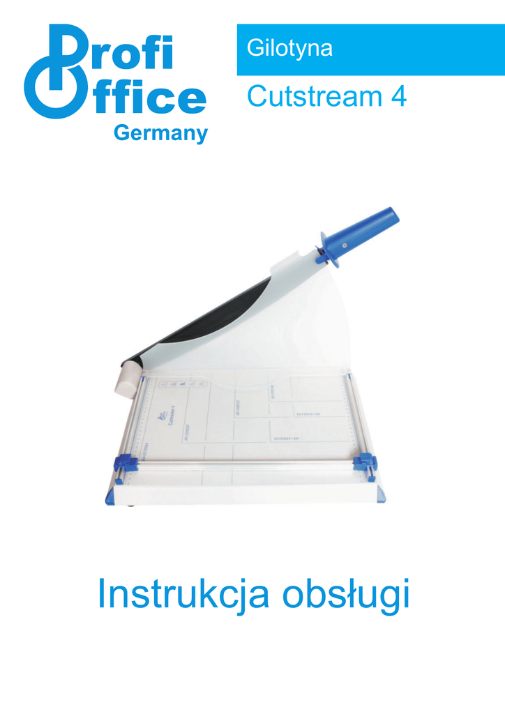 Gilotyna Cutstream 4 Instrukcja obsługi PL Wa¿ne 1. Przy u¿ywaniu gilotyny nale¿y zachowaæ szczególn¹ ostro¿noœæ. 2. Podczas ciêcia nale¿y uwa¿aæ na w³osy, rêce i krawat. 3. Gilotyna nie mo¿e byæ przeznaczona do ciêcia innych materia³ów jak papier i ok³adki PVC. 4. Przed u¿yciem gilotyny nale¿y zamontowaæ do³¹czon¹ szybê ochron¹. (Zobacz rysunek A oraz B, punkt 4 i 11, strona 3) 5. Gdy nie u¿ywany gilotyny ostrze nale¿y pozostawiæ opuszczone. 6. Gdy podczas pracy zauwa¿ymy, ¿e ostrze zaczyna siê wyrabiaæ, (chodzi na boki) dokrêæ œrubê dociskow¹ (9) oraz (10). Czêœci 1. Szyba ochronna 2. Element dociskowy 3. Ramiê ostrza 4. Œruba 5. Skala 6. Przesuwana linijka 7. Ostrze 8. Kontr ostrze 9./10. Œruba dociskowa 11. Uchwyt Monta¿ gilotyny Nale¿y odkrêciæ dwie œruby z elementu dociskowego (2) oraz usuñ folie zabezpieczaj¹c¹ szybê ochronn¹ (1).Ustaw szybê ochron¹ pomiêdzy elementem dociskowym a ramieniem ostrza (3). Nastêpnie przykrêæ dwie œruby (4). Nie nale¿y zbyt mocno przykrêcaæ œrub, gdy¿ mo¿na uszkodziæ szybê ochronn¹. Upewnij siê, ¿e szyba ochronna idealnie pasujê do uchwytu (11) ostrza. (Zobacz rysunek A, strona 3) Sposób u¿ycia Gilotyna powinna byæ umieszczona na p³askiej powierzchni z odpowiedni¹ iloœci¹ miejsca aby zapewniæ bezpieczn¹ obs³ugê. Podnieœ ostrze maks. do góry. W³ó¿ dokumenty do ciêcia i ustaw odpowiedni¹ skalê (5) za pomoc¹ przesuwanej linijki (6). Linijka mo¿e byæ dokrêcona. (Zobacz rysunek B, strona 3) Po ustawieniach nale¿y docisn¹æ element dociskowy oraz trzymaæ go podczas ciêcia. 2 PL Konserwacja Ten model nie wymaga przegl¹dów. Jednak¿e zaleca siê przecieranie ostrza (7) oraz kontr ostrza (8) szmatk¹ z odrobin¹ wazeliny. Dane techniczne Szerokoœæ ciêcia: 360 x 3 mm Iloœæ arkuszy: 30 arkuszy (70 g/m2) Wymiary: mm 310x610x420 (sz/d³/wys) Rysunek A 9 10 11 Rysunek B 5 1 6 3 7 4 2 8 3