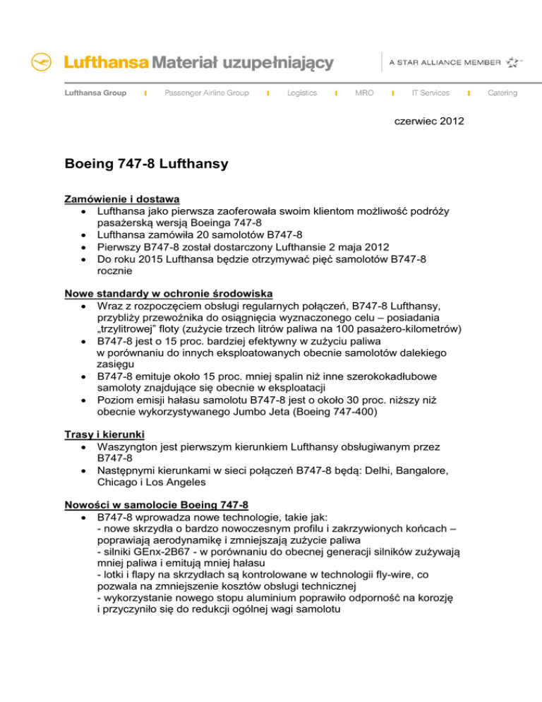 czerwiec 2012 Boeing 747-8 Lufthansy Zamówienie i dostawa Lufthansa jako pierwsza zaoferowała swoim klientom możliwość podróży pasażerską wersją Boeinga 747-8 Lufthansa zamówiła 20 samolotów B747-8 Pierwszy B747-8 został dostarczony Lufthansie 2 maja 2012 Do roku 2015 Lufthansa będzie otrzymywać pięć samolotów B747-8 rocznie Nowe standardy w ochronie środowiska Wraz z rozpoczęciem obsługi regularnych połączeń, B747-8 Lufthansy, przybliży przewoźnika do osiągnięcia wyznaczonego celu – posiadania „trzylitrowej” floty (zużycie trzech litrów paliwa na 100 pasażero-kilometrów) B747-8 jest o 15 proc. bardziej efektywny w zużyciu paliwa w porównaniu do innych eksploatowanych obecnie samolotów dalekiego zasięgu B747-8 emituje około 15 proc. mniej spalin niż inne szerokokadłubowe samoloty znajdujące się obecnie w eksploatacji Poziom emisji hałasu samolotu B747-8 jest o około 30 proc. niższy niż obecnie wykorzystywanego Jumbo Jeta (Boeing 747-400) Trasy i kierunki Waszyngton jest pierwszym kierunkiem Lufthansy obsługiwanym przez B747-8 Następnymi kierunkami w sieci połączeń B747-8 będą: Delhi, Bangalore, Chicago i Los Angeles Nowości w samolocie Boeing 747-8 B747-8 wprowadza nowe technologie, takie jak: - nowe skrzydła o bardzo nowoczesnym profilu i zakrzywionych końcach – poprawiają aerodynamikę i zmniejszają zużycie paliwa - silniki GEnx-2B67 - w porównaniu do obecnej generacji silników zużywają mniej paliwa i emitują mniej hałasu - lotki i flapy na skrzydłach są kontrolowane w technologii fly-wire, co pozwala na zmniejszenie kosztów obsługi technicznej - wykorzystanie nowego stopu aluminium poprawiło odporność na korozję i przyczyniło się do redukcji ogólnej wagi samolotu 2/2 B747-8 jest przedłużoną wersją Boeinga 747-400 (wydłużenie kadłuba o około 5,6m). Dzięki temu samolot jest dłuższy o około 1 m niż Airbus A340-600 i jest najdłuższym pasażerskim samolotem świata B747-8 ma kokpit wykonany w tej samej technologii co Boeing 787. Dzięki temu mogą być wykorzystywane działające już symulatory lotów, a czas potrzebny do szkolenia (w związku z przejściem na inny typ samolotu) jest stosunkowo krótki Dane techniczne B747-8: Długość całego samolotu Rozpiętość skrzydeł Wysokość ogona Powierzchnia skrzydeł Pojemnośc zbiorników na paliwo Predkość przelotowa Maksymalna waga startowa Cena katalogowa 76,3 m 68,7 m 19,4 m 554 m² 242 000 l 0,86 Macha lub 1025 km/h 442 tony 317,5 mln USD --Deutsche Lufthansa AG Corporate Communications Aage Dünhaupt / Klaus Gorny http://media.lufthansa.com Solski Burson-Marsteller Maciej Kałużny tel. (22) 242 86 27 [email protected]
