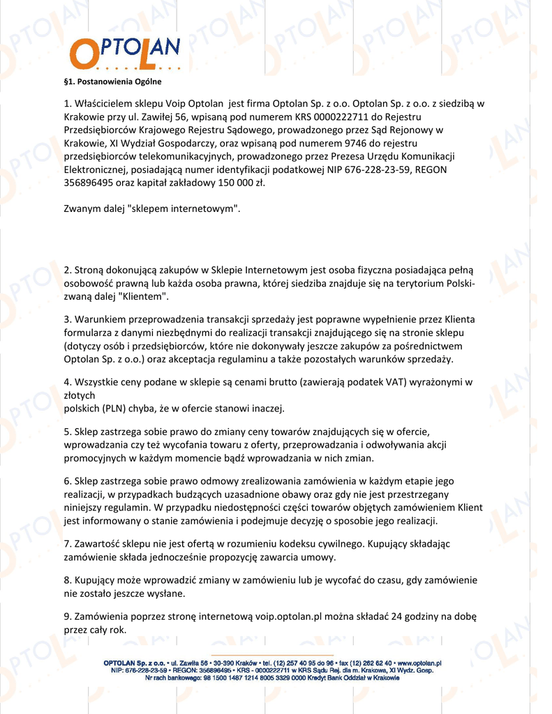 §1. Postanowienia Ogólne 1. Właścicielem sklepu Voip Optolan jest firma Optolan Sp. z o.o. Optolan Sp. z o.o. z siedzibą w Krakowie przy ul. Zawiłej 56, wpisaną pod numerem KRS 0000222711 do Rejestru Przedsiębiorców Krajowego Rejestru Sądowego, prowadzonego przez Sąd Rejonowy w Krakowie, XI Wydział Gospodarczy, oraz wpisaną pod numerem 9746 do rejestru przedsiębiorców telekomunikacyjnych, prowadzonego przez Prezesa Urzędu Komunikacji Elektronicznej, posiadającą numer identyfikacji podatkowej NIP 676-228-23-59, REGON 356896495 oraz kapitał zakładowy 150 000 zł. Zwanym dalej "sklepem internetowym". 2. Stroną dokonującą zakupów w Sklepie Internetowym jest osoba fizyczna posiadająca pełną osobowość prawną lub każda osoba prawna, której siedziba znajduje się na terytorium Polskizwaną dalej "Klientem". 3. Warunkiem przeprowadzenia transakcji sprzedaży jest poprawne wypełnienie przez Klienta formularza z danymi niezbędnymi do realizacji transakcji znajdującego się na stronie sklepu (dotyczy osób i przedsiębiorców, które nie dokonywały jeszcze zakupów za pośrednictwem Optolan Sp. z o.o.) oraz akceptacja regulaminu a także pozostałych warunków sprzedaży. 4. Wszystkie ceny podane w sklepie są cenami brutto (zawierają podatek VAT) wyrażonymi w złotych polskich (PLN) chyba, że w ofercie stanowi inaczej. 5. Sklep zastrzega sobie prawo do zmiany ceny towarów znajdujących się w ofercie, wprowadzania czy też wycofania towaru z oferty, przeprowadzania i odwoływania akcji promocyjnych w każdym momencie bądź wprowadzania w nich zmian. 6. Sklep zastrzega sobie prawo odmowy zrealizowania zamówienia w każdym etapie jego realizacji, w przypadkach budzących uzasadnione obawy oraz gdy nie jest przestrzegany niniejszy regulamin. W przypadku niedostępności części towarów objętych zamówieniem Klient jest informowany o stanie zamówienia i podejmuje decyzję o sposobie jego realizacji. 7. Zawartość sklepu nie jest ofertą w rozumieniu kodeksu cywilnego. Kupujący składając zamówienie składa jednocześnie propozycję zawarcia umowy. 8. Kupujący może wprowadzić zmiany w zamówieniu lub je wycofać do czasu, gdy zamówienie nie zostało jeszcze wysłane. 9. Zamówienia poprzez stronę internetową voip.optolan.pl można składać 24 godziny na dobę przez cały rok. 10. Firma Optolan Sp. z o.o. dokłada wszelkich starań, aby opisy i dane techniczne umieszczonych w sklepie produktów były zgodne z rzeczywistością. Nie ponosimy jednak odpowiedzialności za błędne podanie parametrów i właściwości towaru, lub nagłą ich zmianę przez producenta. Różnica w wyglądzie produktu na zdjęciu umieszczonym na stronie internetowej i rzeczywistym wyglądem produktu nie może być podstawą roszczeń Klienta. Niemniej, w każdym przypadku, gdy dane prezentowane na witrynie internetowej sklepu w dniu złożenia przez klienta zamówienia nie pokrywałyby się z rzeczywistością, w ciągu 10 dni od daty zakupu klient ma prawo odstąpienia od umowy bez podania przyczyn. § 2. Potwierdzenie zamówienia 1. Warunkiem realizacji zamówienia jest podanie numeru telefonu w celu weryfikacji rzetelności złożonego zamówienia. Potwierdzenie zamówienia może zostać dokonane telefonicznie lub pocztą elektroniczną. 2. Zamówienie może zostać anulowane w przypadku braku możliwości potwierdzenia telefonicznego lub braku odpowiedzi na potwierdzenie wysłane pocztą e-mail w ciągu 7 dni roboczych od dnia złożenia zamówienia. 3. Sklep zastrzega sobie możliwość odmowy realizacji zamówienia, ograniczenia sposobu płatności lub zażądania przedpłaty w uzasadnionych przypadkach. § 3. Formy płatności 1. Klient może wybrać jeden z poniższych sposobów płatności: • PRZELEW NA RACHUNEK BANKOWY - Klient wpłaca całkowitą wartość zamówienia na numer konta bankowego, który jest podany w momencie składania zamówienia. Towar wysyłamy po wpłynięciu kwoty na rachunek. 2. W przypadku stwierdzenia braku wpłaty w przeciągu miesiąca od złożenia zamówienia zostanie one anulowane bez powiadamiania Klienta o zaistniałym fakcie. 3. W uzasadnionych przypadkach dotyczących np. zamówienia o bardzo dużej wartości, odroczenie wysyłki i magazynowania towaru czy też produktów tylko na zamówienie może być wymagana przedpłata. Wysokość przedpłaty jest ustalana indywidualnie. 4. Optolan Sp. z o.o. może ustalić z klientem inne, szczególne warunki i formy płatności. W takim wypadku obowiązują warunki i formy płatności wskazane z zamówieniu potwierdzonym przez Optolan Sp. z o.o. jako przyjęte do realizacji i spełnienia wszelkich dodatkowych wymogów związanych z uzgodnionymi warunkami lub formą płatności (m.in. sprzedaż na raty). § 4. Termin realizacji 1. Czas realizacji zamówienia jest to czas od potwierdzenia zamówienia do chwili wysłania przesyłki do klienta, przy czym uwzględniane są tylko dni robocze. 2. Czas realizacji zamówienia jest zależny od dostępności danego produktu w naszych magazynach lub w magazynach producentów. 3. Zamówienie złożone z produktów o różnym czasie realizacji jest wysyłane po skompletowaniu całości. 4. Zastrzegamy sobie prawo wydłużenia czasu realizacji w przypadku chwilowego braku towaru na magazynie. O takim przypadku klient każdorazowo jest informowany, pocztą elektroniczną lub telefonicznie. 5. Czas otrzymania przesyłki składa się z czasu realizacji zamówienia i czasu dostawy. Czas dostawy jest zależny od formy wybranego sposobu dostarczenia towaru. § 5. Dostawa towaru 1. Prowadzimy sprzedaż tylko na terenie Polski. Warunki sprzedaży detalicznej i wysyłki towaru za granicę są uzgadniane indywidualnie z klientem. 2. Orientacyjne wartości opłat są wyliczane automatycznie w momencie składania zamówienia i są uzależnione od formy wyboru dostawy oraz płatności. 3. Opłata za niektóre przesyłki wielkogabarytowe, składające się z wielu p