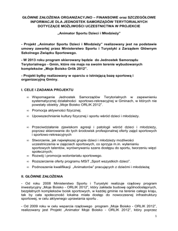 GŁÓWNE ZAŁOŻENIA ORGANIZACYJNO – FINANSOWE oraz SZCZEGÓŁOWE INFORMACJE DLA JEDNOSTEK SAMORZĄDÓW TERYTORIALNYCH DOTYCZĄCE MOŻLIWOŚCI UCZESTNICTWA W PROJEKCIE „Animator Sportu Dzieci i Młodzieży” - Projekt „Animator Sportu Dzieci i Młodzieży” realizowany jest na podstawie umowy zawartej przez Ministerstwo Sportu i Turystyki z Zarządem Głównym Szkolnego Związku Sportowego. - W 2013 roku program skierowany będzie do Jednostek Samorządu Terytorialnego - Gmin, które nie maja na swoim terenie wybudowanych kompleksów „Moje Boisko Orlik 2012”. - Projekt byłby realizowany w oparciu o istniejącą bazę sportową i organizacyjną Gminy. I. CELE I ZADANIA PROJEKTU • Wspomaganie Jednostek Samorządów Terytorialnych w zapewnieniu systematycznej działalności sportowo-rekreacyjnej w Gminach, w których nie powstały obiekty „Moje Boisko ORLIK 2012”. • Promocja aktywności fizycznej. • Upowszechnianie kultury fizycznej i sportu wśród dzieci i młodzieży. • Przeciwdziałanie zjawiskom agresji i patologii wśród dzieci i młodzieży, poprzez skierowanie do tych środowisk profesjonalnej oferty zajęć sportowych i sportowo-rekreacyjnych • • Stworzenie, jak największej grupie dzieci i młodzieży możliwości uczestniczenia w zajęciach sportowych, co sprzyja m.in. wyłanianiu sportowych talentów, wyrównywaniu szans dostępu do sportu, tworzeniu więzi społecznych; Rozwój i promocja wolontariatu sportowego. • Rozszerzenie oferty programu MSiT „Sport wszystkich dzieci”. • Podnoszenie kwalifikacji „Animatorów” pracujących z dziećmi i młodzieżą; II. GŁÓWNE ZAŁOŻENIA - Od roku 2008 Ministerstwo Sportu i Turystyki realizuje rządowy program inwestycyjny „Moje Boisko - ORLIK 2012”, który zakłada budowę ogólnodostępnych, bezpłatnych kompleksów boisk sportowych, w każdej gminie na terenie całego kraju, tak by cała społeczność lokalna miała dostęp do nowoczesnej infrastruktury sportowej, w celu aktywnego uprawiania sportu . - Od 2009 roku w celu wsparcia rządowego program „Moje Boisko - ORLIK 2012”, realizowany jest Projekt „Animator Moje Boisko - ORLIK 2012”, który poprzez 1 dofinansowanie ze środków MSiT dopuszcza możliwość zatrudnienia animatorów na obiekcie. - W 2013 roku Ministerstwo Sportu i Turystyki w oparciu o istniejącą bazę sportową i organizacyjną gmin pragnie zrealizować projekt „Animator Sportu Dzieci i Młodzieży”, który polega na udziale finansowym Ministerstwa Sportu i Turystyki w pokryciu kosztów zatrudnienia „Animatora” - osoby inicjującej, organizującej oraz prowadzącej systematyczne zajęcia i imprezy sportowe na obiektach sportowych w gminie, która nie ma na swoim terenie kompleksu sportowego „Moje Boisko – ORLIK 2012”. W zależności od potrzeb i możliwości finansowych, organizacyjnych i środowiskowych w tych gminach planowana jest organizacja zajęć sportowych, rekreacyjnych lub turystycznych, na obiektach sportowych samorządu, przez animatora, którym może być nauczyciel wf, trener lub instruktor, który spełnia stawiane wymogi formalno-prawne. - Zorganizowane i przeprowadzone w ramach programu zajęcia przyczynią się do aktywnego udziału młodzieży w ogólnodostępnych zajęciach sportowych; będą tworzyły modę na sportowy tryb życia i dadzą szansę na rozwój talentów sportowych. - Wynagrodzenie osoby zatrudnionej jako "Animator" w ramach projektu „Animator Sportu Dzieci i Młodzieży” składać się będzie z zadeklarowanej części wypłacanej przez właściwą JST oraz z części wypłacanej przez W SZS w ramach dotacji z MSiT. UCZESTNICY– ADRESACI PROGRAMU - Nauczyciele wychowania fizycznego, instruktorzy, trenerzy, pracujący z dziećmi i młodzieżą w ramach prowadzonych zajęć pozalekcyjnych i pozaszkolnych posiadający do tego uprawnienia. III. ŹRÓDŁO FINANSOWANIA Projekt finansowany jest ze środków państwowego Funduszu Rozwoju Kultury Fizycznej przeznaczonych na realizację zadań z zakresu rozwijania sportu dzieci i młodzieży, których przeznaczenie i wydatkowanie określa rozporządzenia Ministra Sportu z dnia 23 sierpnia 2010 r.w sprawie dofinansowania zadań ze środków Funduszu Rozwoju Kultury Fizycznej (Dz. U. Nr 156, poz. 1051). Dysponentem środków Funduszu Rozwoju Kultury Fizycznej jest Minister Sportu i Turystyki jako Minister właściwy ds. kultury fizycznej, na podstawie ustawy z dnia 19 listopada 2009 r. o grach hazardowych /Dz. U. Nr 201, poz. 1540 oraz z 2010 r. Nr 127, poz. 857/ 2 IV. PODMIOTY UCZESTNICZĄCE W REALIZACJI PROJEKTU 1.Ministerstwo Sportu i Turystyki; 2. Zarząd Główny Szkolnego Związku Sportowego i Wojewódzkie Szkolne Związki Sportowe współorganizator i koordynator realizacji zadań w ramach projektu, na podstawie umowy z Ministerstwem Sportu i Turystyki; 3. Jednostki samorządu terytorialnego (gminy) w, których nie powstały obiekty „Moje Boisko ORLIK 2012”. V. ZASADY REALIZACJI . 1. Ministerstwo Sportu i Turystyki planuje w 2013 roku realizację projektu „Animator Sportu Dzieci i Młodzieży” na bazie gminnych obiektów sportowych – ( poza kompleksami „Moje Boisko – ORLIK 2012”) ; 2. Projekt polega na udziale finansowym Ministerstwa Sportu i Turystyki w pokryciu kosztów zatrudnienia „Animatora” - osoby inicjującej, organizującej oraz prowadzącej systematyczne zajęcia i imprezy sportowe na obiektach sportowych w gminie; 3. Zgodnie z zasadami ogłoszonego przez MSiT konkursu na dofinansowanie zadań realizowanych w 2013r., projekt „Animator Sportu Dzieci i Młodzieży” może być realizowany w okresie od 1 marca do 30 czerwca i 1 września do 30 listopada 2013r., w wymiarze maksymalnie 7 miesięcy w 2013 roku; 4. Jednostka Samorządu Terytorialnego (JST – gmina) może zgłosić jedną osobę, przypisaną do swojej gminy, która posiada odpowiednie kwalifikacje do organizowania i prowadzenia zajęć sportowych. 5. Wynagrodzenie oso