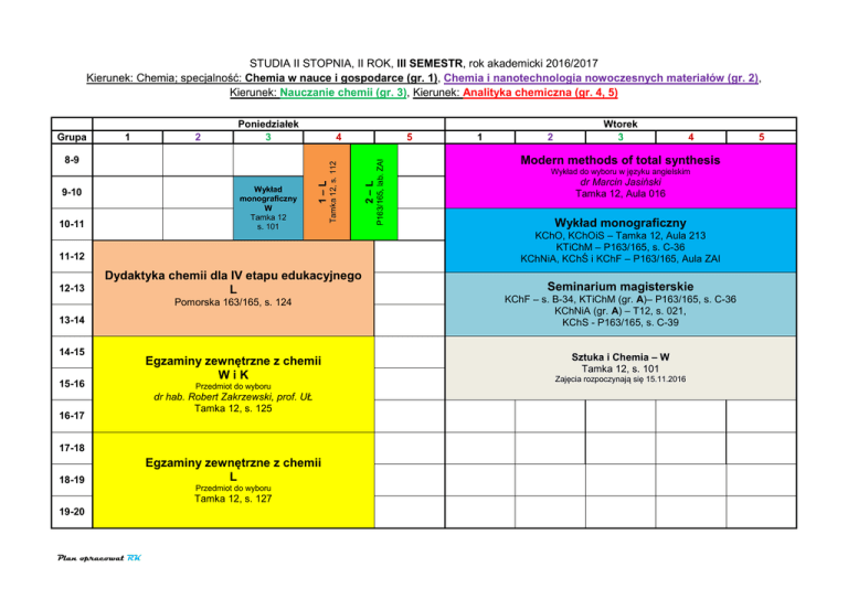 STUDIA II STOPNIA, II ROK, III SEMESTR, rok akademicki 2016/2017 Kierunek: Chemia; specjalność: Chemia w nauce i gospodarce (gr. 1), Chemia i nanotechnologia nowoczesnych materiałów (gr. 2), Kierunek: Nauczanie chemii (gr. 3), Kierunek: Analityka chemiczna (gr. 4, 5) Poniedziałek 3 4 Wykład monograficzny W Tamka 12 s. 101 9-10 10-11 1–L 8-9 11-12 12-13 Dydaktyka chemii dla IV etapu edukacyjnego L 15-16 16-17 Plan opracował RK Wtorek 3 4 Modern methods of total synthesis Wykład do wyboru w języku angielskim dr Marcin Jasiński Tamka 12, Aula 016 Wykład monograficzny KChO, KChOiS – Tamka 12, Aula 213 KTiChM – P163/165, s. C-36 KChNiA, KChŚ i KChF – P163/165, Aula ZAI Seminarium magisterskie Egzaminy zewnętrzne z chemii WiK Sztuka i Chemia – W Tamka 12, s. 101 Przedmiot do wyboru dr hab. Robert Zakrzewski, prof. UŁ Tamka 12, s. 125 Egzaminy zewnętrzne z chemii L Przedmiot do wyboru Tamka 12, s. 127 19-20 2 Pomorska 163/165, s. 124 17-18 18-19 1 KChF – s. B-34, KTiChM (gr. A)– P163/165, s. C-36 KChNiA (gr. A) – T12, s. 021, KChS - P163/165, s. C-39 13-14 14-15 5 2–L 2 P163/165, lab. ZAI 1 Tamka 12, s. 112 Grupa Zajęcia rozpoczynają się 15.11.2016 5 STUDIA II STOPNIA, II ROK, III SEMESTR, rok akademicki 2016/2017 Kierunek: Chemia; specjalność: Chemia w nauce i gospodarce (gr. 1), Chemia i nanotechnologia nowoczesnych materiałów (gr. 2), Kierunek: Nauczanie chemii (gr. 3), Kierunek: Analityka chemiczna (gr. 4, 5) 10-11 2 Czwartek 3 Seminarium magisterskie Chemia środowiska W Przedmiot do wyboru Chemia środowiska L – gr. 1 12-13 Przedmiot do wyboru Tamka 12, s. 112 13-14 Podstawy analizy kryminalistycznej i sądowej – W Chemia środowiska K dr Sylwia Smarzewska P163/165 – Aula ZAI Tamka 12, s. 101 Przedmiot do wyboru 14-15 15-16 16-17 Sztuka pisania - W + K Tamka 12, Aula 016 Konwersatorium – pierwsze zajęcia: (gr. A – 05.10.2016; gr. B - 12.10.2016, gr. C – termin zostanie ustalony na pierwszym wykładzie) 17-18 18-19 19-20 Plan opracował RK 5 KTiChM (gr. B)– P163/165, s. C-37, KChNiA (gr. B) – T12, s. 125, KChNiA (gr. C) – P163/165, s. C-36, KChOiS – T12, s. 021, KChO – T12, Aula 213 dr Barbara Krawczyk Tamka 12, s. 101 11-12 4 1–L 9-10 1 Tamka 12, s. 112 2–L 8-9 5 2–L 4 P163/165, lab. ZAI Środa 3 1–L 2 Tamka 12, s. 112 1 P163/165, lab. ZAI Grupa Chemia środowiska L - gr. 2 Przedmiot do wyboru Tamka 12, s. 112 STUDIA II STOPNIA, II ROK, III SEMESTR, rok akademicki 2016/2017 Kierunek: Chemia; specjalność: Chemia w nauce i gospodarce (gr. 1), Chemia i nanotechnologia nowoczesnych materiałów (gr. 2), Kierunek: Nauczanie chemii (gr. 3), Kierunek: Analityka chemiczna (gr. 4, 5) Grupa 1 2 Piątek 3 4 Uwagi Egzaminy 5 8-9 Chemia w nauce i gospodarce 1. Wykład do wyboru w języku angielskim 9-10 Chemia i nanotechnologia nowoczesnych materiałów 1. Wykład do wyboru w języku angielskim Praktyki pedagogiczne 10-11 Pomorska 163/165, s. 124 11-12 12-13 Dydaktyka chemii dla IV etapu edukacyjnego - K 13-14 Pomorska 163/165, - s. 124 Chemia nauczycielska 1. Wykład do wyboru w języku angielskim Chemia analityczna 1. Wykład do wyboru w języku angielskim 2. Podstawy analizy kryminalistycznej i sądowej – dr Sylwia Smarzewska 3. Monitoring i ocena środowiska II – dr Ewa Miękoś Z pozostałych składowych przedmiotu obowiązują zaliczenia! Oznaczenia i skróty 14-15 Modern structural chemistry Wykład do wyboru w języku angielskim 15-16 16-17 17-18 18-19 19-20 Plan opracował RK dr Agnieszka Rybarczyk-Pirek Pomorska 163/165, s. C-40 1 – Monitoring i ocena środowiska II 2 – Podstawy analizy kryminalistycznej i sądowej W – wykład K – konwersatorium L – laboratorium P 163/165 – Pomorska 163/165 T 12 – Tamka 12 UWAGA!!! Osoby, które realizują jednocześnie program kierunków Analityka chemiczna i Nauczanie chemii zapisują się do grupy 4