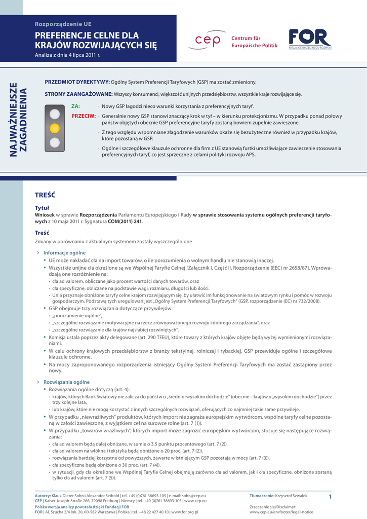Rozporządzenie UE PREFERENCJE CELNE DLA KRAJÓW ROZWIJAJĄCYCH SIĘ Analiza z dnia 4 lipca 2011 r. NAJWAŻNIEJSZE ZAGADNIENIA PRZEDMIOT DYREKTYWY: Ogólny System Preferencji Taryfowych (GSP) ma zostać zmieniony. STRONY ZAANGAŻOWANE: Wszyscy konsumenci, większość unijnych przedsiębiorstw, wszystkie kraje rozwijające się. ZA: ∙ Nowy GSP łagodzi nieco warunki korzystania z preferencyjnych taryf. PRZECIW: ∙ Generalnie nowy GSP stanowi znaczący krok w tył – w kierunku protekcjonizmu. W przypadku ponad połowy państw objętych obecnie GSP preferencyjne taryfy zostaną bowiem zupełnie zawieszone. ∙ Z tego względu wspomniane złagodzenie warunków okaże się bezużyteczne również w przypadku krajów, które pozostaną w GSP. ∙ Ogólne i szczegółowe klauzule ochronne dla firm z UE stanowią furtki umożliwiające zawieszenie stosowania preferencyjnych taryf, co jest sprzeczne z celami polityki rozwoju APS. TREŚĆ Tytuł Wniosek w sprawie Rozporządzenia Parlamentu Europejskiego i Rady w sprawie stosowania systemu ogólnych preferencji taryfowych z 10 maja 2011 r. Sygnatura COM(2011) 241. Treść Zmiany w porównaniu z aktualnym systemem zostały wyszczególnione ›› Informacje ogólne • UE może nakładać cła na import towarów, o ile porozumienia o wolnym handlu nie stanowią inaczej. • Wszystkie unijne cła określone są we Wspólnej Taryfie Celnej [Załącznik I, Część II, Rozporządzenie (EEC) nr 2658/87]. Wprowadzają one rozróżnienie na: • cła ad valorem, obliczane jako procent wartości danych towarów, oraz • cła specyficzne, obliczane na podstawie wagi, rozmiaru, długości lub ilości. • Unia przyznaje obniżone taryfy celne krajom rozwijającym się, by ułatwić im funkcjonowanie na światowym rynku i pomóc w rozwoju gospodarczym. Podstawą tych uregulowań jest „Ogólny System Preferencji Taryfowych” (GSP, rozporządzenie (EC) nr 732/2008). • GSP obejmuje trzy rozwiązania dotyczące przywilejów: • „porozumienie ogólne”, • „szczególne rozwiązanie motywacyjne na rzecz zrównoważonego rozwoju i dobrego zarządzania”, oraz • „szczególne rozwiązanie dla krajów najsłabiej rozwiniętych”. • Komisja ustala poprzez akty delegowane (art. 290 TFEU), które towary z których krajów objęte będą wyżej wymienionymi rozwiązaniami. • W celu ochrony krajowych przedsiębiorstw z branży tekstylnej, rolniczej i rybackiej, GSP przewiduje ogólne i szczegółowe klauzule ochronne. • Na mocy zaproponowanego rozporządzenia istniejący Ogólny System Preferencji Taryfowych ma zostać zastąpiony przez nowy. ›› Rozwiązania ogólne • Rozwiązania ogólne dotyczą (art. 4): • krajów, których Bank Światowy nie zalicza do państw o „średnio-wysokim dochodzie” (obecnie – krajów o „wysokim dochodzie”) przez trzy kolejne lata, • lub krajów, które nie mogą korzystać z innych szczególnych rozwiązań, oferujących co najmniej takie same przywileje. • W przypadku „niewrażliwych” produktów, których import nie zagraża europejskim wytwórcom, wspólne taryfy celne pozostaną w całości zawieszone, z wyjątkiem ceł na surowce rolne (art. 7 (1)). • W przypadku „towarów wrażliwych”, których import może zagrozić europejskim wytwórcom, stosuje się następujące rozwiązania: • cła ad valorem będą dalej obniżane, w sumie o 3,5 punktu procentowego (art. 7 (2)). • cła ad valorem na włókna i tekstylia będą obniżone o 20 proc. (art. 7 (2)). • rozwiązania bardziej korzystne od powyższych, zawarte w istniejącym GSP pozostają w mocy (art. 7 (3)). • cła specyficzne będą obniżone o 30 proc. (art. 7 (4)). • w sytuacji, gdy cła określone we Wspólnej Taryfie Celnej obejmują zarówno cła ad valorem, jak i cła specyficzne, obniżone zostaną tylko cła ad valorem (art. 7 (5)). Autorzy: Klaus-Dieter Sohn i Alexander Seibold | tel. +49 (0)761 38693-105 | e-mail: [email protected] CEP | Kaiser-Joseph-Straße 266, 79098 Freiburg | Niemcy | tel. +49 (0)761 38693-105 | www.cep.eu Polska wersja analizy powstała dzięki Fundacji FOR FOR | Al. Szucha 2/4 lok. 20, 00-582 Warszawa | Polska | tel. +48 22 427 40 10 | www.for.org.pl Tłumaczenie: Krzysztof Szwałek Zrzeczenie się/Disclaimer: www.cep.eu/en/footer/legal-notice 1 Rozporządzenie UE PREFERENCJE CELNE DLA KRAJÓW ROZWIJAJĄCYCH SIĘ Analiza z dnia 4 lipca 2011 r. • Jeśli udziały rynkowe towarów pochodzących z krajów-beneficjentów GSP przez trzy kolejne lata będą przekraczać 17,5 proc. (obecnie 15 proc.), preferencyjna taryfa celna na dany produkt pochodzący z określonego kraju zostanie zniesiona. W przypadku włókien i tekstyliów wskaźnik wynosić będzie 14,5 proc. (obecnie 12,5 proc.) (art. 8 (1) w połączeniu z załącznikiem VI). ›› Szczególne rozwiązanie motywacyjne na rzecz zrównoważonego rozwoju i dobrego zarządzania • Rozwiązanie „GSP+” może zostać zastosowane na wniosek państw rozwijających się (art. 10 (1) lit. a), w przypadku gdy: • dane państwo kwalifikuje się do objęcia porozumieniem ogólnym, • więcej niż 75 proc. importu z danego kraju w ciągu trzech ostatnich lat stanowiły dobra z siedmiu (obecnie z pięciu) grup produktów. • udział importu z danego kraju nie przekracza 2 proc. (obecnie: 1 proc.) ogółu importu z krajów-beneficjentów GSP (art. 9 (1) z połączeniu z załącznikiem VII) oraz • państwo ratyfikowało stosowne konwencje międzynarodowe (załącznik VIII, część A), w szczególności dotyczące praw człowieka i praw pracowniczych oraz związane z ochroną środowiska, a także obiecało utrzymać ratyfikacje oraz zezwolić na monitorowanie stosowania konwencji (art. 9 (1 lit. b i c). • Zawiesza się cła ad valorem oraz cła specyficzne na towary (wymienione w załączniku IX) z krajów objętych systemem GSP+. Jeśli na dany towar nałożone zostały zarówno cła ad valorem, jak i cła specyficzne, zawieszone z