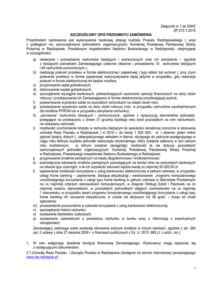Załącznik nr 1 do SIWZ ZP.272.1.2015 SZCZEGÓŁOWY OPIS PRZEDMIOTU ZAMÓWIENIA Przedmiotem zamówienia jest wykonywanie bankowej obsługi budżetu Powiatu Radziejowskiego ( wraz z podległymi mu samorządowymi jednostkami organizacyjnymi, Komendą Powiatową Państwowej Straży Pożarnej w Radziejowie, Powiatowym Inspektoratem Nadzoru Budowlanego w Radziejowie), obejmującej w szczególności: a) otwieranie i prowadzenie rachunków bieżących i pomocniczych oraz ich zamykanie – zgodnie z bieżącymi potrzebami Zamawiającego (obecnie otwarcie i prowadzenie 15 rachunków bieżących i 64 rachunków pomocniczych ); b) realizację poleceń przelewu w formie elektronicznej i papierowej ( typu eliksir lub sorbnet ), przy czym polecenia przelewu w formie papierowej wykorzystywane będą jedynie w przypadku, gdy realizacja poleceń w formie elektronicznej nie będzie możliwa; c) przyjmowanie wpłat gotówkowych; d) dokonywanie wypłat gotówkowych; e) sporządzanie wyciągów bankowych, potwierdzających wykonanie operacji finansowych na dany dzień roboczy i przekazywanie ich Zamawiającemu w formie elektronicznej umożliwiającej wydruk; f) potwierdzanie wysokości salda na wszystkich rachunkach na ostatni dzień roku; g) potwierdzanie wysokości salda na dany dzień roboczy (min. w przypadku rachunków wyodrębnionych dla środków PFRON lub w przypadku zamykania rachunku); h) „zerowanie” rachunków bieżących i pomocniczych, zgodnie z dyspozycją kierowników jednostek, polegające na przekazaniu z dniem 31 grudnia każdego roku kwot pozostałych na w/w rachunkach, na wskazany rachunek; i) możliwość uruchomienia kredytu w rachunku bieżącym do wysokości określonej corocznie w stosownej uchwale Rady Powiatu w Radziejowie ( w 2015 r. do kwoty 1 500 000,- zł ( słownie: jeden milion pięćset tysięcy złotych ), zabezpieczonego wekslem in blanco, służącego do pokrycia występującego w ciągu roku deficytu budżetu jednostki samorządu terytorialnego, który zostanie spłacony w tym samym roku budżetowym, w którym zostanie zaciągnięty; możliwość ta nie dotyczy pozostałych samorządowych jednostek organizacyjnych, Komendy Powiatowej Państwowej Straży Pożarnej w Radziejowie, Powiatowego Inspektoratu Nadzoru Budowlanego w Radziejowie; j) przyjmowanie środków pieniężnych na lokaty długoterminowe i krótkoterminowe; k) automatyczne lokowanie środków pieniężnych pozostających na koniec dnia na rachunkach bankowych na lokacie typu overnight, o ile ich wysokość stanowić będzie kwotę co najmniej 50 000,00 zł; l) zapewnienie możliwości korzystania z usług bankowości elektronicznej w pełnym zakresie; w przypadku usługi home banking – zapewnienie, bieżącą aktualizację i serwisowanie programu komputerowego umożliwiającego korzystanie z usługi typu home banking w pełnym zakresie w Starostwie Powiatowym na co najmniej czterech stanowiskach komputerowych, w Zespole Obsługi Szkół i Placówek na co najmniej sześciu stanowiskach, w pozostałych jednostkach objętych zamówieniem na co najmniej 1 stanowisku; w przypadku awarii programu komputerowego umożliwiającego korzystanie z usługi typu home banking ich usuwanie niezwłocznie, w czasie nie dłuższym niż 36 godz. – licząc od chwili zgłoszenia; m) przeszkolenie pracowników w zakresie korzystania z usług bankowości elektronicznej; n) sporządzanie historii rachunku; o) wydawanie blankietów czekowych; p) wystawianie zaświadczeń o posiadaniu rachunku w banku wraz z informacją o ewentualnych obciążeniach; Zamawiający zastrzega sobie swobodę lokowania wolnych środków w innych bankach, zgodnie z art. 264 ust. 2 ustawy z dnia 27 sierpnia 2009 r. o finansach publicznych ( Dz. U. 2013. 885 j.t. z późn. zm.). 1. W celu wstępnego zbadania kondycji finansowej Zamawiającego, Wykonawcy mogą zapoznać się z następującymi dokumentami: 2.1.Uchwały Rady Powiatu i Zarządu Powiatu w Radziejowie (dostępne na stronie internetowej zamawiającego www.bip.radziejow.pl : 1 a) Uchwała nr 331/2014 Zarządu Powiatu w Radziejowie z dnia 14 listopada 2014 roku w sprawie przyjęcia projektu budżetu Powiatu Radziejowskiego na rok 2015 oraz projektu Wieloletniej Prognozy Finansowej Powiatu Radziejowskiego na lata 2015 – 2026. 2.2. Sprawozdania budżetowe: a) Rb- Z – kwartalne sprawozdanie o stanie zobowiązań wg tytułów dłużnych oraz poręczeń i gwarancji Powiatu Radziejowskiego na koniec III kwartału 2014 roku. b) Rb-N – kwartalne sprawozdanie o stanie należności oraz wybranych aktywów finansowych na koniec III kwartału 2014 roku. c) RB-NDS kwartalne sprawozdanie o nadwyżce / deficycie jednostki samorządu terytorialnego od początku roku do 30 września 2014 roku d) Rb-27S sprawozdanie z wykonania planu dochodów budżetowych j.s.t. od początku roku do dnia 30 września 2014 roku. zbiorczo e) Rb-28S sprawozdanie z wykonania planu wydatków budżetowych j.s.t. od początku roku do dnia 30 września 2014 roku . zbiorczo. 2.3. Inne dokumenty: a) Uchwała Nr 5/I/2014 Składu Orzekającego Nr 10 Regionalnej Izby Obrachunkowej w Bydgoszczy z dnia 15 września 2014 r. w sprawie wyrażenia opinii o przedłożonej przez Zarząd Powiatu Radziejowskiego informacji o przebiegu wykonania budżetu Powiatu Radziejowskiego za pierwsze półrocze 2014 roku. 3. Jednostki objęte zamówieniem: a) Dom Pomocy Społecznej w Piotrkowie Kujawskim ul. Poznańska 98 88-230 Piotrków Kujawski; b) Zespół Obsługi Szkół i Placówek ul. Kościuszki 20/22 88-200 Radziejów; c) Zespół Szkół Mechanicznych w Radziejowie ul. Kościuszki 58 88-200 Radziejów d) Zespół Szkół i Placówek w Radziejowie ul. Szkolna 12 88-200 Radziejów e) Zespół Szkół Rolnicze Centrum Kształcenia Ustawicznego w Przemystce 88-200 Radziejów f) Szkoła Muzyczna I Stopnia ul. Dolna 20 88-200 Radziejów g) Poradnia Psychologiczno – Pedagogiczna ul. Szkolna 12 88-200 Radziejów Jednostki wymienione w poz. c – g 