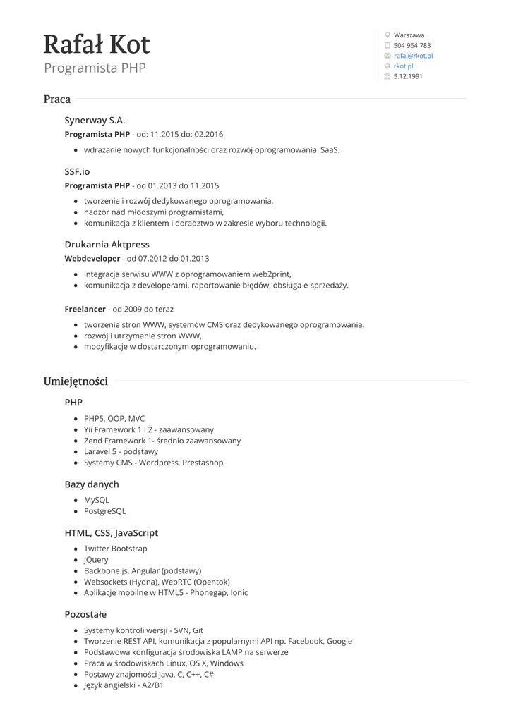 Rafał Kot Programista PHP Praca Synerway S.A. Programista PHP - od: 11.2015 do: 02.2016 wdrażanie nowych funkcjonalności oraz rozwój oprogramowania SaaS. SSF.io Programista PHP - od 01.2013 do 11.2015 tworzenie i rozwój dedykowanego oprogramowania, nadzór nad młodszymi programistami, komunikacja z klientem i doradztwo w zakresie wyboru technologii. Drukarnia Aktpress Webdeveloper - od 07.2012 do 01.2013 integracja serwisu WWW z oprogramowaniem web2print, komunikacja z developerami, raportowanie błędów, obsługa e-sprzedaży. Freelancer - od 2009 do teraz tworzenie stron WWW, systemów CMS oraz dedykowanego oprogramowania, rozwój i utrzymanie stron WWW, modyfikacje w dostarczonym oprogramowaniu. Umiejętności PHP PHP5, OOP, MVC Yii Framework 1 i 2 - zaawansowany Zend Framework 1- średnio zaawansowany Laravel 5 - podstawy Systemy CMS - Wordpress, Prestashop Bazy danych MySQL PostgreSQL HTML, CSS, JavaScript Twitter Bootstrap jQuery Backbone.js, Angular (podstawy) Websockets (Hydna), WebRTC (Opentok) Aplikacje mobilne w HTML5 - Phonegap, Ionic Pozostałe Systemy kontroli wersji - SVN, Git Tworzenie REST API, komunikacja z popularnymi API np. Facebook, Google Podstawowa konfiguracja środowiska LAMP na serwerze Praca w środowiskach Linux, OS X, Windows Postawy znajomości Java, C, C++, C# Język angielski - A2/B1 Warszawa 504 964 783 ✉ [email protected] rkot.pl 5.12.1991 Edukacja Informatyka Uniwersytet Przyrodniczo-Humanistyczny w Siedlcach 2013 - obecnie Certyfikaty Bezpieczeństwo aplikacji opartych o PHP Vavatech 2015 14 godzin w tym wykłady i warsztaty praktyczne. Wybrane projekty BlueVendo.pl Opis: System obsługi rezerwacji wycieczek oraz zarządzania firmą i ofertą dla branży turystycznej. Zakres prac: rozwój aplikacji o nowe funkcjonalności oraz bieżące wymagania klientów. Zdobyte doświadczenie: praca w metodyce Scrum, baza danych PostgreSQL, oprogramowanie SaaS. Telemedi.co Opis: Platforma do przeprowadzania konsultacji medycznych online za pomocą czatu video, audio lub wiadomości tekstowych. Zakres prac: stworzenie systemu konsultacji oraz API dla aplikacji mobilnych. Zdobyte doświadczenie: obsługa komunikacji real-time za pomocą websockets. Przewodnik Magdy Gessler Opis: Aplikacja mobilna będą interaktywną wersją książki "101 najlepszych restauracji i hoteli w Polsce – przewodnik 2014/2015". Zakres prac: stworzenie hybrydowej aplikacji na platformy Android, iOS i WP. Zdobyte doświadczenie: tworzenie hybrydowych aplikacji moblinych za pomocą Phonegap. Legionowo czasów wojny Opis: Mobilny przewodnik po Legionowie, w trakcie podróży użytkownik poznaje historię miasta z czasów okupacji. Zakres prac: stworzenie aplikacji hybrydowej na platformę Android oraz przygotowanie API. Zdobyte doświadczenie: praca w oparciu o framework Ionic, obsługa geolokacji i mediów w Phonegap. Aplikacja mobilna i panel zarządzania dla sieci serwisów samochodowych Opis: Dedykowane oprogramowanie dla pracowników sieci serwisów samochodowych i wulkanizacyjnych pozwalające zapisywać wyniki przeprowadzonych i wymaganych prac. Zakres prac: rozwój i modyfikacje aplikacji, stworzenie API oraz backendu dla biura serwisu. Zdobyte doświadczenie: praca w oparciu o framework AngularJS. Aktpress.pl Opis: Drukarnia online. Serwis pozwala na zamawianie druku oraz projektowanie fotogadżetów. Zakres prac: opieka nad serwisem, integracja z oprogramowaniem web2print Mnumi, obsługa e-sprzedaży, kontakt z klientami. Zdobyte doświadczenie: praca na serwerach dedykowanych, kontakt z klientami, raportowanie błędów. Wyrażam zgodę na przetwarzanie moich danych osobowych dla potrzeb niezbędnych do realizacji procesu rekrutacji (zgodnie z Ustawą z dnia 29.08.1997 roku o Ochronie Danych Osobowych; tekst jednolity: Dz. U. z 2002r. Nr 101, poz. 926 ze zm.)