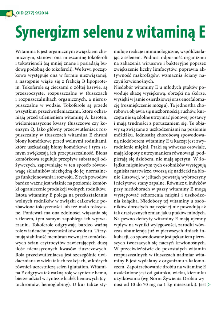 OID (277) 9/2014 OID (261) 06/2013 Synergizm selenu z witaminą E Witamina E jest organicznym związkiem chemicznym, stanowi ona mieszaninę tokoferoli i tokotrienoli (są mniej znane i posiadają budowę podobną do tokoferoli). We krwi początkowo występuje ona w formie niezwiązanej, a następnie wiąże się z frakcją B lipoprotein. Tokoferole są cieczami o żółtej barwie, są przezroczyste, rozpuszczalne w tłuszczach i rozpuszczalnikach organicznych, a nierozpuszczalne w wodzie. Tokoferole są przede wszystkim przeciwutleniaczami, które ochraniają przed utlenieniem witaminę A, karoten, wielonienasycone kwasy tłuszczowe czy koenzym Q. Jako główny przeciwutleniacz rozpuszczalny w tłuszczach witamina E chroni błony komórkowe przed wolnymi rodnikami, które uszkadzają błony komórkowe i tym samym zwiększają ich przepuszczalność. Błona komórkowa reguluje przepływ substancji odżywczych, zapewniając w ten sposób równowagę składników niezbędną do jej normalnego funkcjonowania i rozwoju. Z tych powodów bardzo ważne jest właśnie na poziomie komórki ograniczenie produkcji wolnych rodników. Istota witaminy E polega na przekształcaniu wolnych rodników w związki całkowicie pozbawione toksyczności lub też mało toksyczne. Ponieważ ma ona zdolności wiązania się z tlenem, tym samym zapobiega ich wytwarzaniu. Tokoferole odgrywają bardzo ważną rolę w łańcuchu przenośników wodoru. Utrzymują stabilność membran wewnątrzkomórkowych ścian erytrocytów zawierających dużą ilość nienasyconych kwasów tłuszczowych. Rola przeciwutleniacza jest szczególnie uwidaczniana w wielu takich reakcjach, w których również uczestniczą selen i glutation. Witamina E odgrywa też ważną rolę w syntezie hemu, bierze udział w syntezie białek hemowych (cytochromów, hemoglobiny). U kur także sty- muluje reakcje immunologiczne, współdziałając z selenem. Podnosi odporność organizmu na zakażenia wirusowe i bakteryjne poprzez zwiększenie liczby limfocytów, poprawia aktywność makrofagów, wzmacnia ściany naczyń krwionośnych. Niedobór witaminy E u młodych ptaków powoduje skazę wysiękową, obrzęki na skórze, wysięki w jamie osierdziowej oraz encefalomację (rozmiękczenie mózgu). Ta jednostka chorobowa objawia się niezbornością ruchów, kurczęta nie są zdolne utrzymać pionowej postawy i mają trudności z poruszaniem się. Te objawy są związane z uszkodzeniami na poziomie móżdżku. Jednostką chorobową spowodowaną niedoborem witaminy E u kacząt jest zwyrodnienie mięśni. Ptaki są wówczas osowiałe, mają kłopoty z utrzymaniem równowagi, podpierają się dziobem, nie mają apetytu. W żołądku mięśniowym tych osobników występują ogniska martwicze, tworzą się nadżerki na błonie śluzowej, w jelitach powstają wybroczyny i nieżytowe stany zapalne. Również u indyków przy niedoborach w paszy witaminy E mogą występować schorzenia mięśni i uszkodzenia żołądka. Niedobory tej witaminy u osobników dorosłych najczęściej nie powodują aż tak drastycznych zmian jak u ptaków młodych. Na pewno deficyty witaminy E mają ujemny wpływ na wyniki wylęgowości, zarodki wówczas obumierają już w pierwszych dniach inkubacji, co spowodowane jest pękaniem pierwszych tworzących się naczyń krwionośnych. W przeciwieństwie do pozostałych witamin rozpuszczalnych w tłuszczach nadmiar witaminy E jest wydalany z organizmu z kałomoczem. Zapotrzebowanie drobiu na witaminę E uzależnione jest od gatunku, wieku, kierunku użytkowania (wg Norm Żywienia Drobiu wynosi od 10 do 70 mg na 1 kg mieszanki). Jest OID (277) 9/2014 OID (261) 06/2013 ono także zależne od zawartości w paszy tłuszczu i selenu. Witamina ta jest syntetyzowana tylko przez rośliny. Bogate w nią są kiełki nasion (głównie pszenicy) i ziarna zbóż. W roślinach zielonych skumulowana jest głównie w liściach, a nie w łodygach. Do prawidłowego funkcjonowania organizmu zarówno ludzkiego jak i zwierzęcego niezbędna jest obecność selenu. Jego działanie w organizmie jest ściśle związane z witaminą E i aminokwasami zawierającymi siarkę. Selen wchodzi w skład peroksydazy glutationowej – enzymu odgrywającego rolę przeciwutleniacza wewnątrz komórek (stymuluje ją). Enzym ten bierze udział w utlenianiu glutationu, w ten sposób rozkładając pojawiającą się w komórkach H₂O₂ do H₂O. Jest to ważne dla procesów komórkowej detoksykacji, ponieważ nadtlenki tworzone przez H₂O₂ mogą powodować utlenianie wielonienasyconych kwasów tłuszczowych wchodzących w skład błon komórkowych. Aktywność peroksydazy glutationowej ma działanie oszczędzające witaminę E i odwrotnie, witamina E zmniejsza zapotrzebowanie na selen. Występuje więc synergizm działania witaminy E i selenu. Oznacza to, że wspólnie kilkakrotnie potęgują efekt działania każdego z osobna. Od selenu uzależniona jest też aktywność innych enzymów. Podnosi on także odporność organizmu, zwiększa liczbę limfocytów, reguluje także ich funkcjami. Głównym objawem niedoboru selenu jest skaza wysiękowa, polegająca na tworzeniu się obrzęków spowodowanych zmianami przepuszczalności naczyń kapilarnych. Część białek o niskiej masie cząsteczkowej dyfunduje do wysięku. Jednocześnie można obserwować podwyższone stężenie albumin w osoczu. Deficyt selenu u ptaków młodych, tak jak awitaminoza E, powoduje także słaby wzrost, zwiększenia śmiertelności, zwyrodnienie móżdżku i zwyrodnienie mięśni (szkieletowych, mięśni żołądka mięśniowego, mięśnia sercowego), które objawiają się ogniskami martwicowy- mi. Ponadto ptaki słabo opierzają się, obserwuje się puchlinę brzuszną, zwłóknienie i zanikanie trzustki. U drobiu dorosłego niedobór selenu obniża płodność, a nawet prowadzi do bezpłodności (podobnie jak awitaminoza E). Selen jest pierwiastkiem chemicznym i został odkryty raczej przypadkowo 