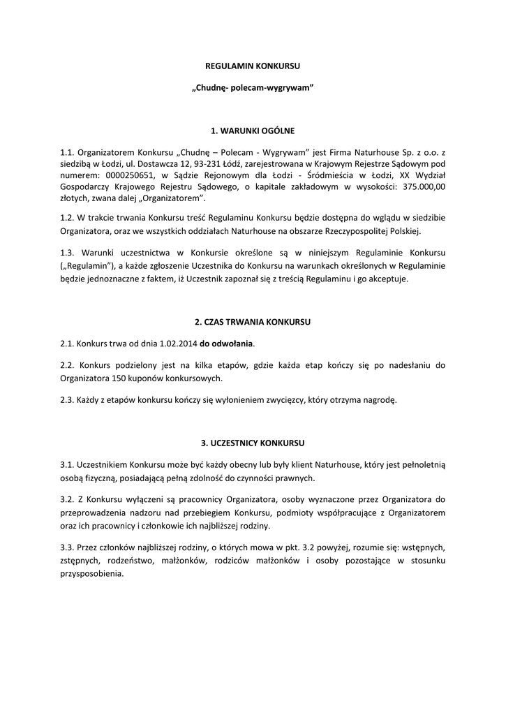 REGULAMIN KONKURSU „Chudnę- polecam-wygrywam” 1. WARUNKI OGÓLNE 1.1. Organizatorem Konkursu „Chudnę – Polecam - Wygrywam” jest Firma Naturhouse Sp. z o.o. z siedzibą w Łodzi, ul. Dostawcza 12, 93-231 Łódź, zarejestrowana w Krajowym Rejestrze Sądowym pod numerem: 0000250651, w Sądzie Rejonowym dla Łodzi - Śródmieścia w Łodzi, XX Wydział Gospodarczy Krajowego Rejestru Sądowego, o kapitale zakładowym w wysokości: 375.000,00 złotych, zwana dalej „Organizatorem”. 1.2. W trakcie trwania Konkursu treść Regulaminu Konkursu będzie dostępna do wglądu w siedzibie Organizatora, oraz we wszystkich oddziałach Naturhouse na obszarze Rzeczypospolitej Polskiej. 1.3. Warunki uczestnictwa w Konkursie określone są w niniejszym Regulaminie Konkursu („Regulamin”), a każde zgłoszenie Uczestnika do Konkursu na warunkach określonych w Regulaminie będzie jednoznaczne z faktem, iż Uczestnik zapoznał się z treścią Regulaminu i go akceptuje. 2. CZAS TRWANIA KONKURSU 2.1. Konkurs trwa od dnia 1.02.2014 do odwołania. 2.2. Konkurs podzielony jest na kilka etapów, gdzie każda etap kończy się po nadesłaniu do Organizatora 150 kuponów konkursowych. 2.3. Każdy z etapów konkursu kończy się wyłonieniem zwycięzcy, który otrzyma nagrodę. 3. UCZESTNICY KONKURSU 3.1. Uczestnikiem Konkursu może być każdy obecny lub były klient Naturhouse, który jest pełnoletnią osobą fizyczną, posiadającą pełną zdolność do czynności prawnych. 3.2. Z Konkursu wyłączeni są pracownicy Organizatora, osoby wyznaczone przez Organizatora do przeprowadzenia nadzoru nad przebiegiem Konkursu, podmioty współpracujące z Organizatorem oraz ich pracownicy i członkowie ich najbliższej rodziny. 3.3. Przez członków najbliższej rodziny, o których mowa w pkt. 3.2 powyżej, rozumie się: wstępnych, zstępnych, rodzeństwo, małżonków, rodziców małżonków i osoby pozostające w stosunku przysposobienia. 4. ZASADY KONKURSU 4.1. Warunkiem wzięcia udziału w Konkursie jest wypełnienie kuponu konkursowego i przesłanie go na adres: Naturhouse Sp. z o.o. ul. Dostawcza 12, 93-231 Łódź lub przekazanie go do oddziału Naturhouse na terenie Rzeczypospolitej Polskiej, który wykona taką wysyłkę. Organizator zobowiązuje się do zebrania kuponów. 4.2. W konkursie biorą udział tylko prawidłowo i kompletnie wypełnione kupony. 4.3. Poprzez prawidłowe wypełnienie kuponu rozumie się: wpisanie 3 imion i nazwisk oraz numerów telefonu osób, którym zostało polecone konkretne Centrum Dietetyczne Naturhouse; osoby te odbyły minimum jedną wizytę w poleconym Centrum Dietetycznym, zakończoną zakupem za minimum 100zł. Na kuponie należy również wpisać numer paragonu lub faktury, jako dowodu odbycia wizyty każdej z trzech osób. Na kuponie powinno znaleźć się również imię i nazwisko właściciela kuponu oraz pieczęć oddziału Naturhouse do którego uczęszcza. Uczestnik powinien również dokończy zdanie (Zdanie Konkursowe): „Polecam wszystkim usługi Naturhouse, ponieważ .............” dowolnie formułując wypowiedź. 4.3 a. Osoba, której zostało zarekomendowane Centrum Naturhouse nie może powtarzać się na kuponach różnych uczestników. 4.3 b. Uczestnik może wielokrotnie brać udział w Konkursie, ale za pomocą nowego kuponu. Na kolejnych kuponach nie mogą sie powtarzać te same nazwiska osób, którym polecone zostało dane Centrum Dietetyczne Naturhouse. 4.4. W każdym etapie konkursu, o którym mowa w pkt. 2.2. Zwycięzcą zostaje Uczestnik, który w najciekawszy sposób dokończy Zdanie Konkursowe, o którym mowa w pkt. 4.3. O tym, która odpowiedź jest najciekawsza decyduje Organizator. 4.5. Każdy etap konkursu, o którym mowa w pkt. 2.2 będzie rozstrzygany w ciągu 10 dni roboczych od zakończenia etapu. 4.6. W każdym etapie wygrywa tylko jeden kupon, pozostałe 149 kuponów jest niszczone, czyli jeden kupon bierze udział tylko w jednym etapie konkursu. 4.7. Nad prawidłowym przebiegiem konkursu czuwa 3-osobowa komisja wyłoniona przez Organizatora Konkursu. 4.8. Informację o wygranej Zwycięzca otrzyma listownie lub telefonicznie, a wyniki (imię i nazwisko Zwycięzcy etapu oraz zdjęcia z wręczenia potwierdzenia zwycięstwa (Voucheru)) będą publikowane na stronie www Organizatora oraz na jego profilu na Facebooku. 4.9. Jeżeli nie będą mogli zostać wyłonieni Zwycięzcy – nie będzie ani jednego zgłoszenia, to zgodnie z postanowieniami Regulaminu, nieprzyznana Nagroda pozostaje w dyspozycji Organizatora. 5. PRZETWARZANIE DANYCH OSOBOWYCH 5.1. Organizator oświadcza, iż wszystkie dane na kuponach konkursowych będą wykorzystywane wyłącznie w zakresie niezbędnym do przeprowadzenia Konkursu oraz wyłonienia jego Zwycięzców, a po zakończeniu Konkursu i upływie terminu do rozpatrzenia reklamacji zostaną zniszczone. 5.2. Imię i nazwisko Zwycięzcy/Nick Zwycięzcy zostanie zamieszczony na stronie www.naturhouse.com.pl oraz na http://facebook.com/naturhousepolska Jeżeli Zwycięzca nie zgadza się na opublikowanie jego danych na ww. stronie, powinien wysłać na adres [email protected] sprzeciw wobec zamieszczenia danych na ww. stronie. 5.3. Wysłanie przez Uczestnika zgłoszenia w ramach Konkursu jest jednoznaczne z zaakceptowaniem przez Uczestnika zasad Konkursu opisanych w Regulaminie. 5.4. Aby wziąć udział w konkursie uczestnik oraz osoby przez niego zarekomendowane są zobowiązani do przekazania zgody na przetwarzanie danych osobowych dla celów związanych z przeprowadzeniem Konkursu. Poszczególne oddziały Naturhouse są zobowiązane do zebrania takiej zgody od uczestników i przechowywania ich w bezpiecznym miejscu. 5.5. Uczestnik biorąc udział w Konkursie wyraża zgodę na przesyłanie informacji handlowej za pośrednictwem środków komunikacji elektronicznej, a w szczególności poczty elektronicznej zgodnie ustawą z dnia 18 lipca 2002r. - o świadczeniu usług drogą elektroniczną (Dz. U nr