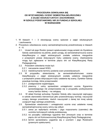PROCEDURA ODWOŁANIA SIĘ OD WYSTAWIONEJ OCENY SEMESTRALNEJ/ROCZNEJ Z ZAJĘĆ EDUKACYJNYCH I ZACHOWANIA W SZKOLE PODSTAWOWEJ NR 20 FUNDACJI SZKOLNEJ W WARSZAWIE 1. W klasach 1 – 3 obowiązują oceny opisowe z zajęć edukacyjnych i zachowania. 2. Procedura odwoławcza oceny semestralnej/rocznej przedmiotowej w klasach 4 – 6. 2.1. Uczeń lub jego Rodzic (prawni opiekunowie) mogą wnieść do Dyrektora Szkoły zastrzeżenia na piśmie, jeżeli uznają, że semestralna/roczna ocena klasyfikacyjna z zajęć edukacyjnych została ustalona niezgodnie z przepisami prawa dotyczącymi trybu ustalania oceny. Zastrzeżenia mogą być zgłaszane w terminie pięciu dni od Klasyfikacyjnej Rady Pedagogicznej. 2.2. Powodem odwołania może być: 2.2.1. naruszenie zasad WSO, 2.2.2. niedotrzymanie terminu podania ocen przewidywanych. 2.3. W przypadku stwierdzenia, że semestralna/końcowa ocena klasyfikacyjna z zajęć edukacyjnych została ustalona niezgodnie z przepisami prawa dotyczącymi trybu ustalania tej oceny, Dyrektor Szkoły powołuje komisję, która przeprowadzi: 2.3.1. postępowanie wyjaśniające, 2.3.2. pisemny i ustny sprawdzian umiejętności ucznia. Egzaminu sprawdzającego nie przeprowadza się w przypadku podwyższenia oceny bardzo dobrej – na celującą. 2.4. W skład Komisji wchodzą: Dyrektor Szkoły albo nauczyciel zajmujący w szkole stanowisko kierownicze jako przewodniczący komisji, nauczyciel uczący danego przedmiotu, dwóch nauczycieli z danej lub innej szkoły uczących tego samego przedmiotu. 2.5. Sprawdzian wiadomości i umiejętności ucznia oraz ustalenie nowej semestralnej/rocznej oceny winny się odbyć: 2.5.1. zaraz po wpłynięciu wniosku i jego rozpoznaniu (czerwiec) dla uczniów kończących szkołę podstawową, 2.5.2. na początku ostatniego tygodnia ferii zimowych oraz w terminie pięciu dni od Końcoworocznej Klasyfikacyjnej Rady Pedagogicznej. 2.5.3. termin sprawdzianu uzgadnia się z uczniem i jego Rodzicami (prawnymi opiekunami). 1 2.6. Po przeprowadzeniu sprawdzianu komisja ustala semestralną/roczną ocenę klasyfikacyjną z danego zajęcia edukacyjnego, a następnie podaje do wiadomości ucznia oraz jego Rodziców (prawnych opiekunów). 2.7. Ustalona przez komisję semestralna/roczna ocena klasyfikacyjna z zajęcia edukacyjnego nie może być niższa od oceny wcześniej ustalonej, z wyjątkiem niedostatecznej rocznej (semestralnej) oceny klasyfikacyjnej z zajęć edukacyjnych, która może być zmieniona w wyniku egzaminu poprawkowego. 2.8. Z prac komisji sporządza się protokół, który stanowi załącznik do arkusza ocen ucznia; do protokołu dołącza się pisemne prace i zwięzłą informację o ustnych odpowiedziach ucznia. 2.9. Decyzja komisji jest ostateczna. 2.10. Uczeń, który z przyczyn usprawiedliwionych nie przystąpił do sprawdzianu w wyznaczonym terminie, może przystąpić do niego w dodatkowym terminie, wyznaczonym przez Dyrektora Szkoły. 3. Przepisy stosuje się odpowiednio w przypadku rocznej (semestralnej) oceny klasyfikacyjnej z zajęć edukacyjnych uzyskanej w wyniku egzaminu poprawkowego, z tym że termin do zgłoszenia zastrzeżeń na piśmie wynosi siedem dni od dnia przeprowadzenia egzaminu poprawkowego. W tym przypadku, ocena ustalona przez komisję jest ostateczna. 4. Procedura odwoławcza oceny semestralnej/rocznej zachowania w klasach 4 – 6. 4.1. Uczeń lub jego Rodzic (prawni opiekunowie) mogą wnieść do Dyrektora Szkoły zastrzeżenia na piśmie, jeżeli uznają, że semestralna/roczna ocena klasyfikacyjna z zachowania została ustalona niezgodnie z przepisami prawa dotyczącymi trybu ustalania oceny. Zastrzeżenia mogą być zgłaszane w terminie pięciu dni od Klasyfikacyjnej Rady Pedagogicznej. 4.2. Powodem odwołania może być: 4.2.1. naruszenie zasad WSO, 4.2.2. niedotrzymanie terminu podania ocen przewidywanych. 4.3. W przypadku stwierdzenia, że semestralna/końcowa ocena klasyfikacyjna zachowania została ustalona niezgodnie z przepisami prawa dotyczącymi trybu ustalania tej oceny, Dyrektor Szkoły powołuje komisję, która przeprowadzi: 4.3.1. postepowanie wyjaśniające, 4.3.2. ustali roczna ocenę klasyfikacyjną zachowania w drodze głosowania zwykłą większością głosów; w przypadku równej liczby głosów decyduje głos przewodniczącego komisji. 4.4. W skład komisji wchodzą: Dyrektor Szkoły albo nauczyciel zajmujący w szkole stanowisko kierownicze jako przewodniczący komisji, wychowawca klasy, wskazany przez Dyrektora Szkoły nauczyciel prowadzący zajęcia w danej klasie, pedagog. 4.5. Ustalenie semestralnej/rocznej oceny zachowania winno się odbyć: 2 4.5.1. zaraz po wpłynięciu wniosku i jego rozpoznaniu (czerwiec) dla uczniów kończących szkołę podstawową, 4.5.2. na początku ostatniego tygodnia ferii zimowych oraz w terminie pięciu dni od wpłynięcia wniosku. 4.6. Ustalona przez komisję semestralna/roczna ocena klasyfikacyjna zachowania nie może być niższa od oceny wcześniej ustalonej. 4.7. Decyzja komisji jest ostateczna. Zatwierdzono 06.06.2011 r. 3