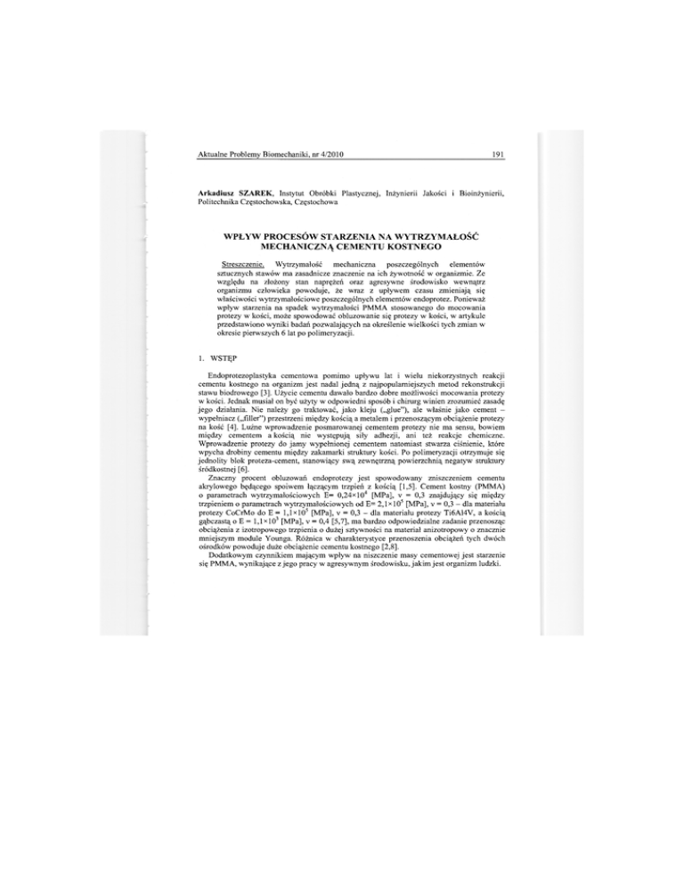Aktualne Problemy Biomechaniki, nr 4/2010 191 Arkadiusz SZAREK, Instytut Obróbki Plastycznej, Inżynierii Jakości i Bioinżynierii, Politechnika Częstochowska, Częstochowa WPŁYW PROCESÓW STARZENIA NA WYTRZYMAŁOŚĆ MECHANICZNĄ CEMENTU KOSTNEGO Streszczenie. Wytrzymałość mechaniczna poszczególnych elementów sztucznych stawów ma zasadnicze znaczenie na ich żywotność w organizmie. Ze względu na złożony stan naprężeń oraz agresywne środowisko wewnątrz organizmu człowieka powoduje, że wraz z upływem czasu zmieniają się właściwości wytrzymałościowe poszczególnych elementów endoprotez. Ponieważ wpływ starzenia na spadek wytrzymałości PMMA stosowanego do mocowania protezy w kości, może spowodować obluzowanie się protezy w kości, w artykule przedstawiono wyniki badań pozwalających na określenie wielkości tych zmian w okresie pierwszych 6 lat po polimeryzacji. 1. WSTĘP Endoprotezoplastyka cementowa pomimo upływu lat i wielu niekorzystnych reakcji cementu kostnego na organizm jest nadal jedną z najpopularniejszych metod rekonstrukcji stawu biodrowego [3], Użycie cementu dawało bardzo dobre możliwości mocowania protezy w kości. Jednak musiał on być użyty w odpowiedni sposób i chirurg winien zrozumieć zasadę jego działania. Nie należy go traktować, jako kleju („glue"), ale właśnie jako cement wypełniacz („filier") przestrzeni między kością a metalem i przenoszącym obciążenie protezy na kość [4]. Luźne wprowadzenie posmarowanej cementem protezy nie ma sensu, bowiem między cementem a kością nie występują siły adhezji, ani też reakcje chemiczne. Wprowadzenie protezy do jamy wypełnionej cementem natomiast stwarza ciśnienie, które wpycha drobiny cementu między zakamarki struktury kości. Po polimeryzacji otrzymuje się jednolity blok proteza-cement, stanowiący swą zewnętrzną powierzchnią negatyw struktury śródkostnej [6]. Znaczny procent obluzowań endoprotezy jest spowodowany zniszczeniem cementu akrylowego będącego spoiwem łączącym trzpień z kością [1,5]. Cement kostny (PMMA) o parametrach wytrzymałościowych E= 0,24x10 4 [MPa], v = 0,3 znajdujący się między trzpieniem o parametrach wytrzymałościowych od E= 2,1 xl0 5 [MPa], v = 0,3 - dla materiału protezy CoCrMo do E = l , l x l 0 5 [MPa], v = 0,3 - dla materiału protezy Ti6A14V, a kością gąbczastą o E = 1,1 xl O3 [MPa], v = 0,4 [5,7], ma bardzo odpowiedzialne zadanie przenosząc obciążenia z izotropowego trzpienia o dużej sztywności na materiał anizotropowy o znacznie mniejszym module Younga. Różnica w charakterystyce przenoszenia obciążeń tych dwóch ośrodków powoduje duże obciążenie cementu kostnego [2,8]. Dodatkowym czynnikiem mającym wpływ na niszczenie masy cementowej jest starzenie się PMMA, wynikające z jego pracy w agresywnym środowisku, jakim jest organizm ludzki. 192 A. Szarek 2. METODYKA BADAŃ Na podstawie analizy warunków pracy masy cementowej w organizmie ludzkim określono, iż zaimplantowany do organizmu PMMA przenosi bardzo złożone obciążenia wynikające z motoryki człowieka. Charakter obciążeń protezy wynikający z codziennych czynności takich, jak chodzenie, siadanie czy wchodzenie po schodach może świadczyć, że obciążenia mają charakter dynamiczny (udarowy), a stany naprężeń w obszarze endoprotezy dowodzą, iż maksymalne wartości uzyskują naprężenia ściskające. Dla takiego charakteru pracy przeprowadzono dwie próby wytrzymałościowe: próbę ściskania oraz próbę udarności. Do badań wykorzystano cztery komercyjne cementy stosowane powszechnie w ortopedii: CEMEX RX - produkcja TECRES SPA, PALACOS R - produkcja SCHERING - PLOUGH INTERNATIONAL INC. KENILWORTH, NEW JERSEY, SIMPLEX P - produkcja HOWMEDICA LIMERICK, oraz PALAMED 40 - produkcja BIOMET MERCK. Badania wytrzymałościowe prowadzone były na maszynie wytrzymałościowej, dla której prędkość zgniotu ustalona została na 60 [mm/min], oraz na młocie Charpy'ego o energii młota 7,5 J. Do badań użyto dwa rodzaje próbek, wykonanych zgodnie z normą ISO 5833 "Implants for surgery - Acrylic resin cements". Jako próbkę wzorcową (przed starzeniem) wykorzystano masę cementową, spolimeryzowaną 24 godziny przed badaniem, przechowywaną w roztworze Ringera. Próbki poddawane zostały procesowi starzenia zanurzeniowego w płynie Ringera w okresie do 6 lat od polimeryzacji masy cementowej. 3. WYNIKI BADAŃ Na podstawie przeprowadzonych badań stwierdzono, iż wytrzymałość na ściskanie masy cementowej wzorcowej w zależności od rodzaju i producenta zawiera się w obszarze od Rc = 82 MPa do Rc = 126 MPa, co przedstawia wykres 1. Cement kostny jest materiałem kruchym, co w przypadku obciążeń dynamicznych przenoszonych z protezy na cement kośmy, a później na kość może powodować powstanie mikropęknięć przeradzających się w wykruszenia cementu kostnego. Na wykresie 2 przedstawiono wyniki pomiarów udarności PMMA dla próbek wykonanych 24 godziny przed próbą. Dokonując analizy wyników badań statycznej próby ściskania masy cementowej w okresie po polimeryzacji od 1 do 6 lat stwierdzono, iż wraz z upływem czasu zmniejsza się wytrzymałość na ściskanie PMMA. re O. 5 120 - j 80 I ii 40 | / BPalamed 40 DPalacos R DSimplex P DCemex RX \ Rys. 1. Zmiana wytrzymałości Rc [MPa] PMMA wraz z upływem czasu Wpływ procesów starzenia na wytrzymałość mechaniczną cementu kostnego 1_93 Proces starzenia cementu kostnego w płynie Ringera powoduje w 3 letnim okresie zanurzenia spadek wytrzymałości na ściskanie cementów w od 1,5% do 5%. Największy spadek wytrzymałości zaobserwowano dla PMMA - Palamed 40, gdzie wytrzymałość na ściskanie spadła z Rc = 126 [MPa] dla próbki bazowej o blisko 5%. Najmniejszy spadek wytrzymałości w tym samym okresie zanotowano dla cementu kostnego Cemex RX, gdzie wytrzymałość na ściskanie spadła o 1,5% z Rc = 82 [MPa] dla próbki bazowej do Rc =81