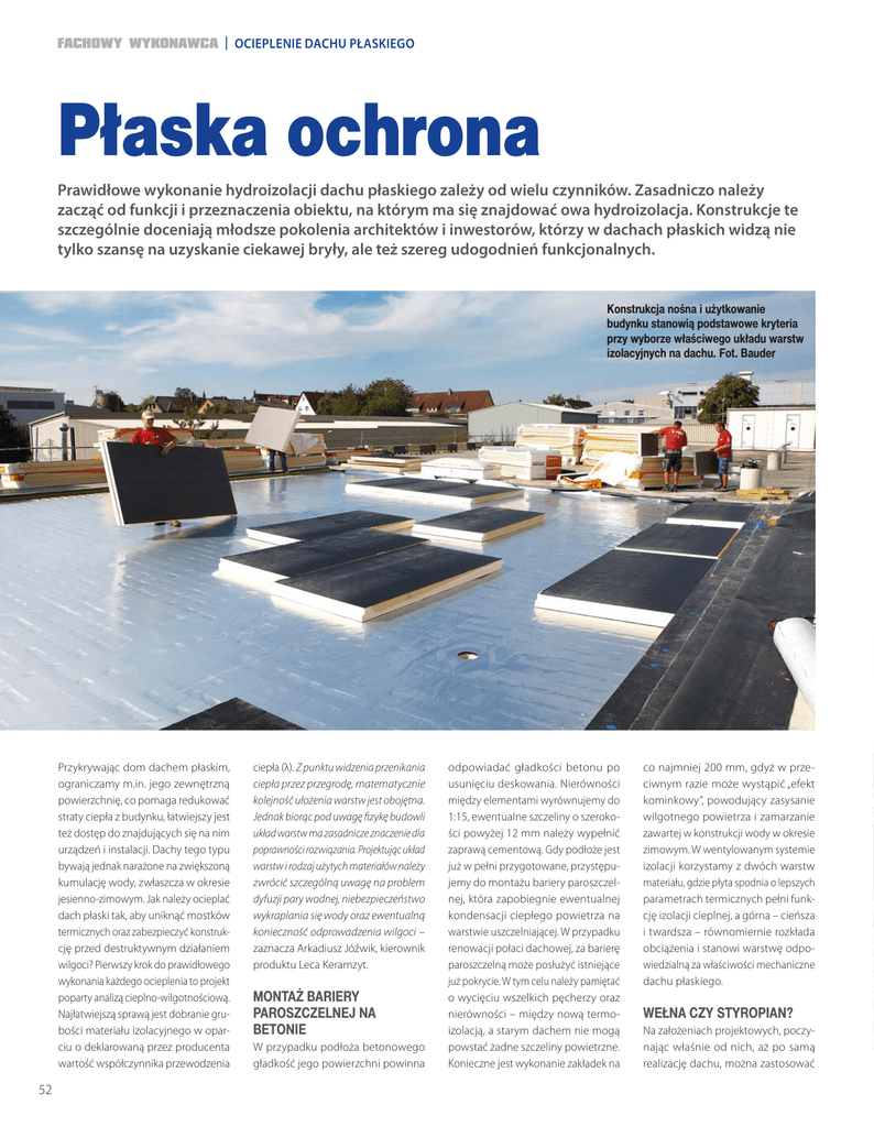 FACHOWY WYKONAWCA | OCIEPLENIE DACHU PŁASKIEGO Płaska ochrona Prawidłowe wykonanie hydroizolacji dachu płaskiego zależy od wielu czynników. Zasadniczo należy zacząć od funkcji i przeznaczenia obiektu, na którym ma się znajdować owa hydroizolacja. Konstrukcje te szczególnie doceniają młodsze pokolenia architektów i inwestorów, którzy w dachach płaskich widzą nie tylko szansę na uzyskanie ciekawej bryły, ale też szereg udogodnień funkcjonalnych. Konstrukcja nośna i użytkowanie budynku stanowią podstawowe kryteria przy wyborze właściwego układu warstw izolacyjnych na dachu. Fot. Bauder Przykrywając dom dachem płaskim, ograniczamy m.in. jego zewnętrzną powierzchnię, co pomaga redukować straty ciepła z budynku, łatwiejszy jest też dostęp do znajdujących się na nim urządzeń i instalacji. Dachy tego typu bywają jednak narażone na zwiększoną kumulację wody, zwłaszcza w okresie jesienno-zimowym. Jak należy ocieplać dach płaski tak, aby uniknąć mostków termicznych oraz zabezpieczyć konstrukcję przed destruktywnym działaniem wilgoci? Pierwszy krok do prawidłowego wykonania każdego ocieplenia to projekt poparty analizą cieplno-wilgotnościową. Najłatwiejszą sprawą jest dobranie grubości materiału izolacyjnego w oparciu o deklarowaną przez producenta wartość współczynnika przewodzenia 52 ciepła (λ). Z punktu widzenia przenikania ciepła przez przegrodę, matematycznie kolejność ułożenia warstw jest obojętna. Jednak biorąc pod uwagę fizykę budowli układ warstw ma zasadnicze znaczenie dla poprawności rozwiązania. Projektując układ warstw i rodzaj użytych materiałów należy zwrócić szczególną uwagę na problem dyfuzji pary wodnej, niebezpieczeństwo wykraplania się wody oraz ewentualną konieczność odprowadzenia wilgoci – zaznacza Arkadiusz Jóźwik, kierownik produktu Leca Keramzyt. MONTAŻ BARIERY PAROSZCZELNEJ NA BETONIE W przypadku podłoża betonowego gładkość jego powierzchni powinna odpowiadać gładkości betonu po usunięciu deskowania. Nierówności między elementami wyrównujemy do 1:15, ewentualne szczeliny o szerokości powyżej 12 mm należy wypełnić zaprawą cementową. Gdy podłoże jest już w pełni przygotowane, przystępujemy do montażu bariery paroszczelnej, która zapobiegnie ewentualnej kondensacji ciepłego powietrza na warstwie uszczelniającej. W przypadku renowacji połaci dachowej, za barierę paroszczelną może posłużyć istniejące już pokrycie. W tym celu należy pamiętać o wycięciu wszelkich pęcherzy oraz nierówności – między nową termoizolacją, a starym dachem nie mogą powstać żadne szczeliny powietrzne. Konieczne jest wykonanie zakładek na co najmniej 200 mm, gdyż w przeciwnym razie może wystąpić „efekt kominkowy”, powodujący zasysanie wilgotnego powietrza i zamarzanie zawartej w konstrukcji wody w okresie zimowym. W wentylowanym systemie izolacji korzystamy z dwóch warstw materiału, gdzie płyta spodnia o lepszych parametrach termicznych pełni funkcję izolacji cieplnej, a górna – cieńsza i twardsza – równomiernie rozkłada obciążenia i stanowi warstwę odpowiedzialną za właściwości mechaniczne dachu płaskiego. WEŁNA CZY STYROPIAN? Na założeniach projektowych, poczynając właśnie od nich, aż po samą realizację dachu, można zastosować FACHOWY WYKONAWCA | OCIEPLENIE DACHU PŁASKIEGO kilka „trików”, dzięki którym da się zaoszczędzić pieniądze. Załóżmy, że mamy obiekt o sporej powierzchni, gdzie nie jest logiczne wykonanie dachu 2-spadowego, tak jak w przypadku domu jednorodzinnego, a jedynie dach płaski o małym spadku, który wg. przepisów ma mieć nośność E15 lub E30. Od lat, przyjęte lobby producentów wełny mineralnej przodowało w tego typu przykryciach wyprzedzając się nieznacznymi różnicami miedzy swoimi produktami. Świetnie radziły sobie na rynku nie mając wcale żadnej konkurencji – mówi Piotr Makac, dyrektor ds. technicznych P.P.H.U. Marcin Bieliński. Masa tego produktu waha się od kilkunastu do kilkudziesięciu kg/m2 przy założeniu dachu o grubości 16 do 20 cm. Do tego dochodzi jeszcze wełna utwardzana, która jest bardzo droga. Przez to, że ciężar jest większy, to konstrukcja, która go przenosi musi być mocniejsza, a to także są koszta. Rozwianiem obciążenia jak i masywności konstrukcji jest styropian. Masa tego typu wyrobów waha się od kilku do kilkunastu kg/mkw przy założeniu dachu o grubości 16 do 20 cm. Jest wygodniejszy w obróbce. Trzeba pamiętać, że styropian stosowany na dach musi mieć odpowiednią twardość. Taki materiał ma swoje oznaczenie tzw „dach/podłoga” można tu już stosować EPS80, EPS100 – dodaje Piotr Makac. Czy styropian można porównywać do klas odporności ogniowej np. wełny? Owszem. Przekładka z welonu szklanego daje nam R15, a 2 przekładki dają nam R30. Z warstwą zewnętrzną jest podobnie jak przy wełnie. Należy pamiętać, że papę układa się do styropianu mechanicznie, kołując ją do podłoża, a następną warstwę, dopiero metodą na gorąco. W taki sposób zyskamy zarówno na konstrukcji, która musi przenieść mniejsze obciążenie i na materiale, który jest w tym przypadku tańszy od 35-40% w stosunku do wełny – podsumowuje Piotr Makac. PŁYNNE FOLIE Produkt ten powstaje na bazie żywic poliuretanowych lub polimerów akrylowych z wkładką z włókniny. Stosowane są jako uszczelnienia tzw. miejsc trudnych. Przepusty, stopy klimatyzatorów, podstawy świetlików i inne elementy spotykane na dachach oraz jako całopowierzchniowe pokrycie dachowe. Polskie wytyczne mówią, że płynne folie należy nakładać całopowierzchniowo, wymagana jest wkładka z włókniny – „osnowa”, grubość gotowej („utwardzonej”) warstwy musi wynosić Uniknięcie stromych powierzchni pozwala optymalnie wykorzystać przestrzeń pod dachem, zapewniając najwyższy komfort mieszkania. Fot. Bauder I