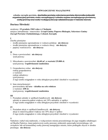 OŚWIADCZENIE MAJĄTKOWE członka zarządu powiatu, skarbnika powiatu, sekretarza powiatu, kierownika jednostki organizacyjnej powiatu, osoby zarządzającej i członka organu zarządzającego powiatową osobą prawną oraz osoby wydającej decyzje administracyjne w imieniu starosty Dariusz Śliwiński urodzony: 19 grudnia 1965 roku w Chełmnie miejsce zatrudnienia / stanowisko: Urząd Gminy Papowo Biskupie, Sekretarz Gminy Zarząd Powiatu Chełmińskiego, Członek Zarządu I Zasoby pieniężne: – środki pieniężne zgromadzone w walucie polskiej: nie dotyczy – środki pieniężne zgromadzone w walucie obcej: nie dotyczy – papiery wartościowe: nie dotyczy II 1. Dom o powierzchni: nie dotyczy tytuł prawny: 2. Mieszkanie o powierzchni: 66,60 m2, o wartości 25.000 zł. tytuł prawny: współwłasność małżeńska 3. Gospodarstwo rolne: nie dotyczy rodzaj gospodarstwa: o wartości: rodzaj zabudowy: tytuł prawny: Z tego tytułu osiągnąłem w roku ubiegłym przychód i dochód w wysokości: 4. Inne nieruchomości: powierzchnia: 6,5 ara – działka na cele rolnicze o wartości: 650 zł. tytuł prawny: współwłasność małżeńska III 1. Posiadam udziały w spółkach handlowych: nie dotyczy udziały te stanowią pakiet większy niż 10% udziałów w spółce: Z tego tytułu osiągnąłem w roku ubiegłym przychód i dochód w wysokości: IV 1. Posiadam akcje w spółkach handlowych: nie dotyczy akcje te stanowią pakiet większy niż 10% akcji w spółce: Z tego tytułu osiągnąłem w roku ubiegłym przychód i dochód w wysokości: V Nabyłem ( nabył mój małżonek, z wyłączeniem mienia przynależnego do jego majątku odrębnego) od Skarbu Państwa, innej państwowej osoby prawnej, jednostek samorządu terytorialnego, ich związków lub od komunalnej osoby prawnej następujące mienie, które podlegało zbyciu w drodze przetargu: nie dotyczy VI 1. Prowadzę działalność gospodarczą: nie dotyczy osobiście: wspólnie z innymi osobami: Z tego tytułu osiągnąłem w roku ubiegłym przychód i dochód w wysokości: 2. Zarządzam działalnością gospodarczą lub jestem przedstawicielem pełnomocnikiem takiej działalności: osobiście: wspólnie z innymi osobami: Z tego tytułu osiągnąłem w roku ubiegłym przychód i dochód w wysokości: VII W spółkach handlowych: nie dotyczy jestem członkiem zarządu: jestem członkiem rady nadzorczej: jestem członkiem komisji rewizyjnej: Z tego tytułu osiągnąłem w roku ubiegłym przychód i dochód w wysokości: W spółdzielniach: nie dotyczy jestem członkiem zarządu: jestem członkiem rady nadzorczej: jestem członkiem komisji rewizyjnej: Z tego tytułu osiągnąłem w roku ubiegłym przychód i dochód w wysokości: W fundacjach prowadzących działalność gospodarczą: nie dotyczy jestem członkiem zarządu: jestem członkiem rady nadzorczej: jestem członkiem komisji rewizyjnej: Z tego tytułu osiągnąłem w roku ubiegłym przychód i dochód w wysokości: VIII Inne dochody osiągane z tytułu zatrudnienia lub innej działalności zarobkowej lub zajęć, z podaniem kwot uzyskiwanych z każdego tytułu: wynagrodzenie za pracę w UG – 48.562,55 zł. dieta radnego – 14.227,34 zł. IX Składniki mienia ruchomego o wartości powyżej 10 000 złotych: samochód Opel Astra, 1998 rok, współwłasność małżeńska X Zobowiązania pieniężne o wartości powyżej 10 000 złotych, w tym zaciągnięte kredyty i pożyczki oraz warunki, na jakich zostały udzielone: kredyt na zakup samochodu w kwocie 26.170 zł. zaciągnięty w 2002 roku – współwłasność małżeńska