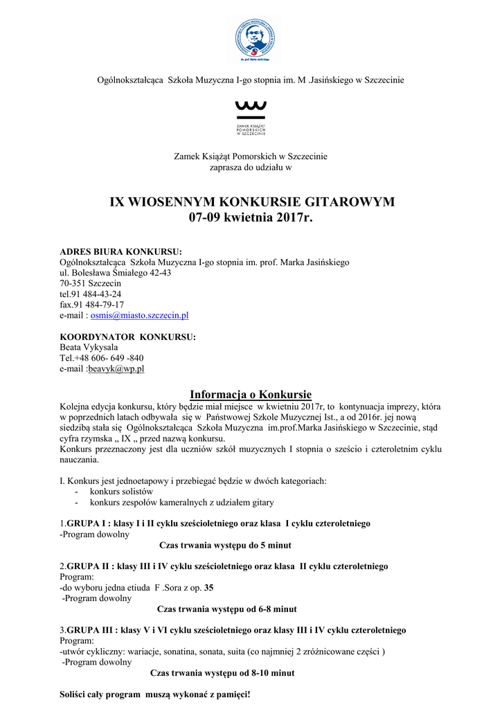 Ogólnokształcąca Szkoła Muzyczna I-go stopnia im. M .Jasińskiego w Szczecinie Zamek Książąt Pomorskich w Szczecinie zaprasza do udziału w IX WIOSENNYM KONKURSIE GITAROWYM 07-09 kwietnia 2017r. ADRES BIURA KONKURSU: Ogólnokształcąca Szkoła Muzyczna I-go stopnia im. prof. Marka Jasińskiego ul. Bolesława Śmiałego 42-43 70-351 Szczecin tel.91 484-43-24 fax.91 484-79-17 e-mail : [email protected] KOORDYNATOR KONKURSU: Beata Vykysala Tel.+48 606- 649 -840 e-mail :[email protected] Informacja o Konkursie Kolejna edycja konkursu, który będzie miał miejsce w kwietniu 2017r, to kontynuacja imprezy, która w poprzednich latach odbywała się w Państwowej Szkole Muzycznej Ist., a od 2016r. jej nową siedzibą stała się Ogólnokształcąca Szkoła Muzyczna im.prof.Marka Jasińskiego w Szczecinie, stąd cyfra rzymska „ IX „ przed nazwą konkursu. Konkurs przeznaczony jest dla uczniów szkół muzycznych I stopnia o sześcio i czteroletnim cyklu nauczania. I. Konkurs jest jednoetapowy i przebiegać będzie w dwóch kategoriach: - konkurs solistów - konkurs zespołów kameralnych z udziałem gitary 1.GRUPA I : klasy I i II cyklu sześcioletniego oraz klasa I cyklu czteroletniego -Program dowolny Czas trwania występu do 5 minut 2.GRUPA II : klasy III i IV cyklu sześcioletniego oraz klasa II cyklu czteroletniego Program: -do wyboru jedna etiuda F .Sora z op. 35 -Program dowolny Czas trwania występu od 6-8 minut 3.GRUPA III : klasy V i VI cyklu sześcioletniego oraz klasy III i IV cyklu czteroletniego Program: -utwór cykliczny: wariacje, sonatina, sonata, suita (co najmniej 2 zróżnicowane części ) -Program dowolny Czas trwania występu od 8-10 minut Soliści cały program muszą wykonać z pamięci! 3.Grupa III :Zespoły kameralne (dowolny skład) z udziałem gitary Program dowolny (może być wykonany z nut) Czas trwania występu do 10 minut WARUNKI UCZESTNICTWA : I . Do udziału w konkursie dopuszczone zostaną osoby, które do dnia 15.03.2017r. prześlą kartę uczestnictwa wraz z kserokopią dowodu wpłaty wpisowego. Liczba uczestników jest ograniczona! II. Wysokość wpisowego : - solista – 80 zł - zespół kameralny – 100 zł III. Wpisowe należy wpłacić na konto i dołączyć kopię dowodu wpłaty do karty zgłoszenia: RADA RODZICÓW przy OSM 16 1440 1143 0000 0000 1225 0371 Bank PKOBP z adnotacją „ IX Wiosenny Konkurs Gitarowy” + imię i nazwisko uczestnika bądź skład zespołu. IV. W przypadku rezygnacji z udziału w konkursie wpisowe nie będzie zwracane. V. O przyjęciu do konkursu zainteresowani zostaną powiadomieni do dnia 31.03.2017r. VI. Przesłuchania konkursowe są otwarte dla publiczności. VII . Zmagania konkursowe oceniać będzie jury pod przewodnictwem Profesora Oświaty Marka Zielińskiego , Jakuba Kościuszko oraz Piotra Kosmowskiego, powołane przez organizatorów. VIII. Jury ma prawo dowolnego podziału nagród. Decyzje Jury są ostateczne. IX. Członkowie jury nie mogą zgłaszać do konkursu swoich uczniów. X. Nauczyciele otrzymają karty z punktacją swoich uczniów. XI. Wszyscy wykonawcy otrzymają dyplomy uczestnictwa, a dla laureatów przewidziane są nagrody. XII . Ogłoszenie wyników nastąpi w sobotę wieczorem 08.04.2017r. natomiast koncert laureatów odbędzie się 09.04.2017r. w Sali Bogusława Zamku Książąt Pomorskich o godz.12.00 w ramach Festiwalu Wiosenne Koncerty Gitarowe. XIII. Laureaci konkursu zobowiązani są do udziału w niedzielnym Koncercie Laureatów!!! KOSZTY UCZESTNICTWA I. Koszty przejazdu , wyżywienia i zakwaterowania pokrywają uczestnicy bądź instytucje delegujące. II. Rezerwację noclegów i wyżywienia uczestnicy załatwiają samodzielnie. Poniżej podaję adresy: -Hotel Elka-sen al.3-go Maja 1A, tel.91 433-56-04 ( pokoje od 2 do 4 osobowych) -Hotel Gryf AL.Wojska Polskiego 49,Tel.91 480-84-00 (blisko szkoły) -Pokoje INTEGRO ul.Mickiewicza 34B, Tel.609- 744 -816 lub 601- 700 -882 ( blisko szkoły) Organizatorzy zarezerwowali w/w hotelach pewną pulę pokoi , ale ze względu na ograniczoną ilość miejsc, proszę noclegi rezerwować z wyprzedzeniem ,najlepiej do15.03.2017r .Po tym terminie w/w hotele mogą już nie dysponować wolnymi pokojami. Proszę podczas zamawiania noclegów powoływać się na Wiosenny Konkurs Gitarowy.