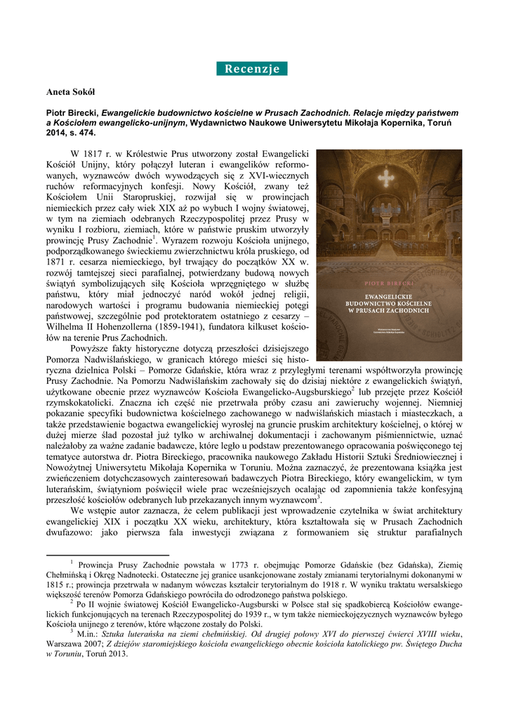 Recenzje _ Aneta Sokół Piotr Birecki, Ewangelickie budownictwo kościelne w Prusach Zachodnich. Relacje między państwem a Kościołem ewangelicko-unijnym, Wydawnictwo Naukowe Uniwersytetu Mikołaja Kopernika, Toruń 2014, s. 474. W 1817 r. w Królestwie Prus utworzony został Ewangelicki Kościół Unijny, który połączył luteran i ewangelików reformowanych, wyznawców dwóch wywodzących się z XVI-wiecznych ruchów reformacyjnych konfesji. Nowy Kościół, zwany też Kościołem Unii Staropruskiej, rozwijał się w prowincjach niemieckich przez cały wiek XIX aż po wybuch I wojny światowej, w tym na ziemiach odebranych Rzeczypospolitej przez Prusy w wyniku I rozbioru, ziemiach, które w państwie pruskim utworzyły prowincję Prusy Zachodnie1. Wyrazem rozwoju Kościoła unijnego, podporządkowanego świeckiemu zwierzchnictwu króla pruskiego, od 1871 r. cesarza niemieckiego, był trwający do początków XX w. rozwój tamtejszej sieci parafialnej, potwierdzany budową nowych świątyń symbolizujących siłę Kościoła wprzęgniętego w służbę państwu, który miał jednoczyć naród wokół jednej religii, narodowych wartości i programu budowania niemieckiej potęgi państwowej, szczególnie pod protektoratem ostatniego z cesarzy – Wilhelma II Hohenzollerna (1859-1941), fundatora kilkuset kościołów na terenie Prus Zachodnich. Powyższe fakty historyczne dotyczą przeszłości dzisiejszego Pomorza Nadwiślańskiego, w granicach którego mieści się historyczna dzielnica Polski – Pomorze Gdańskie, która wraz z przyległymi terenami współtworzyła prowincję Prusy Zachodnie. Na Pomorzu Nadwiślańskim zachowały się do dzisiaj niektóre z ewangelickich świątyń, użytkowane obecnie przez wyznawców Kościoła Ewangelicko-Augsburskiego2 lub przejęte przez Kościół rzymskokatolicki. Znaczna ich część nie przetrwała próby czasu ani zawieruchy wojennej. Niemniej pokazanie specyfiki budownictwa kościelnego zachowanego w nadwiślańskich miastach i miasteczkach, a także przedstawienie bogactwa ewangelickiej wyrosłej na gruncie pruskim architektury kościelnej, o której w dużej mierze ślad pozostał już tylko w archiwalnej dokumentacji i zachowanym piśmiennictwie, uznać należałoby za ważne zadanie badawcze, które legło u podstaw prezentowanego opracowania poświęconego tej tematyce autorstwa dr. Piotra Bireckiego, pracownika naukowego Zakładu Historii Sztuki Średniowiecznej i Nowożytnej Uniwersytetu Mikołaja Kopernika w Toruniu. Można zaznaczyć, że prezentowana książka jest zwieńczeniem dotychczasowych zainteresowań badawczych Piotra Bireckiego, który ewangelickim, w tym luterańskim, świątyniom poświęcił wiele prac wcześniejszych ocalając od zapomnienia także konfesyjną przeszłość kościołów odebranych lub przekazanych innym wyznawcom3. We wstępie autor zaznacza, że celem publikacji jest wprowadzenie czytelnika w świat architektury ewangelickiej XIX i początku XX wieku, architektury, która kształtowała się w Prusach Zachodnich dwufazowo: jako pierwsza fala inwestycji związana z formowaniem się struktur parafialnych 1 Prowincja Prusy Zachodnie powstała w 1773 r. obejmując Pomorze Gdańskie (bez Gdańska), Ziemię Chełmińską i Okręg Nadnotecki. Ostateczne jej granice usankcjonowane zostały zmianami terytorialnymi dokonanymi w 1815 r.; prowincja przetrwała w nadanym wówczas kształcir terytorialnym do 1918 r. W wyniku traktatu wersalskiego większość terenów Pomorza Gdańskiego powróciła do odrodzonego państwa polskiego. 2 Po II wojnie światowej Kościół Ewangelicko-Augsburski w Polsce stał się spadkobiercą Kościołów ewangelickich funkcjonujących na terenach Rzeczypospolitej do 1939 r., w tym także niemieckojęzycznych wyznawców byłego Kościoła unijnego z terenów, które włączone zostały do Polski. 3 M.in.: Sztuka luterańska na ziemi chełmińskiej. Od drugiej połowy XVI do pierwszej ćwierci XVIII wieku, Warszawa 2007; Z dziejów staromiejskiego kościoła ewangelickiego obecnie kościoła katolickiego pw. Świętego Ducha w Toruniu, Toruń 2013. nowoutworzonego Kościoła, oraz późniejsza, z charakterystycznym nasileniem konfesyjnego budownictwa, którego apogeum przypadło w czasach drugiej Rzeszy, gdy Kościół zdecydowanie wprzęgnięty został w służbę niemieckim interesom narodowym. Na kartach książki przedstawione zostało budownictwo rozwijające się w dawnych pruskich rejencjach: gdańskiej i kwidzyńskiej, tym samym na obszarach współczesnego Pomorza Nadwiślańskiego, jednocześnie na tle powstawania i rozwoju poszczególnych parafii oraz organizacyjnego wysiłku każdorazowo towarzyszącego wznoszeniu świątyń przy zaangażowaniu miejscowych społeczności parafialnych wspartych przez odgórne struktury kościelne i popartych zainteresowaniem i dotacjami udzielanymi przez władców pruskich. Tak nakreślonej tematyce książki towarzyszy jednak znacznie szerszy zamysł autorski – pokazanie programu budownictwa tworzonego w królestwie pruskim (późniejszym cesarstwie niemieckim), a zwłaszcza ukazanie polityki budownictwa sakralnego czasów Wilhelma II, którego panowaniu towarzyszył nie tylko zdecydowany jego wzrost, ale także ożywiona dyskusja na temat architektonicznych rozwiązań stosowanych w kościelnym budownictwie oraz organizacyjne uporządkowanie inwestycyjnych procedur, realizowanych dzięki wsparciu samego władcy. Przedstawiając świat unijnej architektury autor prezentuje, w jaki sposób kościoły powstawały, jak wyglądały i jaką funkcję pełniły w wymiarze parafialnym, ale także: jak kształtowały jedność prowincji zamieszkałej przez niemieckojęzycznych ewangelików, oraz: jak architektura została podporządkowana interesom narodowym, prowadząc do wprzęgnięcia ewangelicyzmu w proces tworzenia „religii cywilnej”, religii politycznej”, która miała przede wszystkim służyć idei silnego zjednoczonego pa