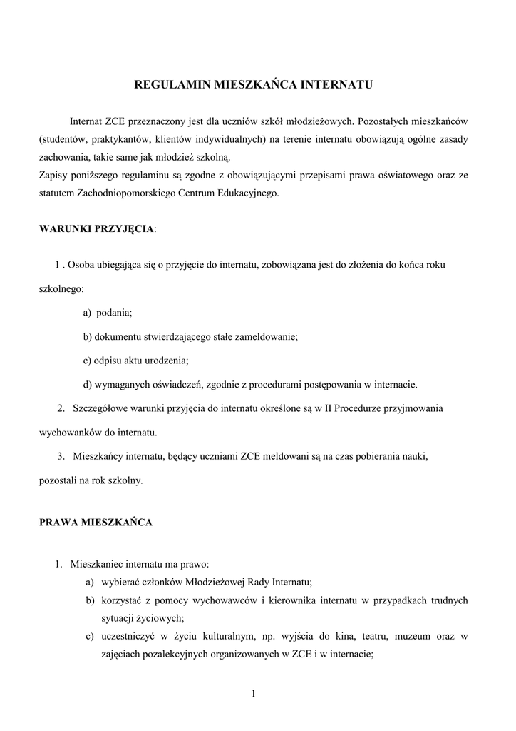 REGULAMIN MIESZKAŃCA INTERNATU Internat ZCE przeznaczony jest dla uczniów szkół młodzieŜowych. Pozostałych mieszkańców (studentów, praktykantów, klientów indywidualnych) na terenie internatu obowiązują ogólne zasady zachowania, takie same jak młodzieŜ szkolną. Zapisy poniŜszego regulaminu są zgodne z obowiązującymi przepisami prawa oświatowego oraz ze statutem Zachodniopomorskiego Centrum Edukacyjnego. WARUNKI PRZYJĘCIA: 1 . Osoba ubiegająca się o przyjęcie do internatu, zobowiązana jest do złoŜenia do końca roku szkolnego: a) podania; b) dokumentu stwierdzającego stałe zameldowanie; c) odpisu aktu urodzenia; d) wymaganych oświadczeń, zgodnie z procedurami postępowania w internacie. 2. Szczegółowe warunki przyjęcia do internatu określone są w II Procedurze przyjmowania wychowanków do internatu. 3. Mieszkańcy internatu, będący uczniami ZCE meldowani są na czas pobierania nauki, pozostali na rok szkolny. PRAWA MIESZKAŃCA 1. Mieszkaniec internatu ma prawo: a) wybierać członków MłodzieŜowej Rady Internatu; b) korzystać z pomocy wychowawców i kierownika internatu w przypadkach trudnych sytuacji Ŝyciowych; c) uczestniczyć w Ŝyciu kulturalnym, np. wyjścia do kina, teatru, muzeum oraz w zajęciach pozalekcyjnych organizowanych w ZCE i w internacie; 1 d) w uzasadnionych przypadkach wyjechać do domu w środku tygodnia po uzgodnieniu z wychowawcą oraz, w przypadku gimnazjalistów, po zwolnieniu przez rodziców lub opiekunów; e) pozostać w internacie na sobotę i niedzielę po uprzednim poinformowaniu wychowawcy internatu; f) zgłaszać do Rady Internatu, kierownika i wychowawców własne pomysły dotyczące organizacji Ŝycia w internacie; g) korzystać z urządzeń rekreacyjno – sportowych internatu i ZCE, w przypadku gimnazjalisty za zgodą trenera i wyłącznie pod opieką wychowawcy internatu; h) przyjmować gości w godzinach nie naruszających porządku dnia; ograniczenie to nie dotyczy spotkań z rodzicami i opiekunami, z zastrzeŜeniem ciszy nocnej obowiązującej w godz. 22.00 – 7.00; i) korzystać ze sprzętu RTV do godziny 21.30 , w sposób nie utrudniający pobytu innym mieszkańcom internatu; j) korzystać w wyznaczonych godzinach z sali cichej nauki i pracowni komputerowych. 2. Zwrot naleŜności za niewykorzystane posiłki przysługuje wychowankom w przypadku nieobecności w internacie spowodowanej: a) zwolnieniem lekarskim; b) wyjazdem na imprezy sportowe; c) wezwaniem do sądu; d) wezwaniem WKU; e) zdarzeniem losowym; * przewidywana nieobecność powinna być zgłoszona wychowawcy oraz kierownikowi stołówki dwa dni przed wyjazdem. OBOWIĄZKI MIESZKAŃCA 1. Mieszkaniec internatu ma obowiązek: a) zapoznać się z regulaminem internatu i bezwzględnie go przestrzegać; b) przestrzegać przepisów BHP i ppoŜ. uszczegółowionych w instrukcji korzystania z internatu oraz procedurach postępowania; c) wykupić posiłki w internacie – potwierdzeniem zakupu jest bon Ŝywieniowy; d) dbać o mienie własne, kolegów i internatu; e) ponosić pełną odpowiedzialność finansową za zniszczone mienie, w ostatnim miesiącu pobytu w internacie zdać czysty pokój; 2 f) utrzymywać ład i porządek w zajmowanych i uŜytkowanych pomieszczeniach oraz wokół budynku internatu; g) dbać o własne zdrowie i nie stwarzać sytuacji zagroŜenia zdrowia i Ŝycia własnego oraz pozostałych mieszkańców; h) okazywać szacunek wychowawcom internatu oraz innym pracownikom ZCE; i) terminowo regulować opłaty za internat i wyŜywienie (zgodnie z XIII Procedurą); j) wykonywać prace na rzecz internatu; k) przestrzegać zakazu palenia papierosów, picia alkoholu i uŜywania narkotyków pod rygorem usunięcia z internatu; l) pełnić dyŜury (zgodnie z regulaminem dyŜurów oraz XV Procedurą). 2. Wychowanek odpowiada za otrzymany klucz do swojego pokoju, w przypadku zagubienia dorabia go na własny koszt. 3. W czwartki odbywa się generalne sprzątanie pokoi. 4. W przypadku rezygnacji z internatu wychowanek ma obowiązek: a/ złoŜenia podania; b/ rozliczenia stanu pokoju /w obecności współmieszkańców/ i pokrycia kosztów ewentualnych zniszczeń; c/ uregulowania naleŜności; d/ złoŜenia druku wymeldowania. 5. Wychowanek jest odpowiedzialny za bon Ŝywieniowy, w przypadku jego zagubienia traci prawo do korzystania z posiłków /gimnazjaliści mogą zdeponować bony u wychowawców i pobierać je kaŜdego dnia/. NAGRODY I KARY 1. Mieszkaniec internatu w przypadku wzorowego zachowania moŜe otrzymać następujące nagrody: a) pochwałę wychowawcy; b) pochwałę kierownika wobec innych mieszkańców; c) powiadomienie wychowawcy klasy o wzorowym zachowaniu; d) powiadomienie trenera i rodziców o wzorowym zachowaniu; e) list pochwalny dyrektora ZCE do rodziców i władz klubowych; f) nagrodę rzeczową. 2. Mieszkaniec internatu moŜe otrzymać nagrodę za utrzymywanie porządku w pokoju, zgodnie z regulaminem konkursu czystości. 3 3. W przypadku nieprzestrzegania obowiązków wynikających z regulaminu mieszkaniec internatu będzie podlegał następującym karom regulaminowym: a) upomnienie wychowawcy; b) nagana wychowawcy oraz powiadomienie trenera (w przypadku sportowca); c) upomnienie kierownika internatu i powiadomienie rodziców; d) nagana kierownika internatu; e) nagana z-cy dyr. ZCE ds.SM f) nagana dyrektora ZCE; g) usunięcie (na czas określony lub nieokreślony) z internatu; h) w szczególnych wypadkach Zespół Wychowawczy ma prawo ustalić karę indywidualnie na określony czas. 4. Mieszkaniec moŜe być usunięty z internatu z pominięciem kar regulaminowych za: a) naruszenie godności osobistej wychowanków i wychowawców; b) stosowanie przemocy fizycznej wobec kolegów; c) przebywanie w stanie nietrzeźwym na terenie szkoły i internatu; d) zaŜywanie lub rozprowadzanie narkotyków; e) dokonywanie kradzieŜy. 5. Zespół Wychowawczy internatu wnioskuje w sprawie nagradzania i udzielania kar wychowankom internatu. 6. W p