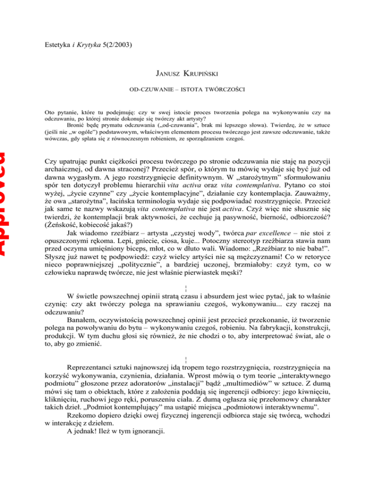 Approved Estetyka i Krytyka 5(2/2003) JANUSZ KRUPIŃSKI OD-CZUWANIE – ISTOTA TWÓRCZOŚCI Oto pytanie, które tu podejmuję: czy w swej istocie proces tworzenia polega na wykonywaniu czy na odczuwaniu, po której stronie dokonuje się twórczy akt artysty? Bronić będę prymatu odczuwania („od-czuwania”, brak mi lepszego słowa). Twierdzę, że w sztuce (jeśli nie „w ogóle”) podstawowym, właściwym elementem procesu twórczego jest zawsze odczuwanie, także wówczas, gdy splata się z równoczesnym robieniem, ze sporządzaniem czegoś. Czy upatrując punkt ciężkości procesu twórczego po stronie odczuwania nie staję na pozycji archaicznej, od dawna straconej? Przecież spór, o którym tu mówię wydaje się być już od dawna wygasłym. A jego rozstrzygnięcie definitywnym. W „starożytnym” sformułowaniu spór ten dotyczył problemu hierarchii vita activa oraz vita contemplativa. Pytano co stoi wyżej, „życie czynne” czy „życie kontemplacyjne”, działanie czy kontemplacja. Zauważmy, że owa „starożytna”, łacińska terminologia wydaje się podpowiadać rozstrzygnięcie. Przecież jak same te nazwy wskazują vita contemplativa nie jest activa. Czyż więc nie słusznie się twierdzi, że kontemplacji brak aktywności, że cechuje ją pasywność, bierność, odbiorczość? (Żeńskość, kobiecość jakaś?) Jak wiadomo rzeźbiarz – artysta „czystej wody”, twórca par excellence – nie stoi z opuszczonymi rękoma. Lepi, gniecie, ciosa, kuje... Potoczny stereotyp rzeźbiarza stawia nam przed oczyma umięśniony biceps, młot, co w dłuto wali. Wiadomo: „Rzeźbiarz to nie baba!”. Słyszę już nawet tę podpowiedź: czyż wielcy artyści nie są mężczyznami! Co w retoryce nieco poprawniejszej „politycznie”, a bardziej uczonej, brzmiałoby: czyż tym, co w człowieku naprawdę twórcze, nie jest właśnie pierwiastek męski? ¦ W świetle powszechnej opinii stratą czasu i absurdem jest wiec pytać, jak to właśnie czynię: czy akt twórczy polega na sprawianiu czegoś, wykonywaniu... czy raczej na odczuwaniu? Banałem, oczywistością powszechnej opinii jest przecież przekonanie, iż tworzenie polega na powoływaniu do bytu – wykonywaniu czegoś, robieniu. Na fabrykacji, konstrukcji, produkcji. W tym duchu głosi się również, że nie chodzi o to, aby interpretować świat, ale o to, aby go zmienić. ¦ Reprezentanci sztuki najnowszej idą tropem tego rozstrzygnięcia, rozstrzygnięcia na korzyść wykonywania, czynienia, działania. Wprost mówią o tym teorie „interaktywnego podmiotu” głoszone przez adoratorów „instalacji” bądź „multimediów” w sztuce. Z dumą mówi się tam o obiektach, które z założenia poddają się ingerencji odbiorcy: jego kiwnięciu, kliknięciu, ruchowi jego ręki, poruszeniu ciała. Z dumą ogłasza się przełomowy charakter takich dzieł. „Podmiot kontemplujący” ma ustąpić miejsca „podmiotowi interaktywnemu”. Rzekomo dopiero dzięki owej fizycznej ingerencji odbiorca staje się twórcą, wchodzi w interakcję z dziełem. A jednak! Ileż w tym ignorancji. Approved Jak gdyby tworzenie polegało na dokonywaniu jakichś fizycznych zmian, na oddziaływaniu i działaniu. Jak gdyby rzeczywiście stała przed nami taka alternatywa: albo zmieniać albo interpretować – jak gdyby dążenie do zmiany i jej kierunek nie były efektem interpretacji. ¦ Jeden jeszcze Nietzsche to wiedział, że: „My, myśląco-odczuwający jesteśmy tymi, którzy naprawdę i nieustannie coś c z y n i ą”, czego ludzie działający, „tak zwani ludzie praktyczni (nasi aktorzy, jak się rzekło) ustawicznie się uczą, ćwiczą w niem, przekładają je na ciało i rzeczywistość, nawet codzienność”1 . Wiedział też, że „myśląco-odczuwający” zazwyczaj sami nie zdają sobie sprawy z tej własnej vis creativa. Mylił się, jak sądzę, nazywając ich czyn „zmyśleniem”. ¦ Żałować można, że dzisiaj tak wielu artystów ulega retoryce działania, a nawet pojmuje swe wysiłki w duchu tej kategorii (charakterystycznej dla ideału mocy twórczej). Jako manipulację, eksperyment, rachunek... Waga, jaką się przywiązuje dzisiaj do takich pojęć jak „działania plastyczne” bądź „działania wizualne” jest znakiem czasu. Niestety, pojęcia te dzielą wspólne przesłanki z twierdzeniem, iż „artyści są inżynierami dusz” (Stalin), z potraktowaniem dzieła sztuki jako maszyny wizualnej do produkcji stanów psychicznych, jako instrumentu oddziaływań na odbiorcę – pola bodźców wrażających się w zmysły/mózg/umysł w sposób wywołujący pożądane/określone postawy/reakcje... ¦ Wbrew pozorom para ręka i oko nie jest jeszcze jednym wariantem dyskutowanego tu przeciwstawienia: robienia i odczuwania. Ślepa ręka, czyli nie odczuwająca, nic nie tworzy. Co najwyżej coś wyrabia i rozrabia. W rzeczywistości tak cenny przecież ślad ręki artysty, pozostawiony przezeń w dziełach, jest cenny właśnie dlatego, że przenosi jego sposób odczuwania... Osąd – tak akceptacji lub nie negacji – jest sprawą odczucia. Także oko formuje, a ręka widzi (nie tylko dotykając, ale także, na przykład, rysując). ¦ Kult prymatu działania mógł wyrosnąć tylko na gruncie ignorancji. Naiwnego wyobrażenia, że widzenie, szerzej: spostrzeganie, ostatecznie: odczuwanie polega na rejestracji, odbijaniu, przyjmowaniu informacji... Na ignorancji, która nie zna twórczego charakteru ludzkiego spojrzenia. Na mniemaniu, iż świat mówi sam za siebie – a przynajmniej, że przemówi, jeśli zmusi go do tego twardy chwyt ręki. W kult działania może popadać tylko ktoś, kto nawet nie wie, nie uświadamia sobie, iż odczuwa – że świat, w który chce ingerować jest tylko produktem jego sposobu odczuwania. Że żyje w świecie odczuwanym, to jest takim, jakim ukazuje się w jego odczuciu. Kto uważa, że ma przed sobą jak w dłoni, uchwytną, definitywną, osta