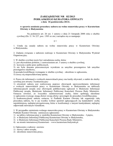 ZARZĄDZENIE NR 82/2013 PODLASKIEGO KURATORA OŚWIATY z dnia 10 października 2013r. w sprawie ustalenia procedury naboru na wolne stanowiska pracy w Kuratorium Oświaty w Białymstoku Na podstawie art. 26 ust. 1 ustawy z dnia 21 listopada 2008 roku o służbie cywilnej (Dz. U. Nr 227, poz. 1505 ze zm.) zarządza się co następuje: §1 1. Ustala się zasady naboru na wolne stanowiska pracy w Kuratorium Oświaty w Białymstoku. 2. Zadania związane z naborem realizuje w Kuratorium Oświaty w Białymstoku Wydział Organizacyjny. 3. W służbie cywilnej może być zatrudniona osoba, która: 1) jest obywatelem polskim, z zastrzeżeniem art. 5 ustawy o służbie cywilnej, 2) korzysta z pełni praw publicznych, 3) nie była skazana prawomocnym wyrokiem za umyślne przestępstwo lub umyślne przestępstwo skarbowe, 4) posiada kwalifikacje wymagane w służbie cywilnej – określone w ogłoszeniu, 5) cieszy się nieposzlakowaną opinią. 4. Prawo do informacji o wolnych stanowiskach pracy ma każdy obywatel, a nabór do służby cywilnej jest otwarty i konkurencyjny: 1) otwartość naboru jest realizowana poprzez obowiązek upowszechniania informacji o wolnych stanowiskach pracy w Kuratorium Oświaty w Białymstoku na tablicach informacyjnych urzędu oraz obowiązek publikowania ogłoszeń w Biuletynie Informacji Publicznej urzędu, Biuletynie Informacji Publicznej Kancelarii Prezesa Rady Ministrów. Oznacza również, że wszystkie zainteresowane osoby, które spełniają określone w ogłoszeniu wymogi, mogą złożyć swoją ofertę i przystąpić do procedury kwalifikacyjnej, 2) konkurencyjność naboru oznacza, iż Podlaski Kurator Oświaty tak organizuje całą procedurę naboru, by w jej wyniku wybrać spośród zgłaszających się kandydatów osobę najzdolniejszą, najlepiej przygotowaną, która w konfrontacji z innymi kandydatami, najlepiej odpowiada stawianym warunkom. 5. W przypadku zaistnienia wolnego stanowiska pracy w Kuratorium Oświaty w Białymstoku Podlaski Kurator Oświaty zamieszcza ogłoszenie: 1) na tablicy informacyjnej w siedzibie Kuratorium Oświaty w Białymstoku – I piętro, 2) w Biuletynie Informacji Publicznej Kuratorium Oświaty w Białymstoku, 3) w Biuletynie Informacji Publicznej Kancelarii Prezesa Rady Ministrów, 4) na stronie internetowej Kuratorium – www.kuratorium.bialystok.pl. 6. Ogłoszenie o naborze zawiera: 1) nazwę i adres urzędu, 2) określenie stanowiska pracy, 3) wymagania związane ze stanowiskiem pracy zgodnie z opisem danego stanowiska, ze wskazaniem, które z nich są niezbędne, a które dodatkowe, 4) zakres zadań wykonywanych na stanowisku pracy, 5) informację o warunkach pracy na danym stanowisku pracy, 6) informację, czy w miesiącu poprzedzającym datę upublicznienia ogłoszenia wskaźnik zatrudnienia osób niepełnosprawnych w urzędzie, w rozumieniu przepisów o rehabilitacji zawodowej i społecznej oraz o zatrudnieniu osób niepełnosprawnych, wynosi co najmniej 6%, 7) wskazanie wymaganych dokumentów, 8) termin i miejsce składania dokumentów. 7. Ogłoszenie może zawierać informacje o konieczności złożenia innych dokumentów i oświadczeń, w tym dokumentu potwierdzającego niepełnosprawność. 8. Przez wymagania niezbędne rozumie się wymagania konieczne do podjęcia pracy na danym stanowisku pracy. Wymagania dodatkowe to pozostałe wymagania pozwalające na optymalne wykonywanie zadań na danym stanowisku pracy. 9. Kandydat, który zamierza skorzystać z uprawnienia, o którym mowa w § 3 ust. 2, jest obowiązany do złożenia, wraz z dokumentami, kopii dokumentu potwierdzającego niepełnosprawność. 10. Informacja o warunkach pracy, o której mowa w ust. 6 pkt 5 powinna zawierać w szczególności warunki dotyczące charakteru pracy na danym stanowisku i sposobu wykonywania zadań, a także miejsca i otoczenia organizacyjno-technicznego stanowiska pracy. 11. Ogłoszenia o wolnych stanowiskach pracy w Kuratorium Oświaty zamieszcza się w Biuletynie Informacji Publicznej Kancelarii Prezesa Rady Ministrów drogą elektroniczną za pomocą formularzy umieszczonych na stronie http://bip.kprm.gov.pl/ 12. Termin do składania dokumentów, określony w ogłoszeniu o naborze, nie może być krótszy niż 10 dni, a dla ogłoszenia o naborze w celu zastępstwa nieobecnego członka korpusu służby cywilnej - 5 dni od dnia opublikowania tego ogłoszenia w Biuletynie Kancelarii Prezesa Rady Ministrów. 13. Oferty pracy na wolne stanowisko można przesłać listem z dopiskiem „Oferta pracy w służbie cywilnej” na adres Kuratorium Oświaty w Białymstoku, ul. Rynek Kościuszki 9 lub złożyć osobiście w sekretariacie – pokój nr 204, I piętro w określonym w ogłoszeniu terminie. 14. Wszystkie oferty, które są kompletne i spełniają wymagania biorą udział w procedurze kwalifikacyjnej. 15. Procedurę kwalifikacyjną naboru na wolne stanowiska pracy w Kuratorium Oświaty w Białymstoku przeprowadza komisja minimum 3-osobowa, powołana zarządzeniem Podlaskiego Kuratora Oświaty. §2 1. Procedura kwalifikacyjna składa się z dwóch etapów: 1) I etap: a) dokonanie wstępnej selekcji złożonych ofert, która polega na analizie, czy kandydaci złożyli wymagane dokumenty i czy spełniają wszystkie wymogi niezbędne zamieszczone w ogłoszeniu, b) sporządzenie listy kandydatów spełniających wszystkie wymogi niezbędne zawarte w ogłoszeniu i przedłożenie jej Podlaskiemu Kuratorowi do akceptacji, c) zamieszczenie na stronach internetowych Kuratorium Oświaty w Białymstoku i tablicy informacyjnej w siedzibie urzędu – I piętro, listy kandydatów spełniających wymagania określone w ogłoszeniu o naborze. Lista zawiera imię i nazwisko kandydata oraz jego miejsce zamieszkania (w rozumieniu przepisów Kodeksu cywilnego), d) powiadomienie pisemne, telefoniczne lub pocztą elektroniczną osób spełniających wymagania o terminie przeprowadzenia testu wiedzy, e) przeprowadzenie testu jednokrotnego wyboru sk