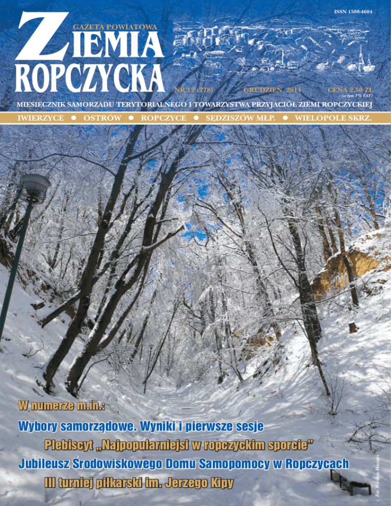 IEMIA Z ROPCZYCKA ISSN 1508-4604 GAZETA POWIATOWA NR 12 (278) GRUDZIEŃ 2014 CENA 2,50 ZŁ (w tym 5% VAT) MIESIĘCZNIK SAMORZĄDU TERYTORIALNEGO I TOWARZYSTWA PRZYJACIÓŁ ZIEMI ROPCZYCKIEJ IWIERZYCE l OSTRÓW l ROPCZYCE l SĘDZISZÓW MŁP. l WIELOPOLE SKRZ. W numerze m.in.: Wybory samorządowe. Wyniki i pierwsze sesje Jubileusz Środowiskowego Domu Samopomocy w Ropczycach III turniej piłkarski im. Jerzego Kipy Fot. Wiesław Maziarz Plebiscyt „Najpopularniejsi w ropczyckim sporcie” ROPCZYCE SPIS TREŚCI WIEŚCI Z MAGISTRATU ......................................................................4-5 OBRADOWAŁA RADA MIEJSKA .............................................6-7 • 60. sesja Rady Miejskiej w Ropczycach • 1. sesja Rady Miejskiej w Ropczycach SPOŁECZEŃSTWO I GOSPODARKA .....................................8-12 • Wyniki wyborów do Rady Miejskiej w Ropczycach • Pierwsza sesja Rady Powiatu • Informacja z Biura Powiatowego ARiMR w Ropczycach • Dni honorowego krwiodawstwa • Nowe komisje Rady Miejskiej w Ropczycach • Jubileusz Środowiskowego Domu Samopomocy w Ropczycach I sesja Rady Miejskiej w Ropczycach 27 listopada br. w Centrum Kultury im. Józefa Mehoffera odbyła się inauguracyjna sesja VII kadencji Rady Miejskiej w Ropczycach. Uroczystość zgromadziła przedstawicieli firm i zakładów pracy, służb mundurowych, duchowieństwa oraz dyrektorów placówek oświatowych i kierownictwo urzędu. Szczegóły na str. 7 MIEJSKA I POWIATOWA BIBLIOTEKA PUBLICZNA W ROPCZYCACH ...................................................................13-15 • Biblioteka poleca • Zakup nowości książkowych • Przypomnij sobie bohaterów z dzieciństwa • Miękki, puchaty i taki z łatką CENTRUM KULTURY IM. JÓZEFA MEHOFFERA W ROPCZYCACH ...................................................................15-17 • Wyróżnienie dla VEGI • Spotkania z pasjami. Ewa Bem • Czasem słońce, czasem deszcz • Ropczyce pomagają Gabrysi Z PRZEDSZKOLI I SZKÓŁ GMINY ROPCZYCE ....................18-21 • Koszałku Opałku, gdzie jesteś? • Jesienny bal w przedszkolu w Lubzinie • Światowy dzień pluszowego misia • Pasowanie na przedszkolaka • Biwak harcerski w Małej Od lewej radni: Dariusz Mormol, Arkadiusz Bęben, Zbigniew Nowacki, Jan Gorczyca oraz burmistrz Bolesław Bujak i z-ca burmistrza Robert Kuraszkiewicz ZESPÓŁ SZKÓŁ AGRO-TECHNICZNYCH W ROPCZYCACH ...20 ROPCZYCE • Wyruszyli do Portugalii • 11 lat promocji zdrowia ZESPÓŁ SZKÓŁ W ROPCZYCACH .......................................24-25 • Spotkanie z regionalną poetką • WF z klasą • Koncert „Gramy i z serca pomagamy” • Olimpiada wiedzy i umiejętności budowlanych • Eko-dom LICEUM OGÓLNOKSZTAŁCĄCE W ROPCZYCACH ............25-26 • Lubią matematyczne wyzwania • Międzynarodowy sukces Justyny Toton WIADOMOŚCI Z GMINY OSTRÓW ...........................................26 • Śniadanie daje moc WIADOMOŚCI Z GMINY WIELOPOLE SKRZYŃSKIE ..............27 • III turniej piłkarski im. Jerzego Kipy • Seniorzy na wycieczce Fot. Piotr Skałuba Nowe komisje Rady Miejskiej w Ropczycach Podczas II sesji Rady Miejskiej w Ropczycach, która odbyła się 5 grudnia, zostały powołane stałe komisje Rady Miejskiej oraz ich przewodniczący. Komisje Rady pozostają pod kontrolą Rady, której składają sprawozdania ze swej działalności. Ich rolą jest m.in. opiniowanie projektów uchwał Rady oraz stała praca merytoryczna i koncepcyjna w zakresie spraw, do których zostały powołane. Warto dodać, że każdy radny może być członkiem najwyżej dwóch komisji stałych. Ciąg dalszy na str. 10 TO I OWO ................................................................................28-35 • Kremy na zimę i mróz • Strach ma wielkie oczy • Skąd bierze się rwa kulszowa? • Kuchnia na wesoło • Tradycyjne potrawy wigilijne i bożonarodzeniowe • Wigilijne i bożonarodzeniowe tradycje w Polsce • Świąteczny humor • Choinka knezia • Temperatura… PTTK ROPCZYCE ........................................................................36 • Turystyka łączy pokolenia WIADOMOŚCI SPORTOWE .................................................37-41 • Drużynowy tenis stołowy • Niepodległościowy turniej karate • Turniej koszykówki dziewcząt i chłopców • Zawody pływackie o puchar burmistrza • Turniej firm i zakładów pracy • Halowy turniej piłki nożnej klas V • IX Plebiscyt „Najpopularniejsi w Ropczyckim Sporcie - 2014” IEMIA Z ROPCZYCKA GAZETA POWIATOWA Fot. Piotr Skałuba Radni podczas obrad Wydawca: Towarzystwo Przyjaciół Ziemi Ropczyckiej w Ropczycach. Nakład: 1200 egz. Zespół redakcyjny: Teresa Kiepiel – red. nacz., Elżbieta Kosydar, Agnieszka Szela, Edyta Pazdan, Piotr Skałuba, Jolanta Kaszowska, Marcin Świerad – red. Wielopole Skrz. Współpracują: Katarzyna Sikora, Maria Wójcik, Barbara Traciak (Sędziszów Młp.). Adres redakcji: ul. Bursztyna 1, 39-100 Ropczyce. Dyżury redakcyjne: czwartek w godz. 10.00-12.00 w Centrum Kultury tel. 17 22-18-228. Redakcja zastrzega sobie prawo skracania nadsyłanych tekstów. Za treść poszczególnych artykułów odpowiadają ich autorzy. Druk: Drukarnia „Duet”, tel. 17 87-11-281. Reklamy prosimy przesyłać na e-mail: [email protected], [email protected] www.gazeta-ziemiaropczycka.pl Miesięcznik Powiatowy „Ziemia Ropczycka” jest członkiem Polskiego Stowarzyszenia Prasy Lokalnej Na zbliżające się święta życzymy Czytelnikom Ziemi Ropczyckiej przeżywania Bożego Narodzenia w zdrowiu, radości i cieple rodzinnej atmosfery. Nadchodzący 2015 rok niech będzie dla Wszystkich czasem pokoju oraz realizacji osobistych zamierzeń. Redakcja i Zarząd TPZR Serdeczne życzenia ciepłych i rodzinnych Świąt Bożego Narodzenia, życzliwości i niezapomnianych chwil spędzonych w gronie najbliższych. Wszelkiej pomyślności i wytrwałości w realizacji planów w nadchodzącym Nowym Roku, b
