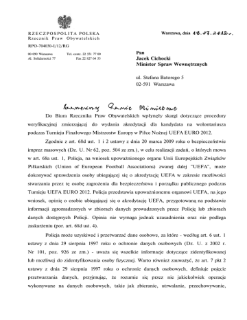 RZECZPOSPOLITA POLSKA Rzecznik Praw Obywatelskich RPO-704030-I/12/RG 00-090 Warszawa Al. Solidarności 77 Tel. centr. 22 551 77 00 Fax 22 827 64 53 Pan Jacek Cichocki Minister Spraw Wewnętrznych ul. Stefana Batorego 5 02-591 Warszawa Do Biura Rzecznika Praw Obywatelskich wpłynęły skargi dotyczące procedury weryfikacyjnej zmierzającej do wydania akredytacji dla kandydata na wolontariusza podczas Turnieju Finałowego Mistrzostw Europy w Piłce Nożnej UEFA EURO 2012. Zgodnie z art. 68d ust. 1 i 2 ustawy z dnia 20 marca 2009 roku o bezpieczeństwie imprez masowych (Dz. U. Nr 62, poz. 504 ze zm.), w celu realizacji zadań, o których mowa w art. 68a ust. 1, Policja, na wniosek upoważnionego organu Unii Europejskich Związków Piłkarskich (Union of European Football Associations) zwanej dalej "UEFA", może dokonywać sprawdzenia osoby ubiegającej się o akredytację UEFA w zakresie możliwości stwarzania przez tę osobę zagrożenia dla bezpieczeństwa i porządku publicznego podczas Turnieju UEFA EURO 2012. Policja przedstawia upoważnionemu organowi UEFA, na jego wniosek, opinię o osobie ubiegającej się o akredytację UEFA, przygotowaną na podstawie informacji zgromadzonych w zbiorach danych prowadzonych przez Policję lub zbiorach danych dostępnych Policji. Opinia nie wymaga jednak uzasadnienia oraz nie podlega zaskarżeniu (por. art. 68d ust. 4). Policja może uzyskiwać i przetwarzać dane osobowe, za które - według art. 6 ust. 1 ustawy z dnia 29 sierpnia 1997 roku o ochronie danych osobowych (Dz. U. z 2002 r. Nr 101, poz. 926 ze zm.) - uważa się wszelkie informacje dotyczące zidentyfikowanej lub możliwej do zidentyfikowania osoby fizycznej. Warto również zauważyć, że art. 7 pkt 2 ustawy z dnia 29 sierpnia 1997 roku o ochronie danych osobowych, definiuje pojęcie przetwarzania danych, przyjmując, że rozumie się przez nie jakiekolwiek operacje wykonywane na danych osobowych, takie jak zbieranie, utrwalanie, przechowywanie, 2 opracowywanie, zmienianie, udostępnianie i usuwanie, a zwłaszcza te, które wykonuje się w systemach informatycznych. Informacje mogą dotyczyć m.in. osób mogących stwarzać zagrożenie dla bezpieczeństwa i porządku publicznego. W ocenie Rzecznika Praw Obywatelskich niepokojący jest fakt braku jakichkolwiek kryteriów uznania danej osoby za osobę "mogącą stwarzać zagrożenie dla bezpieczeństwa i porządku publicznego". Wydaje się, że na tej podstawie funkcjonariusze Policji będą mogli pobierać, uzyskiwać, gromadzić, przetwarzać, sprawdzać i wykorzystywać informacje, o jakich mowa w art. 20 ust. 2b ustawy z dnia 6 kwietnia 1990 roku o Policji (Dz. U. z 2011 r. Nr 287, poz. 1687 ze zm.), w sposób całkowicie arbitralny, ponieważ ustawodawca nie precyzuje tej kategorii osób. Otwartość zakresu oraz brak definicji pojęcia osoby mogącej stwarzać zagrożenie dla bezpieczeństwa i porządku publicznego może prowadzić do naruszeń konstytucyjnego prawa do prywatności. Procedura weryfikacyjna miała na celu przekazanie przez Policję do UEFA stanowiska zawierającego rekomendację lub brak rekomendacji odnośnie do przyznania akredytacji. Działania takie pozwalają ograniczyć dostęp do określonych przez UEFA stref osobom, które w opinii Policji nie powinny mieć do nich dostępu. Umożliwienie przekazywania takich opinii z pewnością przyczyni się do zwiększenia poziomu bezpieczeństwa przeprowadzenie tej imprezy. W odpowiedniego ramach police sprawdzenia screening osoby oraz zadaniem wydanie, Policji jest na wniosek upoważnionego organu UEFA, opinii o niej. Policja formułuje opinię jedynie na podstawie informacji już posiadanych, a mianowicie zgromadzonych w zbiorach danych prowadzonych przez Policję lub zbiorach danych dostępnych Policji, np. w Krajowym Systemie Informacji Policji (KSIP), Krajowym Centrum Informacji Kryminalnych. Ostateczną decyzję w przedmiocie przyznania albo nieprzyznania akredytacji podejmuje upoważniony organ UEFA. W komentowanej procedurze wątpliwości Rzecznika budzi przepis dotyczący treści opinii. Zgodnie z art. 68d ust. 3 ustawy z dnia 20 marca 2009 roku o bezpieczeństwie imprez masowych - opinia zawiera jedynie imię i nazwisko osoby ubiegającej się o akredytację UEFA, serię i numer dokumentu tożsamości tej osoby, przekazane przez upoważniony organ UEFA, oraz rekomendację albo brak rekomendacji Policji do przyznania akredytacji UEFA. Zakaz zamieszczania w opinii dodatkowych informacji 3 powoduje, że nie mogą się w niej znaleźć żadne inne dane, np. tzw. dane wrażliwe (zob. art. 27 ust. 1 ustawy z dnia 29 sierpnia 1997 roku o ochronie danych osobowych). Warto w tym miejscu zauważyć, iż zarówno w toku prac nad projektem noweli ustawy o bezpieczeństwie imprez masowych, jak i w toku prac legislacyjnych wiele zastrzeżeń budzi fakt, że opinia Policji nie wymaga uzasadnienia i nie podlega zaskarżeniu. Na tej podstawie wysuwano wniosek, że opinia Policji ma charakter arbitralny i niedający się zweryfikować przez inny organ. W uzasadnieniu projektu ustawy (druk sejmowy nr 4281), odnosząc się do tej kwestii, stwierdzono, że "[...] zaproponowane rozwiązania były przedmiotem konsultacji z Generalnym Inspektorem Ochrony Danych Osobowych. W szczególności organ ochrony danych osobowych wskazywał, że nie jest do końca czytelny cel przedmiotowej regulacji, ponadto obciążona jest ona pewnego rodzaju arbitralnością działania organów władzy publicznej, w tym wypadku Policji, dlatego że wydawane przez Policję opinie - zgodnie z projektem - nie wymagają uzasadnienia oraz nie podlegają zaskarżeniu. Mając na uwadze zarzut pierwszy - brak czytelnego celu regulacji - przedstawiciele Ministerstwa Spraw Wewnętrznych i Administracji wskazali, że celem wspólnym dla władz Polski oraz dla UEFA jest ograniczenie dostępu do niektórych stref UEFA osób, które o taki wstęp będą się ubiegać, natomiast mogłyby stanowić zagrożenie bezpiecz