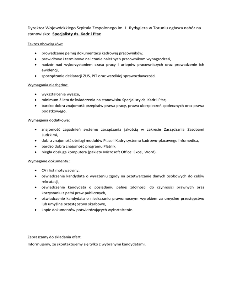 Dyrektor Wojewódzkiego Szpitala Zespolonego im. L. Rydygiera w Toruniu ogłasza nabór na stanowisko: Specjalisty ds. Kadr i Płac Zakres obowiązków: prowadzenie pełnej dokumentacji kadrowej pracowników, prawidłowe i terminowe naliczanie należnych pracownikom wynagrodzeń, nadzór nad wykorzystaniem czasu pracy i urlopów pracowniczych oraz prowadzenie ich ewidencji, sporządzanie deklaracji ZUS, PIT oraz wszelkiej sprawozdawczości. Wymagania niezbędne: wykształcenie wyższe, minimum 3 lata doświadczenia na stanowisku Specjalisty ds. Kadr i Płac, bardzo dobra znajomość przepisów prawa pracy, prawa ubezpieczeń społecznych oraz prawa podatkowego. Wymagania dodatkowe: znajomość zagadnień systemu zarządzania jakością w zakresie Zarządzania Zasobami Ludzkimi, dobra znajomość obsługi modułów Płace i Kadry systemu kadrowo-płacowego Infomedica, bardzo dobra znajomość programu Płatnik, biegła obsługa komputera (pakietu Microsoft Office: Excel, Word). Wymagane dokumenty : CV i list motywacyjny, oświadczenie kandydata o wyrażeniu zgody na przetwarzanie danych osobowych do celów rekrutacji, oświadczenie kandydata o posiadaniu pełnej zdolności do czynności prawnych oraz korzystaniu z pełni praw publicznych, oświadczenie kandydata o nieskazaniu prawomocnym wyrokiem za umyślne przestępstwo lub umyślne przestępstwo skarbowe, kopie dokumentów potwierdzających wykształcenie. Zapraszamy do składania ofert. Informujemy, że skontaktujemy się tylko z wybranymi kandydatami.