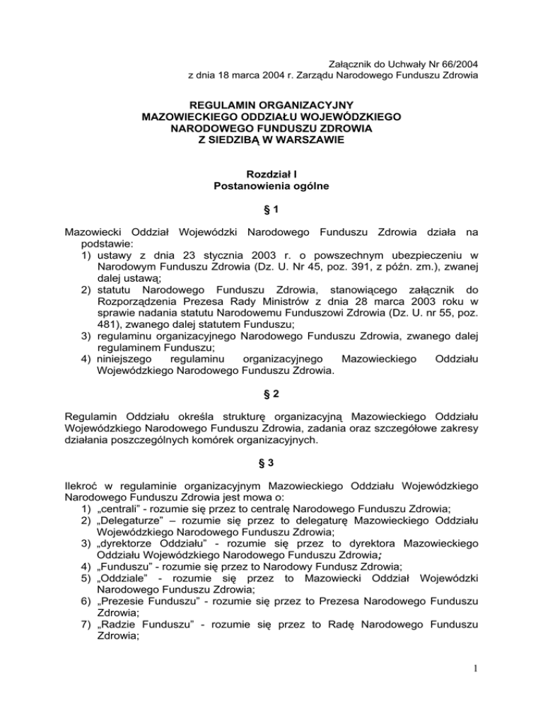 Załącznik do Uchwały Nr 66/2004 z dnia 18 marca 2004 r. Zarządu Narodowego Funduszu Zdrowia REGULAMIN ORGANIZACYJNY MAZOWIECKIEGO ODDZIAŁU WOJEWÓDZKIEGO NARODOWEGO FUNDUSZU ZDROWIA Z SIEDZIBĄ W WARSZAWIE Rozdział I Postanowienia ogólne §1 Mazowiecki Oddział Wojewódzki Narodowego Funduszu Zdrowia działa na podstawie: 1) ustawy z dnia 23 stycznia 2003 r. o powszechnym ubezpieczeniu w Narodowym Funduszu Zdrowia (Dz. U. Nr 45, poz. 391, z późn. zm.), zwanej dalej ustawą; 2) statutu Narodowego Funduszu Zdrowia, stanowiącego załącznik do Rozporządzenia Prezesa Rady Ministrów z dnia 28 marca 2003 roku w sprawie nadania statutu Narodowemu Funduszowi Zdrowia (Dz. U. nr 55, poz. 481), zwanego dalej statutem Funduszu; 3) regulaminu organizacyjnego Narodowego Funduszu Zdrowia, zwanego dalej regulaminem Funduszu; 4) niniejszego regulaminu organizacyjnego Mazowieckiego Oddziału Wojewódzkiego Narodowego Funduszu Zdrowia. §2 Regulamin Oddziału określa strukturę organizacyjną Mazowieckiego Oddziału Wojewódzkiego Narodowego Funduszu Zdrowia, zadania oraz szczegółowe zakresy działania poszczególnych komórek organizacyjnych. §3 Ilekroć w regulaminie organizacyjnym Mazowieckiego Oddziału Wojewódzkiego Narodowego Funduszu Zdrowia jest mowa o: 1) „centrali” - rozumie się przez to centralę Narodowego Funduszu Zdrowia; 2) „Delegaturze” – rozumie się przez to delegaturę Mazowieckiego Oddziału Wojewódzkiego Narodowego Funduszu Zdrowia; 3) „dyrektorze Oddziału” - rozumie się przez to dyrektora Mazowieckiego Oddziału Wojewódzkiego Narodowego Funduszu Zdrowia; 4) „Funduszu” - rozumie się przez to Narodowy Fundusz Zdrowia; 5) „Oddziale” - rozumie się przez to Mazowiecki Oddział Wojewódzki Narodowego Funduszu Zdrowia; 6) „Prezesie Funduszu” - rozumie się przez to Prezesa Narodowego Funduszu Zdrowia; 7) „Radzie Funduszu” - rozumie się przez to Radę Narodowego Funduszu Zdrowia; 1 8) „Radzie Społecznej” - rozumie się przez to Radę Społeczną Mazowieckiego Oddziału Wojewódzkiego Narodowego Funduszu Zdrowia; 9) „Zarządzie Funduszu” - rozumie się przez to Zarząd Narodowego Funduszu Zdrowia; 10) „przepisach o koordynacji” – rozumie się przez to przepisy o koordynacji systemów zabezpieczenia społecznego w zakresie udzielania rzeczowych świadczeń zdrowotnych określone w rozporządzeniu Nr 1408/71/EWG, rozporządzeniu nr 574/72/EWG oraz rozporządzeniu nr 859/2003/EWG. Rozdział II Zadania Oddziału §4 1. Do zakresu rzeczowego działania Oddziału należy, w szczególności: 1) przeprowadzanie konkursów ofert, rokowań i zawieranie umów o udzielanie świadczeń zdrowotnych, w zakresie zleconym przez Zarząd Funduszu; 2) rozliczanie ze świadczeniodawcami zawartych umów, w zakresie zleconym przez Zarząd Funduszu; 3) bieżąca kontrola umów zawarty ze świadczeniodawcami, w zakresie zleconym przez Zarząd Funduszu; 4) opracowywanie projektu wojewódzkiego planu zabezpieczenia świadczeń zdrowotnych i przekazywanie do centrali Funduszu; 5) opiniowanie wojewódzkiego planu zdrowotnego pod względem dostępności do świadczeń zdrowotnych i ciągłości ich udzielania ubezpieczonym; 6) przedstawianie propozycji zmian wojewódzkiego planu zdrowotnego w przypadku określonym w ustawie; 7) wnioskowanie o zmianę Krajowego Planu Zabezpieczenia Świadczeń Zdrowotnych w zakresie dotyczącym Oddziału; 8) gromadzenie oraz kontrola danych statystycznych pochodzących ze szczegółowych sprawozdań merytorycznych realizacji świadczeń zdrowotnych; 9) realizacja strategii i polityki informacyjnej Funduszu oraz regionalna informacja dla mediów; 10) wykonywania innych zadań zleconych przez Zarząd Funduszu. 1a. Oddział wykonuje zadania instytucji właściwej w rozumieniu przepisów o koordynacji, w tym dla osób pobierających emeryturę lub rentę, osób w stanie spoczynku pobierających uposażenie lub uposażenie rodzinne oraz osób pobierających uposażenie po zwolnieniu ze służby lub świadczenie pieniężne o takim samym charakterze, jeżeli osoby te nie mają miejsca zamieszkania na terytorium Rzeczpospolitej Polskiej; 2. Obszar działania Oddziału obejmuje powiaty: 1) grodziski 2) legionowski 3) nowodworski 4) otwocki 5) piaseczyński 2 6) pruszkowski 7) warszawski 8) warszawski zachodni 9) wołomiński 10) żyrardowski 11) miński - gmina Sulejówek 12) sochaczewski Rozdział III Organizacja Oddziału §5 1. Oddziałem kieruje dyrektor Oddziału. 2. Zastępcami dyrektora Oddziału są: a) zastępca dyrektora do spraw medycznych, b) zastępca dyrektora do spraw ekonomiczno-finansowych, c) zastępca dyrektora do spraw służb mundurowych. 2. Zastępcy dyrektora Oddziału, w sprawach związanych z realizacją zadań, podlegają dyrektorowi Oddziału. 4. Dyrektora Oddziału, w czasie jego nieobecności, zastępuje wyznaczony przez niego zastępca dyrektora. §6 1. W skład Oddziału – jako podstawowe komórki organizacyjne- wchodzą: 1) Biuro Dyrektora, 2) Wydział Organizacyjno-Prawny, 3) Zespół Radców Prawnych, 4) Wydział Spraw Ubezpieczonych, 5) Wydział Gospodarki Lekami, 6) Wydział Ekonomiczno-Finansowy; 7) Wydział Księgowości; 8) Wydział Spraw Pracowniczych i Szkoleń, 9) Wydział Świadczeń Zdrowotnych, 10) Wydział Kontroli Realizacji Umów ze Świadczeniodawcami, 11) Wydział Monitorowania Świadczeń Zdrowotnych, 12) Wydział ds. Służb Mundurowych, 13) Rzecznik Praw Pacjenta, 14) Wydział Informatyki i Łączności, 15) Wydział Administracyjny. 2. W strukturze podstawowych komórek organizacyjnych Oddziału mogą być tworzone działy, sekcje, sekretariaty, kancelarie oraz samodzielne stanowiska. 3. W Oddziale tworzy się Samodzielne stanowisko do spraw Audytu Wewnętrznego. §7 1. Wydziałem kieruje naczelnik wydziału. 3 2. Biurem Dyrektora kieruje kierownik biura, a Zespołem Radców Prawnych – koordynator Zespołu Radców Prawnych – radca prawny. 3. Komórkami organizacyjnymi tw