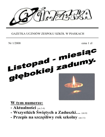 GAZETKA UCZNIÓW ZESPOŁU SZKÓŁ W PIASKACH Nr 1/2008 cena 1 zł W tym numerze: - Aktualności (str.3-4) - Wszystkich Świętych a Zaduszki… (str.6) - Przepis na szczęśliwy rok szkolny (str.11) Kilka słów od redakcji Cześć! Nazywam się Marta Piechocka i w tym roku szkolnym jestem redaktor naczelną „Gimzetki”. Razem z Martyną Żarnowską będziemy się starać, aby gazetka szkolna była jak najbardziej atrakcyjna. Mam nadzieję, że Wam czytelnikom spodobają się nasze działania. W tym, aby wszystko dobrze funkcjonowało pomagać mi będzie cały zespół redakcyjny i oczywiście pani Justyna Konieczna. Dziękuję, że zajrzeliście do naszej gazetki. Mam nadzieję, że będą się podobać kolejne numery i równie chętnie jak w zeszłym roku, sięgniecie po nie… Zachęcam też wszystkich umiejących pisać do współpracy z nami. Pozdrawiam i życzę udanego roku szkolnego Marta Skład redakcji: Marta Piechocka: redaktor naczelna, Martyna Żarnowska: zastępca redaktor naczelnej, Kuba Nowacki: skład komputerowy, Aneta Lis, Basia Przewoźna, Martyna Michalska, Weronika Skowrońska, Basia Nawrot, Weronika Lis, Ania Wujek, Monika Owsińska, Zuzia Olejniczak 2 AKTUALNOŚCI 1 września rozpoczął się rok szkolny. Tradycyjnie o godzinie 8.00 odbyła się msza święta. Później wszyscy udaliśmy się do szkoły, gdzie odbył się uroczysty apel. Do szkolnego grona pedagogicznego dołączyła s. Hiacynta – katechetka. Pod koniec ubiegłego roku szkolnego odbyły się wybory do nowej Rady Samorządu Szkolnego. Oto wyniki: Marta Dolatowska ~ przewodnicząca Krzysztof Dopierała ~ skarbnik Ania Turbańska ~ sekretarz Weronika Lis ~ sekcja „Szczęśliwy Numerek” Agnieszka Sikora i Marta Piechocka ~ sekcja rozrywkowa Zuzanna Janicka i Kasia Wujczak ~ sekcja dekoracyjna I : Aneta Lis, Hania Szczęsna, Mateusz Karolczak II : Agnieszka Owsińska, Sandra Łagódka, Bartek Dworczak ~ poczet sztandarowy 17 września uczniowie klas I gimnazjum uczestniczyli w wycieczce do Biskupina, gdzie odbywał się XIV Festyn Archeologiczny pod hasłem „Japonia, kraj nie tylko samurajów”. Można więc było zobaczyć pokazy japońskich sztuk walki, nauczyć się orgiami, poćwiczyć kaligrafię czy uczestniczyć w warsztatach sumo. 3 8 października odbył się pierwszy w tym roku szkolnym koncert. Mieliśmy okazję obejrzeć stroje i tańce ludowe oraz posłuchać ciekawej muzyki granej np. na koźle. 9 października odbyła się dyskoteka szkolna. Okazało się, że chyba jednak nikt nie lubi się bawić, ponieważ niewiele osób przyszło. Może następnym razem będzie nas więcej 24 października swoje święto mieli nasi najmłodsi koledzy. W auli szkolnej odbyło się uroczyste pasowanie na ucznia. Pierwszaki doskonale zaprezentowały się przed Dyrekcją, zaproszonymi gośćmi i rodzicami. Martynka & Wiki ;** 4 Sonda na temat kolczyków w uszach . Ilośd ankietowanych : 20 dziewczyn Coraz więcej ludzi nosi kolczyki. Staje się to pomału codziennością, noszenie kolczyków nie jest już postrzegane jako brak wychowania. Młodzi preferują kolczyki w innych miejscach niż tylko uszy, takich jak np. nos, język, czy też pępek. Często chłopacy kuszą się na kolczyk w uchu. To znak, że stają się one coraz modniejsze i nie są przeznaczone tylko dla dziewczyn. My nie mamy nic przeciwko temu, a Wy? Postanowiłyśmy też sprawdzid, jak popularne są kolczyki wśród naszych gimnazjalistek (wyniki powyżej). Marta&Martynka 5 Wszystkich Świętych a Zaduszki… Niedawno obchodziliśmy te dwa święta, ale niestety wydaje mi się, że wielu z was ciągle nie rozumie różnicy pomiędzy jednym a drugim świętem. A różnica jest i to zasadnicza. W dniu 1 listopada przypomina się nie tylko osoby oficjalnie uznane za święte i takimi ogłoszone, ale przede wszystkim wszystkich ludzi, których życie nacechowane było świętością. Jest to także dzień wszystkich, dla których celem jest życie prowadzące do zbawienia. Natomiast 2 listopada katolicy modlą się za ludzi wierzących w Chrystusa, którzy odeszli już z tego świata, a teraz przebywają w czyśćcu. Sądzę, że ciekawostką jest to, że dawniej zwyczaj zakazywał tego dnia wykonywania niektórych czynności, aby nie skaleczyć, nie rozgnieść czy w inny sposób nie znieważyć odwiedzającej dom duszy. Zakazane było: klepanie masła, deptanie kapusty, maglowanie, przędzenie i tkanie, cięcie sieczki itp. Anetkaaa 6 11 listopada - Święto Niepodległości Przed nami długi weekend, wszyscy cieszą się z możliwości odpoczynku, ale czy wszyscy wiedzą, dlaczego 11 listopada jest dniem wolnym od pracy? Warto jeszcze raz przypomnieć, że jest to najważniejsze święto państwowe obchodzone co roku na pamiątkę odzyskania przez Polskę niepodległości. 11 listopada 1918 roku w miejscowości Compiĕgne, na północny-wschód od Paryża, przedstawiciele Niemiec podpisali rozejm, który oznaczał zakończenie I wojny światowej. Dla innych narodów Święto Niepodległości jest okazją do manifestowania patriotyzmu, ciekawe ilu z nas wywiesi tego dnia flagę? Warto wiedzieć… - Dzień 11 listopada ustanowiono świętem narodowym dopiero ustawą z kwietnia 1937 roku, czyli prawie 20 lat po odzyskaniu niepodległości. - Podczas okupacji hitlerowskiej oraz w czasie rządów komunistycznych obchodzenie święta 11 listopada było zakazane. - Narodowe Święto Niepodległości obchodzone 11 listopada przywrócono 21 lutego 1989 roku - Główne obchody, z udziałem najwyższych władz państwowych, odbywają się w Warszawie na placu Józefa Piłsudskiego, przed Grobem Nieznanego Żołnierza. Anetkaaa 7 Wróżby andrzejkowe Każdy z was na pewno kiedyś brał udział we wróżbach andrzejkowych. Ale zapewne nie zawsze wiecie, skąd dana wróżba się wywodzi. Zanim jednak przejdziemy do wróżb, chciałabym napisać, skąd wzięło się samo święto. Niektórzy twierdzą, że pochodzi od św. Andrzeja, któ