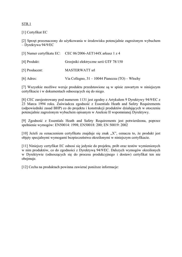 STR.1 [1] Certyfikat EC [2] Sprzęt przeznaczony do użytkowania w środowisku potencjalnie zagrożonym wybuchem – Dyrektywa 94/9/EC [3] Numer certyfikatu EC: CEC 06/2006-AET144X arkusz 1 z 4 [4] Produkt: Grzejniki elektryczne serii GTF 78/150 [5] Producent: MASTERWATT srl [6] Adres: Via Collegno, 31 – 10044 Pianezza (TO) – Włochy [7] Wszystkie możliwe wersje produktu przedstawione są w spisie zawartym w niniejszym certyfikacie i w dokumentach odnoszących się do niego. [8] CEC zarejestrowany pod numerem 1131 jest zgodny z Artykułem 9 Dyrektywy 94/9/EC z 23 Marca 1994 roku. Zaświadcza zgodność z Essentials Heath and Safety Requirements (odpowiedniki zasad BHP) co do projektu i konstrukcji produktów działających w otoczeniu potencjalnie zagrożonym wybuchem opisanym w Aneksie II wspomnianej Dyrektywy. [9] Zgodność z Essentials Heath and Safety Requirements jest potwierdzona, poprzez spełnienie wymogów: EN50014: 1998; EN50018: 200; EN 50019: 2002 [10] Jeżeli za oznaczeniem certyfikatu znajduje się znak „X”, oznacza to, że produkt jest objęty specjalnymi wymogami bezpieczeństwa określonymi w niniejszym certyfikacie. [11] Niniejszy certyfikat EC odnosi się jedynie do projektu, prób oraz testów wymienionych w nim produktów, co do zgodności z Dyrektywą 94/9/EC. Dalszych wymogów określonych w Dyrektywie (odnoszących się do procesu produkcyjnego i dostaw) certyfikat ten nie obejmuje. [12] Cecha na produktach powinna zawierać poniższe informacje: STR.2 [13] Spis / Harmonogram [14] Opis: Grzejnik elektryczny z ognioodporną puszką ochronną, spełniającą wymogi Norm EN50014 i EN 50018. Charakterystyka: Maksymalne napięcie: 750V Maksymalne natężenie: 56A Częstotliwość: 50/60Hz Temperatura pracy jest określona w tablicach producenta, oraz w dokumencie 2.04.09.78000. [15] Naklejka ostrzegawcza: „Nie otwierać, gdy podpięte do prądu”. [16] Raport [17] Specjalne warunki bezpiecznego użytkowania. [18] Podstawowe zasady bezpieczeństwa i higieny pracy. Aneks.