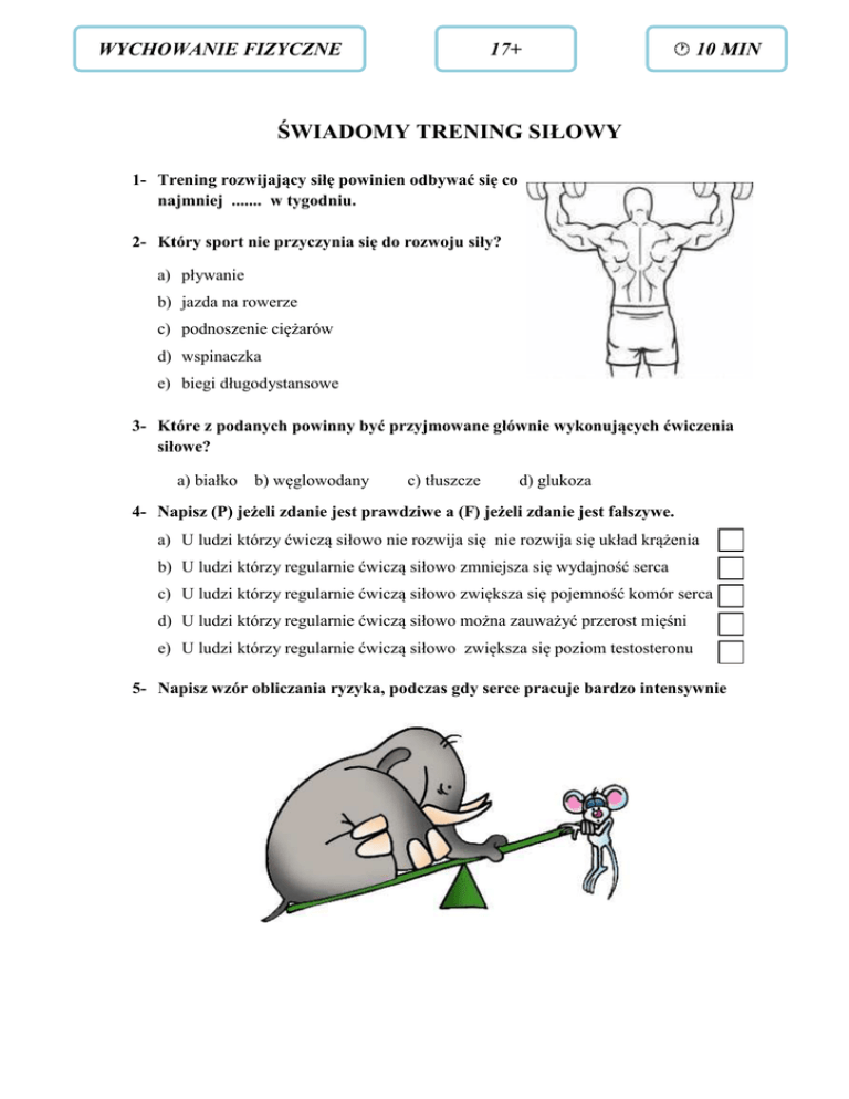 WYCHOWANIE FIZYCZNE 17+ 10 MIN ŚWIADOMY TRENING SIŁOWY 1- Trening rozwijający siłę powinien odbywać się co najmniej ....... w tygodniu. 2- Który sport nie przyczynia się do rozwoju siły? a) pływanie b) jazda na rowerze c) podnoszenie ciężarów d) wspinaczka e) biegi długodystansowe 3- Które z podanych powinny być przyjmowane głównie wykonujących ćwiczenia siłowe? a) białko b) węglowodany c) tłuszcze d) glukoza 4- Napisz (P) jeżeli zdanie jest prawdziwe a (F) jeżeli zdanie jest fałszywe. a) U ludzi którzy ćwiczą siłowo nie rozwija się nie rozwija się układ krążenia b) U ludzi którzy regularnie ćwiczą siłowo zmniejsza się wydajność serca c) U ludzi którzy regularnie ćwiczą siłowo zwiększa się pojemność komór serca d) U ludzi którzy regularnie ćwiczą siłowo można zauważyć przerost mięśni e) U ludzi którzy regularnie ćwiczą siłowo zwiększa się poziom testosteronu 5- Napisz wzór obliczania ryzyka, podczas gdy serce pracuje bardzo intensywnie KLUCZ ODPOWIEDZI 1- dwa razy 2- E 3- A 4A F B P 5- 220- wiek = ryzyko C F D P E P