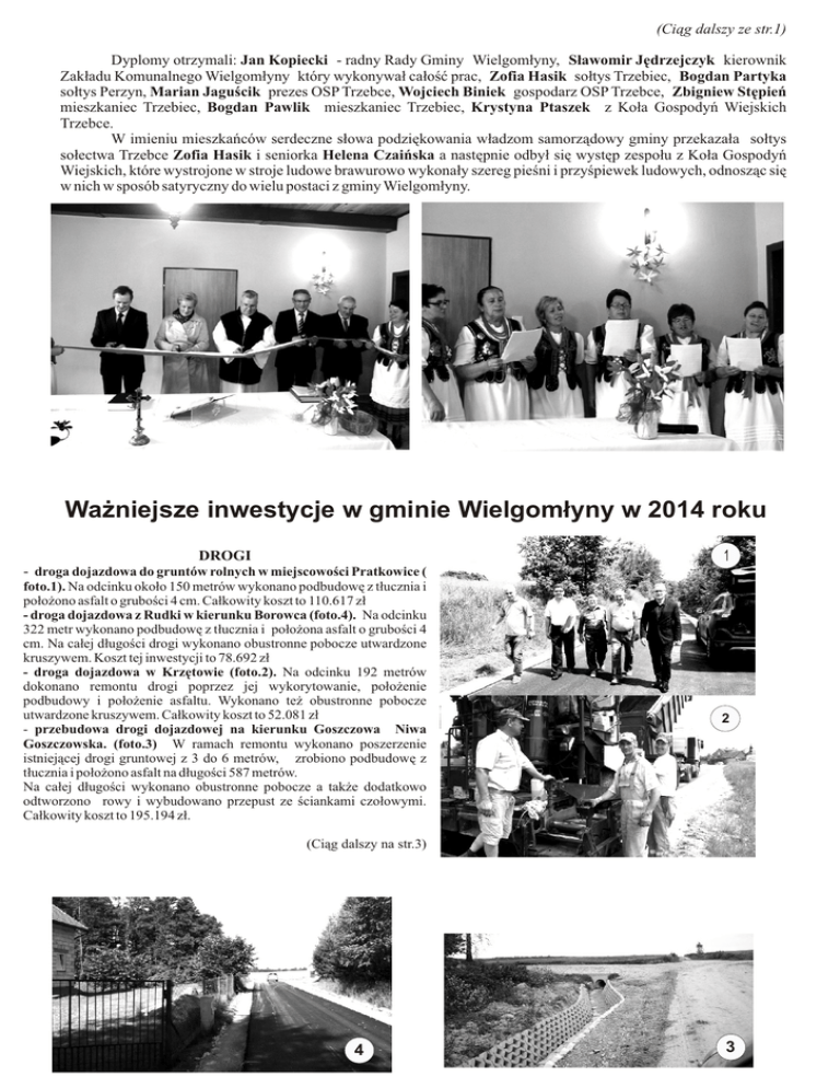 (Ciąg dalszy ze str.1) Dyplomy otrzymali: Jan Kopiecki - radny Rady Gminy Wielgomłyny, Sławomir Jędrzejczyk kierownik Zakładu Komunalnego Wielgomłyny który wykonywał całość prac, Zofia Hasik sołtys Trzebiec, Bogdan Partyka sołtys Perzyn, Marian Jaguścik prezes OSP Trzebce, Wojciech Biniek gospodarz OSP Trzebce, Zbigniew Stępień mieszkaniec Trzebiec, Bogdan Pawlik mieszkaniec Trzebiec, Krystyna Ptaszek z Koła Gospodyń Wiejskich Trzebce. W imieniu mieszkańców serdeczne słowa podziękowania władzom samorządowy gminy przekazała sołtys sołectwa Trzebce Zofia Hasik i seniorka Helena Czaińska a następnie odbył się występ zespołu z Koła Gospodyń Wiejskich, które wystrojone w stroje ludowe brawurowo wykonały szereg pieśni i przyśpiewek ludowych, odnosząc się w nich w sposób satyryczny do wielu postaci z gminy Wielgomłyny. Ważniejsze inwestycje w gminie Wielgomłyny w 2014 roku DROGI - droga dojazdowa do gruntów rolnych w miejscowości Pratkowice ( foto.1). Na odcinku około 150 metrów wykonano podbudowę z tłucznia i położono asfalt o grubości 4 cm. Całkowity koszt to 110.617 zł - droga dojazdowa z Rudki w kierunku Borowca (foto.4). Na odcinku 322 metr wykonano podbudowę z tłucznia i położona asfalt o grubości 4 cm. Na całej długości drogi wykonano obustronne pobocze utwardzone kruszywem. Koszt tej inwestycji to 78.692 zł - droga dojazdowa w Krzętowie (foto.2). Na odcinku 192 metrów dokonano remontu drogi poprzez jej wykorytowanie, położenie podbudowy i położenie asfaltu. Wykonano też obustronne pobocze utwardzone kruszywem. Całkowity koszt to 52.081 zł - przebudowa drogi dojazdowej na kierunku Goszczowa Niwa Goszczowska. (foto.3) W ramach remontu wykonano poszerzenie istniejącej drogi gruntowej z 3 do 6 metrów, zrobiono podbudowę z tłucznia i położono asfalt na długości 587 metrów. Na całej długości wykonano obustronne pobocze a także dodatkowo odtworzono rowy i wybudowano przepust ze ściankami czołowymi. Całkowity koszt to 195.194 zł. 1 2 (Ciąg dalszy na str.3) 4 3