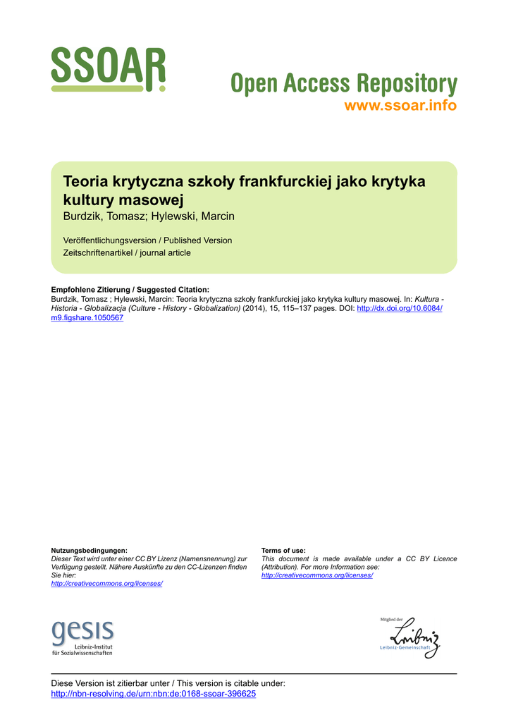 www.ssoar.info Teoria krytyczna szkoły frankfurckiej jako krytyka kultury masowej Burdzik, Tomasz; Hylewski, Marcin Veröffentlichungsversion / Published Version Zeitschriftenartikel / journal article Empfohlene Zitierung / Suggested Citation: Burdzik, Tomasz ; Hylewski, Marcin: Teoria krytyczna szkoły frankfurckiej jako krytyka kultury masowej. In: Kultura Historia - Globalizacja (Culture - History - Globalization) (2014), 15, 115–137 pages. DOI: http://dx.doi.org/10.6084/ m9.figshare.1050567 Nutzungsbedingungen: Dieser Text wird unter einer CC BY Lizenz (Namensnennung) zur Verfügung gestellt. Nähere Auskünfte zu den CC-Lizenzen finden Sie hier: http://creativecommons.org/licenses/ Terms of use: This document is made available under a CC BY Licence (Attribution). For more Information see: http://creativecommons.org/licenses/ Diese Version ist zitierbar unter / This version is citable under: http://nbn-resolving.de/urn:nbn:de:0168-ssoar-396625 Sugerowane cytowanie: Hylewski, M., i Burdzik, T. (2014). Teoria krytyczna szkoły frankfurckiej jako krytyka kultury masowej. Kultura-HistoriaGlobalizacja, (15), 115–137. doi:10.6084/m9.figshare.1050567 WSTĘP O siągnięcia cywilizacy–ne zmienia–ą —ażdego dnia –a—o ć życia ws”ó czesnego cz owie—aŁ Prócz ”ostę”u technologicznego, zmianie równolegle ulega —ultura. W tym —onte— cie warto zwrócić uwagę na teorię —rytyczną sz—o y fran—furc—ie–, stanowiące– ród o ins”irac–i w refle—s–i nad w” ywem —ultury ”o”ularne– na s”o eczeństwoŁ Procesy globalizacy–ne oraz rozwó– nowych technologii, wymusza–ą stawienie ”ytań dotyczących —ondyc–i ws”ó czesnego cz owie—aŁ Również ws”ó cze nie zauważa się, że ”rzemys —ulturowy ma w” yw na nasze rozumienie i wiedzę o otacza–ącym nas wiecie, ”rzez co ”rzestrogi fran—furtczy—ów są wciąż godne refle—s–i (Hesmondhalgh, 2012, 4)Ł Sz—o a frankfurc—a ze swo–ą —ryty—ą —ultury masowe– stworzy a ”odwaliny nie tyl—o ”od szereg —once”c–i —omuni—owania, ale również ws”ó czesne ”rądy intele—tualne, ta—ie –a— n”Ł ”ostmodernizm, globalizm, feminizm (Agger, 1991, 106, 1992; Brown, 2006; Scheuerman, 2012). W arty—ule ”rzedstawione zostaną ”odstawowe za ożenia teorii —rytyczne– sz—o y fran—furc—ie– dotyczące —ryty—i —ultury ”o”ularne–, —tóre mimo u” ywu czasu od ich —reac–i, wielu badaczy ws”ó czesnego s”o eczeństwa nadal uważa za warte zainteresowania i użyteczne w eksplikacji zjawisk i ”rocesów związanych z wza–emnym oddzia ywaniem kultury, technologii i rynku. SZKOŁA FRANKFURCKA. GENEZA, POJĘCIE, KIERUNKI MYŚLENIA Po–ęcie sz—o y fran—furc—ie– bywa rozumiane na —il—a s”osobówŁ źwięz ą, acz tre ciwą ty”ologię znaczeń tego terminu ”ro”onu–e Jerzy Szac—i wyszczególnia–ąc trzy możliwe kierunki jego rozumienia. Po ”ierwsze ”od szyldem sz—o y fran—furc—ie– rozumie się ogó my licieli związanych z Instytutem Badań S”o ecznych za ożonym w 1923 roku we Frankfurcie nad Menem. 115 Globalizacja Nr 15 JAKO KRYTYKA KULTURY MASOWEJ Historia TEORIA KRYTYCZNA SZKOŁY FRANKFURCKIEJ Kultura MARCIN HYLEWSKI, TOMASZ BURDZIK Marcin Hylews—i, Tomasz Burdzi—, Teoria —rytyczna sz—o y fran—furc—ie– –a—o —ryty—a —ultury masowe– źalicza się do nich g ównie ta—ie ”ostacie jak: Max Horkheimer, Karl Grünberg, Friedrich Polloc—, Herbert Marcuse, Leo Löwenthal, Theodor Adorno, Walter Ben–amin, Karl Wittfogel, Franz Neumann i Erich Fromm. Jest to szerokie rozumienie omawianego terminu. Po drugie omawiane o—re lenie odnosi się często do rodowis—a, —tóre u—szta towa o się w Instytucie Badań S”o ecznych ”o 1931 ro—u, t–Ł ”o ob–ęciu dyre—c–i ”rzez Maxa Hor—heimeraŁ Ta—ie zastosowanie terminu wiąże się z —onieczno cią ”ozostawienia ”oza obrębem my li fran—furtczy—ów dominu–ących w Instytucie w latach wcze nie–szych teorii e—onomii ”olityczne–, g oszonych ”rzez ortodo—sy–nych mar—sistówŁ Przed ro—iem 1931 ”laców—a ta by a bowiem a—ademic—im za”leczem dla lewicu–ące– i komunistycznej orientac–i ”olityczne–Ł Jest to wąs—ie rozumienie terminu. Po trzecie za ”rzedstawicieli sz—o y fran—furc—ie– uważa się autorów, —tórzy nigdy formalnie nie należeli do Instytutu Badań S”o ecznych. W te– ”ers”e—tywie odróżnia się często ”ierwsze i drugie ”o—olenie sz—o y, ”rzy czym drugie ”o—olenie zawiera autorów —ontynuu–ących badania fran—furtczy—ów, mnie– lub bardzie– ci le trzyma–ących się ich metodologii i za—resuŁ Ja—o ”rzy— ad na– atwie– wymienić Jürgena HabermasaŁ Jest to merytoryczne rozumienie terminu, —tóre w ącza w ”oczet cz on—ów sz—o y frankfurckiej –a—o ”ewnego nurtu refle—s–i s”o eczne–, wszel—ich badaczy ”ode–mu–ących zagadnienia ”odobne do ”oruszanych ”rzez autorów ”ierwszego ”o—olenia Ł źa ta—im znaczeniem terminu ”rzemawia również fa—t, iż cz on—owie Instytutu Badań S”o ecznych ”o ”rze–ęciu w adzy w Niemczech ”rzez nazistów, emigrowali do USA i Europy Zachodniej. Zmiana lo—alizac–i nie wiąza a się –edna— z ”orzuceniem wcze nie–szych zainteresowań badawczych (Bottomore, 2002, 15 26; Held, 1980, 29 39; Wiggershaus, 1995, 36 126). Ile—roć w ”racy ”o–awi się ”o–ęcie sz—o y fran—furc—ie–, będzie ono użyte w trzecim, a więc merytorycznym znaczeniuŁ TEORIA TRADYCYJNA, A TEORIA KRYTYCZNA Termin teoria —rytyczna ”o ”ewnym czasie zaczęto automatycznie —o–arzyć ze sz—oą fran—furc—ą, choć ”ocząt—owo stosowa go –edynie ”rominentny ”rzedstawiciel sz—o y, Max Hor—heimerŁ O—re li on w ten s”osób swo–ą —once”