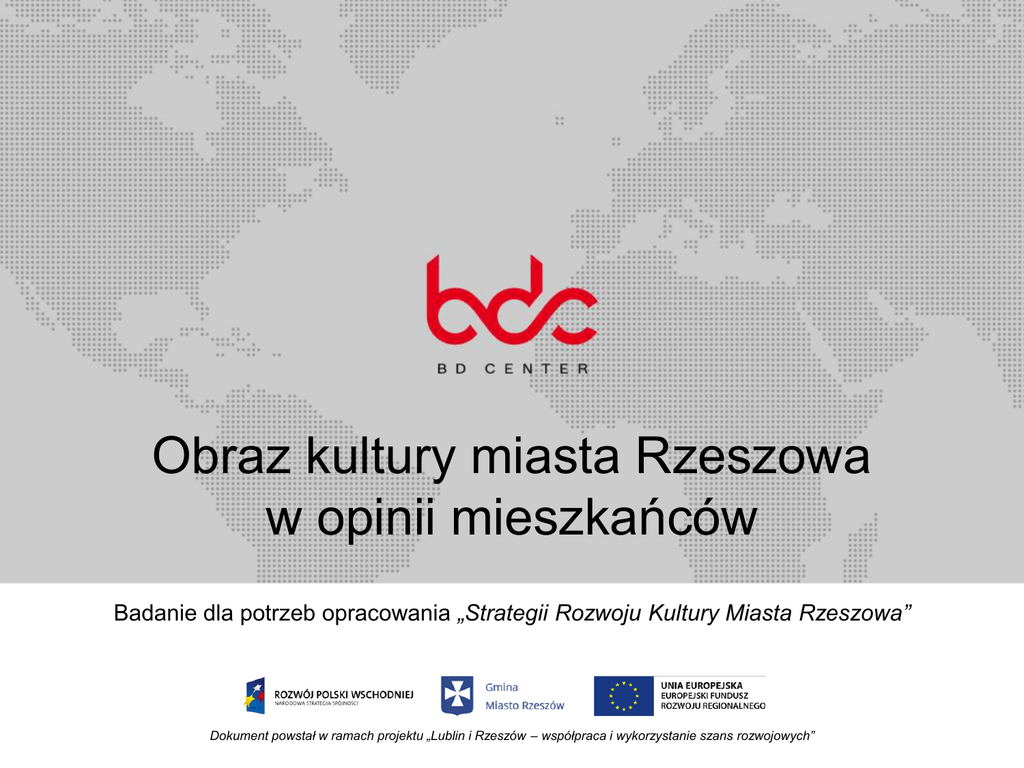 Obraz kultury miasta Rzeszowa w opinii mieszkańców Badanie dla potrzeb opracowania „Strategii Rozwoju Kultury Miasta Rzeszowa” Dokument powstał w ramach projektu „Lublin i Rzeszów – współpraca i wykorzystanie szans rozwojowych” Informacja o badaniu Badanie diagnozujące sytuację rzeszowskiej kultury zostało przeprowadzone dla potrzeb opracowania „Strategii Kultury Miasta Rzeszowa”, w ramach projektu pn. „Lublin i Rzeszów – współpraca i wykorzystanie szans rozwojowych”. Badania zostały zrealizowane we wrześniu i październiku 2013 roku. W ramach diagnozy przeprowadzono: analizę desk research, badanie telefoniczne CATI na reprezentatywnej próbie 1064 mieszkańców Rzeszowa oraz powiatu rzeszowskiego, badania jakościowe (wywiady indywidualne i grupy fokusowe) z kreatorami kultury rzeszowskiej (przedstawicielami instytucji związanych z kulturą, animatorami kultury, twórcami). Dokument powstał w ramach projektu „Lublin i Rzeszów – współpraca i wykorzystanie szans rozwojowych” 2 Uczestnictwo w kulturze Za najważniejsze formy aktywności kulturalnej badani uważają: (1) uczestnictwo w imprezach kulturalnych, (2) chodzenie do teatru, (3) do kina, (4) do filharmonii, (5) na wystawy. Z kolei najczęściej uczestniczą w: (1) imprezach kulturalnych, (2) seansach kinowych, (3) spektaklach teatralnych, (4) wystawach, (5) wydarzeniach w Filharmonii. Dokument powstał w ramach projektu „Lublin i Rzeszów – współpraca i wykorzystanie szans rozwojowych” 3 Czynniki motywujące do uczestnictwa w kulturze Badani deklarowali, że wybierając wydarzenia, w których chcą uczestniczyć, najczęściej kierują się własną potrzebą i zainteresowaniami, propozycją znajomych, ceną biletów, możliwością bezpłatnego uczestnictwa, reklamą i promocją w mediach oraz dogodną lokalizacją. Własna potrzeba, zainteresowanie daną dziedziną 57,8% Propozycja znajomych, partnera/ partnerki 41,1% Cena biletów 27,8% Możliwość bezpłatnego udziału/ wstępu 17,1% Reklama/ promocja w mediach 15,2% Dogodna lokalizacja/ dobry dojazd 15,1% Chęć zabłyśnięcia w towarzystwie 2,8% Inne 3,5% 0,0% 10,0% 20,0% 30,0% 40,0% 50,0% 60,0% Dokument powstał w ramach projektu „Lublin i Rzeszów – współpraca i wykorzystanie szans rozwojowych” 70,0% 4 Bariery uczestnictwa w kulturze Według badanych najczęstszymi barierami utrudniającymi udział w wydarzeniach kulturalnych są: brak czasu, zbyt wysokie ceny biletów, słabą informacje o planowanych wydarzeniach, dużą odległość lub niedogodny dojazd oraz mało atrakcyjną ofertę kulturalną. Brak czasu 50,1% Zbyt wysoka cena biletów 40,8% Słaba informacja o wydarzeniach kulturalnych 27,1% Duża odległość, niedogodny dojazd 19,2% Mało atrakcyjna oferta kulturalna 12,9% Nie odczuwam takiej potrzeby 2,9% Brak utrudnień 3,0% Inne 0,0% 9,7% 10,0% 20,0% 30,0% 40,0% 50,0% Dokument powstał w ramach projektu „Lublin i Rzeszów – współpraca i wykorzystanie szans rozwojowych” 60,0% 5 Ocena informacji o wydarzeniach kulturalnych Przeszło 70% mieszkańców uważa, że jest dobrze poinformowana o wydarzeniach kulturalnych w Rzeszowie. 70,0% 60,0% 60,0% 50,0% 40,0% 30,0% 20,2% 20,0% 11,8% 10,0% 2,9% 5,1% 0,0% Bardzo dobrze Raczej dobrze Raczej źle Bardzo źle Trudno powiedzieć Dokument powstał w ramach projektu „Lublin i Rzeszów – współpraca i wykorzystanie szans rozwojowych” 6 Źródła informacji o wydarzeniach kulturalnych Najważniejszym źródłem informacji jest Internet. Niespełna 30% badanych korzysta z Serwisu Informacyjnego Urzędu Miasta, pozostali czerpią informacje z innych stron internetowych oraz z portali społecznościowych. Respondenci wskazywali na potrzebę utworzenia spójnej platformy informacyjnej przedstawiającej ofertę kulturalną miasta. Część badanych zwracała uwagę na skuteczność formy informacji poprzez wiadomość SMS. Internet 47,3% Telewizja 42,1% Reklama na mieście (bilbord, plakat, ulotka) 39,4% Radio 31,7% Prasa 28,4% Rekomendacje od znajomych 26,2% SMS Inne 0,0% 6,8% 1,0% 10,0% 20,0% 30,0% 40,0% Dokument powstał w ramach projektu „Lublin i Rzeszów – współpraca i wykorzystanie szans rozwojowych” 50,0% 7 Potencjał kulturalny Rzeszowa Większość uczestników badania za największy potencjał Rzeszowa uznała festiwale, koncerty i imprezy plenerowe. Festiwale/koncerty/imprezy plenerowe Filharmonia Podkarpacka im. Artura Malawskiego Mieszkańcy/młodzież Teatry Promocja/rozwój miasta Czystość/wizerunek Sport Położenie miasta Rynek Bogata oferta kulturowa/ duża ilość instytucji kultury Teatr im. Wandy Siemaszkowej Szkolnictwo Galerie sztuki, fotografii, itp. Artyści Kina Podziemna trasa turystyczna Fontanna multimedialna Muzea Inne 0,0% 23,2% 16,7% 13,5% 13,3% 8,6% 4,9% 4,0% 3,8% 3,5% 3,2% 2,9% 2,8% 2,8% 2,8% 2,6% 2,4% 2,4% 2,3% 16,1% 5,0% 10,0% 15,0% 20,0% 25,0% Pytanie otwarte: Co jest potencjałem kulturalnym Rzeszowa? (najczęstsze odpowiedzi) Dokument powstał w ramach projektu „Lublin i Rzeszów – współpraca i wykorzystanie szans rozwojowych” 8 Potencjał kulturalny Rzeszowa Zdecydowana większość mieszkańców Rzeszowa uważa, że potencjał kulturalny miasta jest wykorzystywany. Równocześnie 1/3 badanych dostrzega istnienie nowych, niezrealizowanych możliwości bądź obszarów dla aktywności kulturalnej miasta. 70,0% 59,8% 60,0% 50,0% 40,0% 30,0% 16,8% 20,0% 11,2% 9,0% 10,0% 3,2% 0,0% Zdecydowanie tak Raczej tak Raczej nie Zdecydowanie mie Trudno powiedzieć Ocena wykorzystania potencjału kulturalnego Rzeszowa Procent osób, które uważają, że w Rzeszowie istnieją nowe, niezrealizowane możliwości, obszary dla aktywności kulturalnej Dokument powstał w ramach projektu „Lublin i Rzeszów – współpraca i wykorzystanie szans rozwojowych” 9 Instytucje kultury w Rzeszowie Za najważniejsze instytucje kultury w Rzeszowie badani uważają Filharmonię Podkarpacką im. Artura Malawskiego oraz Tea