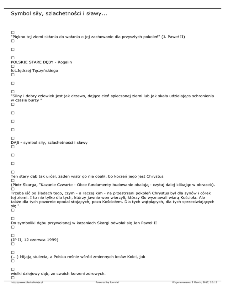 Symbol siły, szlachetności i sławy... "Piękno tej ziemi skłania do wołania o jej zachowanie dla przyszłych pokoleń" (J. Paweł II) POLSKIE STARE DĘBY - Rogalin fot.Jędrzej Tęczyńskiego "Silny i dobry człowiek jest jak drzewo, dające cień spieczonej ziemi lub jak skała udzielająca schronienia w czasie burzy " DĄB - symbol siły, szlachetności i sławy Ten stary dąb tak urósł, żaden wiatr go nie obalił, bo korzeń jego jest Chrystus (Piotr Skarga, "Kazanie Czwarte - Obce fundamenty budowanie obalają - czytaj dalej klikając w obrazek). Trzeba iść po śladach tego, czym - a raczej kim - na przestrzeni pokoleń Chrystus byl dla synów i córek tej ziemi. I to nie tylko dla tych, którzy jawnie wen wierzyli, którzy Go wyznawali wiarą Kościoła. Ale także dla tych pozornie opodal stojących, poza Kościołem. Dla tych wątpiących, dla tych sprzeciwiających się ". Do symboliki dębu przywołanej w kazaniach Skargi odwołał się Jan Paweł II (JP II, 12 czerwca 1999) (...) Mijają stulecia, a Polska rośnie wśród zmiennych losów Kolei, jak wielki dziejowy dąb, ze swoich korzeni zdrowych. http://www.blaskalleluja.pl Powered by Joomla! Wygenerowano: 2 March, 2017, 20:12 To jest wielkie dziedzictwo, z którym idziemy w przyszłość. Niech za sprawa Wojciecha i wszystkich polskich Patronów zgromadzonych u Bogurodzicy, owoce odkupienia trwają i utrwalają sie wśród pokoleń, które idą. NIECH LUDZIE TRZECIEGO TYSIĄCLECIA PODEJMĄ MiSJĘ PRZEKAZANĄ KIEDYS, PRZED TYSIĄCEM LAT (...) I NIECH JA PRZEKAZUJĄ CORAZ NA NOWYM POKOLENIOM OTO ZIARNO PSZENICZNE, KTÓRE PADŁO W ZIEMIĘ, TĘ ZIEMIĘ, PRZYNIOSŁO OWOC STOKROTNY J. Paweł II, Sopot 1999 Siewca zasiał ziarno - Ty pielęgnuj korzeń! MUSIMY BRONIĆ NASZYCH CHRZEŚCIJAŃSKICH WARTOŚCI czytaj Potrzeba nieustannej odnowy umysłów i serc, aby przepełniała je miłość i sprawiedliwość, Uczciwość i ofiarność, szacunek dla innych i troska o Dobro Wspólne, szczególnie na dobro, jakim jest Wolna Ojczyzna. http://www.blaskalleluja.pl Powered by Joomla! Wygenerowano: 2 March, 2017, 20:12 Jan Paweł II, Pielgrzymka do Ojczyzny 1979 - Homilia (...) Kościół przyniósł Polsce Chrystusa - To znaczy klucz do rozumienia tej wielkiej i podstawowej rzeczywistości, jest człowiek Człowieka bowiem nie MOŻNA do końca zrozumieć bez Chrystusa. Raczej: człowiek sam siebie nie może zrozumieć bez Chrystusa. Nie może zrozumieć ani kim jest, ani jaka jest jego właściwa godność, ani jakie jest jego powołanie i ostateczne przeznaczenie. Nie może tego wszystkiego zrozumieć bez Chrystusa. I dlatego Chrystusa nie MOŻNA wyłączać z dziejów człowieka w jakimkolwiek miejscu ziemi. Nie MOŻNA też bez Chrystusa zrozumieć ludzi, dziejów Polski - przede wszystkim jako dziejów, ludzi którzy przeszli i przechodzą przez tę ziemię. Dzieje ludzi! Dzieje narodu są przede wszystkim dziejami ludzi. Dzieje każdego człowieka toczą się w Jezusie Chrystusie. W Nim stają się dziejami zbawienia. Dzieje narodu zasługują na właściwa ocene wedle tego, co wniósł w rozwój człowieka i człowieczeństwa, w świadomość jego, serce, sumienie. To jest najgłębszy nurt kultury. To jej najmocniejszy zrąb. To jej rdzeń i siła. Otóż tego, co naród polski wniósł w rozwój człowieka i człowieczeństwa, co również dzisiaj wnosi, nie sposób zrozumieć i ocenić bez Chrystusa. "Ten stary dąb tak urósł, wiatr go żaden nie obalił, bo korzeń jest Jego Chrystus" (Piotr Skarga, Kazania sejmowe). całość-czytaj dalej PAMIĘCI JANA PAWŁA II - "Cisza na palcach"- Stanisława Łowińska więcej Jan Paweł II powiedział: "Bądźcie odważni również wy w życiu i świadczeniu o waszej wierze chrześcijańskiej, przekonani, że i ona stanowi naprawdę najpoważniejszych rozwiązanie problemów życia! Bądźcie wielkoduszni także wy, zawsze dla l wszystkich, z miłością, miłosierdziem, ofiary duchem, pewni, że prawdziwa radość znajduje się w miłowaniu i obdarzaniu! "Piękno tej ziemi skłania do wołania o jej zachowanie dla przyszłych pokoleń" (J. Paweł II) Do miejsca, ktore ze względu na znaczącą historię, wartości kulturowe, religijne, z uwagi na artyzm architektury, bogactwo nagromadzonych cennych przedmiotów, a takze piękno otaczającego je krajobrazu zasługują na szczególna uwage i ochronę. Bądźmy dumni z tego Dziedzictwa Kultury i pokoleniom przekazujcie je przyszłym (w nawiazaniu do J. Pawła II) http://www.blaskalleluja.pl Powered by Joomla! Wygenerowano: 2 March, 2017, 20:12 Polskie pomniki historii - zobacz galerię - kliknij w obrazek http://www.blaskalleluja.pl Powered by Joomla! Wygenerowano: 2 March, 2017, 20:12