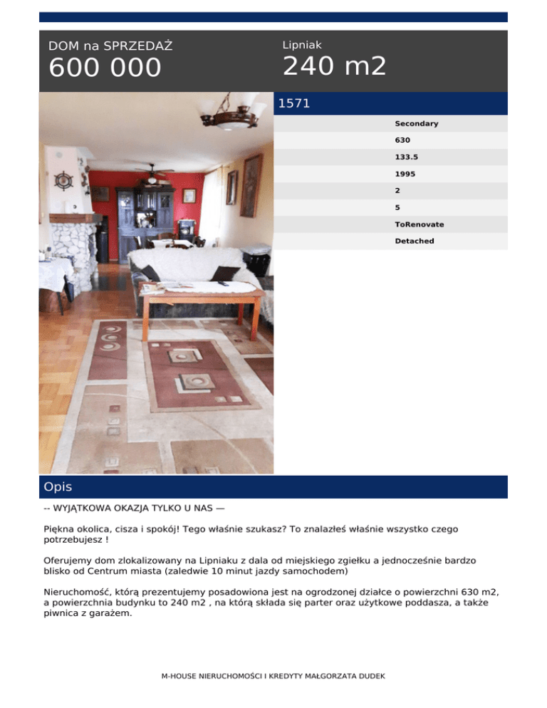 600 000 240 m2 - M-House Nieruchomości i Kredyty