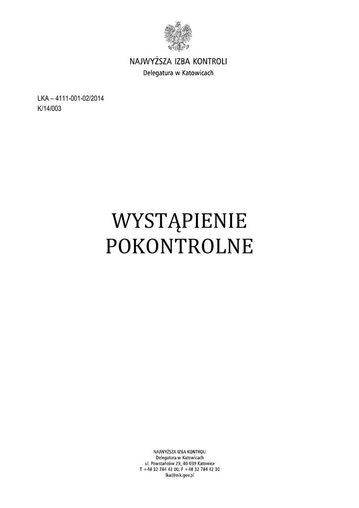 LKA – 4111-001-02/2014 K/14/003 WYSTĄPIENIE POKONTROLNE I. Dane identyfikacyjne kontroli Numer i tytuł kontroli Jednostka przeprowadzająca kontrolę K/14/003 - Wykonanie wniosków z kontroli P/12/036 – Zadłużenie wybranych instytucji sektora finansów publicznych oraz Krajowego Funduszu Drogowego. Najwyższa Izba Kontroli Delegatura w Katowicach Kontroler Krzysztof Baron, główny specjalista kontroli państwowej, upoważnienie do kontroli nr 89032 z dnia 24 stycznia 2014 r. (dowód: akta kontroli str. 1-2) Jednostka kontrolowana Kierownik jednostki kontrolowanej Urząd Miejski w Pszczynie1, ul. Rynek 2,43-200 Pszczyna Dariusz Skrobol, Burmistrz Pszczyny (dowód: akta kontroli str. 193) II. Ocena kontrolowanej działalności Ocena ogólna Uzasadnienie oceny ogólnej Najwyższa Izba Kontroli ocenia pozytywnie, mimo stwierdzonej nieprawidłowości2, działalność kontrolowanej jednostki w zbadanym zakresie. W wyniku działań podjętych przez Burmistrza zrealizowano siedem z ośmiu wniosków pokontrolnych sformułowanych przez NIK po kontroli nr P/12/036 – Zadłużenie wybranych instytucji sektora finansów publicznych oraz Krajowego Funduszu Drogowego. Działania podjęte w celu realizacji wniosku, dotyczącego rozważenia możliwości zmian postanowień zawartych w umowach kredytowych, w których kredytodawca miał faktyczne upoważnienie do dysponowania rachunkiem Gminy okazały się niewystarczające, gdyż cofnięto takie upoważnienie w przypadku pobierania przez Bank odsetek od kredytu, natomiast kredytodawca może nadal - bez dyspozycji Gminy pobierać z jej rachunku spłaty rat kapitałowych. Burmistrz, w przesyłanych NIK informacjach, przedstawił rzetelne dane o sposobie realizacji wniosków pokontrolnych. III. Opis ustalonego stanu faktycznego 1. Realizacja wniosków pokontrolnych Opis stanu faktycznego Najwyższa Izba Kontroli Delegatura w Katowicach przeprowadziła w 2012 r. w Urzędzie kontrolę P/12/036 – Zadłużenie wybranych instytucji sektora finansów publicznych oraz Krajowego Funduszu Drogowego. W wystąpieniu pokontrolnym 1 Zwany dalej „Urzędem”. Najwyższa Izba Kontroli stosuje 3-stopniową skalę ocen: pozytywna, pozytywna mimo stwierdzonych nieprawidłowości, negatywna. Jeżeli sformułowanie oceny ogólnej według proponowanej skali byłoby nadmiernie utrudnione, albo taka ocena nie dawałaby prawdziwego obrazu funkcjonowania kontrolowanej jednostki w zakresie objętym kontrolą, stosuje się ocenę opisową, bądź uzupełnia ocenę ogólną o dodatkowe objaśnienie. 2 2 z dnia 19 grudnia 2012 r. (nr LKA- 4101-29-04/2012) sformułowano osiem wniosków pokontrolnych: [1] Zapewnienie podpisywania umów w sprawach majątkowych Gminy zgodnie z upoważnieniem określonym w uchwale organu stanowiącego, [2] Rozważenie możliwości zmiany postanowień czterech umów kredytu w celu cofnięcia upoważnienia do dysponowania rachunkiem Gminy, [3] Zaprzestanie praktyki wydłużania aneksami obowiązywania umowy o obsługę bankową budżetu Gminy, zawartej na okres od 1.06.2004 r. do 31.05.2007 r., [4] Zapewnienie rzetelnego sporządzania sprawozdań kwartalnych Rb-Z i Rb-NDS, [5] Rzetelne ewidencjonowanie zadłużenia z tytułu kredytu w rachunku bankowym gminy (linii kredytowej), [6] Ewidencjonowanie zobowiązań wymagalnych i kosztów zgodnie z zasadą memoriału, [7] Niedopuszczenie do dysponowania środkami zgromadzonymi na rachunku „zabezpieczeń i wadiów” w formie „krótkoterminowych pożyczek” na finansowanie wydatków Gminy, [8] Zatwierdzanie sprawozdań finansowych Samodzielnego Publicznego Zespołu Opieki Zdrowotnej Pszczyńskiego Ośrodka Rehabilitacyjno-Terapeutycznego3. Wniosek nr 1 zrealizowano. Wartość zaciągniętych przez Gminę: kredytu długoterminowego w wys. 6.000 tys. zł oraz kredytu na sfinansowanie przejściowego deficytu (do wys. 6.000 tys. zł) nie przekraczała limitów zobowiązań z tytułu zaciąganych kredytów i pożyczek, określonych w uchwale Nr XXVIII/361/12 Rady Miejskiej w Pszczynie z dnia 28 grudnia 2012 r. w sprawie budżetu gminy na rok 2013 r. oraz w uchwale Nr XXXIX/489/13 Rady Miejskiej w Pszczynie z dnia 19 grudnia 2013 r. w sprawie budżetu gminy na rok 2014 r. (dowód: akta kontroli str. 3-8, 178) Wniosek nr 2 zrealizowano częściowo. W trakcie kontroli w 2012 r. ustalono, że Gmina zawarła trzy długoterminowe umowy kredytowe oraz umowę o kredyt w rachunku bieżącym, w których Burmistrz Miasta, w imieniu Gminy, wyraził zgodę na obciążenie przez Bank w dniu wymagalności rachunku, w celu spłaty jego zobowiązań z tytułu umowy, a Bank uprawniono do pobierania środków w tym trybie przed wszelkimi innymi płatnościami, z wyjątkiem płatności wynikających z tytułów wykonawczych. Pomimo że ww. zapisy nie mówiły wprost o pełnomocnictwie do dysponowania rachunkiem, to ich skutek był identyczny, ponieważ kredytodawca miał dostęp do rachunku Gminy umożliwiający samodzielne pobranie rat kredytu w wyznaczonych terminach oraz spłaty odsetek od kredytu, natomiast Gmina miała ograniczone możliwości prawne zablokowania tych operacji. Trzy z ww. kredytów zostały spłacone, natomiast w wyniku podjętych działań, w celu realizacji wniosku NIK, w dniu 9.12.2013 r. Gmina podpisała aneks nr 2 do ww. umowy, zmieniający zapisy § 7 ust. 3 umowy w taki sposób, że Bank zobowiązany został do każdorazowego powiadamiania Gminy o wysokości tych odsetek, a Gmina do akceptacji spłaty ze wskazanego rachunku bankowego. Pomimo wprowadzenia ww. zapisu, Bank nadal może z rachunku Gminy pobrać środki na spłatę raty kredytu bez dyspozycji Gminy, nie zostały bowiem zmienione zapisy umowne dotyczące spłaty kapitału, co szczegółowo opisano poniżej (w pkt. stwierdzone nieprawidłowości). NIK pozytywnie ocenia, że w żadnej z nowo zawartych w 2013 r. umów nie umieszczono zapisów pozwalających na obciążenie przez Bank rachunku Gminy, w celu spłaty jej zobowiązań (bez 