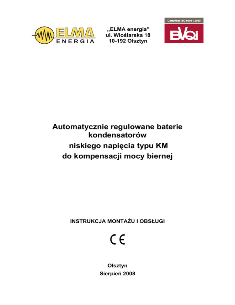 „ELMA energia” ul. Wioślarska 18 10-192 Olsztyn Automatycznie regulowane baterie kondensatorów niskiego napięcia typu KM do kompensacji mocy biernej INSTRUKCJA MONTAŻU I OBSŁUGI Olsztyn Sierpień 2008 SPIS TREŚCI I. 1. 2. 3. 4. 5. II. 1. 2. 3. III. 1. 2. 3. 4. IV. V. VI. INFORMACJE OGÓLNE. ............................................................... 3 Zastosowanie................................................................................3 Budowa.........................................................................................4 Zasada działania...........................................................................5 Dane techniczne baterii KM ..........................................................5 Przepisy i normy ...........................................................................7 MONTAŻ BATERII ......................................................................... 7 Dokumentacja projektowa ............................................................7 Czynności wstępne.......................................................................8 Montaż baterii ...............................................................................8 URUCHOMIENIE BATERII .......................................................... 10 Sprawdzenie wstępne.................................................................10 Nastawy regulatora współczynnika mocy cosϕ ..........................10 Uruchomienie wstępne ...............................................................10 Uruchomienie eksploatacyjne, włączenie do ruchu ....................11 EKSPLOATACJA BATERII KONDENSATORÓW...................... 11 Opracowania regulujące eksploatację baterii ............................... 13 GWARANCJA............................................................................... 13 I. INFORMACJE OGÓLNE. 1. Zastosowanie Baterie kondensatorów typu KM przeznaczone są do centralnej bądź grupowej kompensacji mocy biernej (poprawy współczynnika cosϕ) w trójfazowych sieciach przemysłowych o napięciach znamionowych 400V, 525V i 690V, przy założeniu równomiernego obciążenia faz. Mikroprocesorowy regulator mocy biernej załączając człony kondensatorowe, automatycznie dostosowuje moc bierną tak, aby utrzymać zaprogramowaną wartość współczynnika mocy. Można opcjonalnie zastosować regulator mocy biernej z zegarem czasu rzeczywistego, co pozwoli na utrzymanie różnych wartości współczynnika mocy w różnych strefach czasowych. Baterie kondensatorów typu KM nie są przeznaczone do kompensacji mocy biernej w sieciach z dużą zawartością wyższych harmonicznych. Takie sytuacje występują, gdy w sieci pracują odbiorniki typu: prostowniki tyrystorowe, falowniki, zgrzewarki, spawarki, piece indukcyjne. Zainstalowanie baterii kondensatorów typu KM w obecności wyższych harmonicznych może spowodować uszkodzenie kondensatorów i styczników, zaś takie uszkodzenia nie są objęte gwarancją. Przypadki te należy każdorazowo zbadać i rozważać zainstalowanie baterii kondensatorów z rezonansowymi dławikami ochronnymi. W przypadku gwałtownych zmian obciążenia (np. zgrzewarki) efekt kompensacji może być nie osiągnięty, w takich sytuacjach należy stosować tyrystorowe baterie nadążne. Kondensatory oraz wszystkie pozostałe materiały użyte do produkcji baterii kondensatorów są nietoksyczne i nieszkodliwe ekologicznie. Zużyte jednostki kondensatorowe oraz styczniki powinny być zutylizowane w zakładach do tego uprawnionych. Nie wolno wyrzucać zużytych aparatów do odpadów komunalnych. UWAGA: W polu zasilającym baterię należy zainstalować urządzenia ograniczające prąd zwarciowy do 17kA. 2. Budowa Konstrukcje baterii kondensatorów typu KM wykonane są w formie szafy blaszanej koloru szarego (inne na życzenie klienta) o wymiarach podanych w tabeli: Lp Typ baterii 1 2 3 4 5 6 KM 60 KM 140 KM 240 KM 360 KM 450 KM 720 Szerokość [mm] 400 800 800 1000 1000 800 Wysokość [mm] 600 800 1100 1300 1700 2100 Głębokość [mm] 250/300 300 300 300 450 800 Obudowy baterii typu KM60 oraz KM140 przeznaczone są do montażu naściennego, baterie KM240, KM360, KM450 i KM720 posiadają cokół ułatwiający doprowadzenie kabla od kanału kablowego. Zespół zasilający stanowi komplet szyn zbiorczych, do których podłączone są człony kondensatorowe. Dolne końce szyn przeznaczone są do żył kabla zasilającego. Prądowy obwód pomiarowy łączymy z listwą zaciskową LZ (zaciski 1 i 2). Na drzwiach obudowy umieszczony jest mikroprocesorowy regulator mocy biernej oraz łącznik krzywkowy umożliwiający wyłączenie regulatora i tym samym baterii kondensatorów (za wyjątkiem baterii KM60, wyposażonej w rozłącznik bezpiecznikowy z rączką wyprowadzoną na drzwiczki). Regulator mocy biernej pełni rolę zespołu zabezpieczeń oraz umożliwia pomiar podstawowych parametrów sieci. Pojedynczy człon kondensatorowy w bateriach typu KM składa się z: a) trójfazowych kondensatorów niskiego napięcia Modulo DUCATI energia s.p.a., MOD 5 lub EK60 ELMA energia, Kondensatory wyposażone są w przeciążeniowe zabezpieczenia nadciśnieniowe oraz oporniki rozładowcze pozwalające skrócić czas rozładowania do 1 minuty. b) stycznika przystosowanego do załączania obwodów pojemnościowych, c) podstaw i wkładek bezpiecznikowych o charakterystyce zwłocznej. Obwody instalacyjnym sterownicze zabezpieczone są bezpiecznikiem 3. Zasada działania. Działanie baterii kondensatorów polega na automatycznym dołączaniu lub odłączaniu kondensatorów o określonej mocy znamionowej w kompensowanym punkcie sieci energetycznej. Regulator mocy biernej porównuje aktualną wartość współczynnika mocy cosϕ (tgϕ) z wartością zadaną, zaprogramowaną w regulatorze i w zależności od zapotrzebowania na moc bierną steruje ilością załączonych kondensatorów. 4. Dane techniczne baterii KM Napięcie znamionowe: Częstotliwość: Moc zna