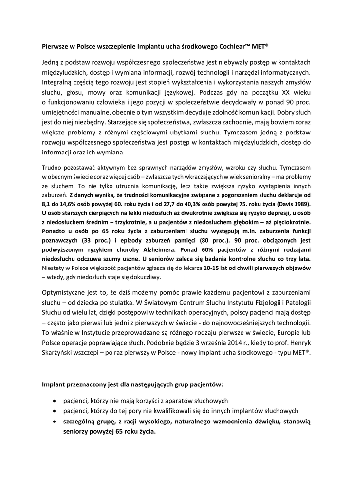 Pierwsze w Polsce wszczepienie Implantu ucha środkowego Cochlear™ MET® Jedną z podstaw rozwoju współczesnego społeczeństwa jest niebywały postęp w kontaktach międzyludzkich, dostęp i wymiana informacji, rozwój technologii i narzędzi informatycznych. Integralną częścią tego rozwoju jest stopień wykształcenia i wykorzystania naszych zmysłów słuchu, głosu, mowy oraz komunikacji językowej. Podczas gdy na początku XX wieku o funkcjonowaniu człowieka i jego pozycji w społeczeństwie decydowały w ponad 90 proc. umiejętności manualne, obecnie o tym wszystkim decyduje zdolność komunikacji. Dobry słuch jest do niej niezbędny. Starzejące się społeczeństwa, zwłaszcza zachodnie, mają bowiem coraz większe problemy z różnymi częściowymi ubytkami słuchu. Tymczasem jedną z podstaw rozwoju współczesnego społeczeństwa jest postęp w kontaktach międzyludzkich, dostęp do informacji oraz ich wymiana. Trudno pozostawać aktywnym bez sprawnych narządów zmysłów, wzroku czy słuchu. Tymczasem w obecnym świecie coraz więcej osób – zwłaszcza tych wkraczających w wiek senioralny – ma problemy ze słuchem. To nie tylko utrudnia komunikację, lecz także zwiększa ryzyko wystąpienia innych zaburzeń. Z danych wynika, że trudności komunikacyjne związane z pogorszeniem słuchu deklaruje od 8,1 do 14,6% osób powyżej 60. roku życia i od 27,7 do 40,3% osób powyżej 75. roku życia (Davis 1989). U osób starszych cierpiących na lekki niedosłuch aż dwukrotnie zwiększa się ryzyko depresji, u osób z niedosłuchem średnim – trzykrotnie, a u pacjentów z niedosłuchem głębokim – aż pięciokrotnie. Ponadto u osób po 65 roku życia z zaburzeniami słuchu występują m.in. zaburzenia funkcji poznawczych (33 proc.) i epizody zaburzeń pamięci (80 proc.). 90 proc. obciążonych jest podwyższonym ryzykiem choroby Alzheimera. Ponad 60% pacjentów z różnymi rodzajami niedosłuchu odczuwa szumy uszne. U seniorów zaleca się badania kontrolne słuchu co trzy lata. Niestety w Polsce większość pacjentów zgłasza się do lekarza 10-15 lat od chwili pierwszych objawów – wtedy, gdy niedosłuch staje się dokuczliwy. Optymistyczne jest to, że dziś możemy pomóc prawie każdemu pacjentowi z zaburzeniami słuchu – od dziecka po stulatka. W Światowym Centrum Słuchu Instytutu Fizjologii i Patologii Słuchu od wielu lat, dzięki postępowi w technikach operacyjnych, polscy pacjenci mają dostęp – często jako pierwsi lub jedni z pierwszych w świecie - do najnowocześniejszych technologii. To właśnie w Instytucie przeprowadzane są różnego rodzaju pierwsze w świecie, Europie lub Polsce operacje poprawiające słuch. Podobnie będzie 3 września 2014 r., kiedy to prof. Henryk Skarżyński wszczepi – po raz pierwszy w Polsce - nowy implant ucha środkowego - typu MET®. Implant przeznaczony jest dla następujących grup pacjentów: pacjenci, którzy nie mają korzyści z aparatów słuchowych pacjenci, którzy do tej pory nie kwalifikowali się do innych implantów słuchowych szczególną grupę, z racji wysokiego, naturalnego wzmocnienia dźwięku, stanowią seniorzy powyżej 65 roku życia. Niedosłuch i co dalej? Prawie każdy człowiek z wiekiem zaczyna gorzej słyszeć. Niedosłuch staje się problemem dopiero, gdy jest na tyle poważny, że ogranicza nasz kontakt z otoczeniem, gdy uczestniczenie w rozmowach staje się trudne lub wręcz niemożliwe. Niektóre osoby zaczynają unikać towarzystwa, bo krępują się stale prosić rozmówców o powtórzenie słowa lub zdania, którego nie zrozumieli. Tracą pewność siebie, zdolność koncentracji, niektórzy całkowicie rezygnują z życia towarzyskiego. Niedosłuch może nawet być zagrożeniem dla zdrowia i życia, gdy jest tak poważny, że nie słyszymy nadjeżdżających samochodów na ulicy lub sygnałów ostrzegawczych. Według danych Światowej Organizacji Zdrowia ponad 328 milionów dorosłych i 32 miliony dzieci na całym świecie ma niedosłuch w znacznym lub głębokim stopniu. Przyczyny są rozmaite: choroby genetyczne, powikłania podczas ciąży lub porodu, choroby zakaźne jak np. zapalenie opon mózgowych, przewlekłe zapalenia uszu, narażenie na nadmierny hałas, starzenie się i inne. Z danych epidemiologicznych wynika także, że trzy czwarte 70-latków ma poważne problemy ze słuchem. Według informacji zabranych na kontynentalnych i światowych kongresach naukowych, osób z różnymi problemami słuchowymi, mającymi wpływ na codzienne funkcjonowanie, a zawłaszcza codzienną komunikację społeczną, jest ponad 1 mld. Znamy dzisiaj wiele sposobów leczenia niedosłuchu. Niektóre typy można leczyć zachowawczo lub chirurgicznie. Dla milionów ludzi z wadami słuchu bardzo skutecznym rozwiązaniem są coraz nowsze i bardziej wyrafinowane aparaty słuchowe. Jest jednak duża grupa osób, dla których te rozwiązania nie wystarczają. Dla nich współczesna nauka stworzyła różnego rodzaju implanty słuchowe – jedne z najbardziej technologicznie zaawansowanych urządzeń znanych współczesnej medycynie. Jakie rozwiązanie zostanie użyte, zależy od stopnia zaawansowania i typu niedosłuchu. Niedosłuch typu przewodzeniowego jest spowodowany problemami w uchu zewnętrznym lub środkowym. Ucho wewnętrzne działa normalnie, ale uszkodzona jest droga przewodzenia dźwięku do ślimaka. Typowymi przyczynami są infekcje uszu, upośledzenie czynności trąbek słuchowych, pęknięta błona bębenkowa, płyn w uchu środkowym lub wrodzone czy nabyte uszkodzenie oraz unieruchomienie kosteczek słuchowych np. z powodu otosklerozy. Niedosłuch typu odbiorczego powodują problemy w uchu wewnętrznym lub nerwie słuchowym, gdy zakłócone jest odbieranie dźwięków praz elementy zmysłowe lub ich przekazywanie do mózgu, na przykład z powodu uszkodzenia komórek słuchowych. Typowe przyczyny to starzenie się, narażenie na hałas, choroby genetyczne, przyjm