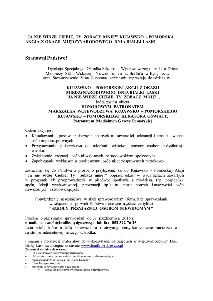 "JA NIE WIDZĘ CIEBIE, TY ZOBACZ MNIE!” KUJAWSKO – POMORSKA AKCJA Z OKAZJI MIĘDZYNARODOWEGO DNIA BIAŁEJ LASKI Szanowni Państwo! Dyrekcja Specjalnego Ośrodka Szkolno – Wychowawczego nr 1 dla Dzieci i Młodzieży Słabo Widzącej i Niewidomej im. L. Braille’a w Bydgoszczy oraz Stowarzyszenie Visus Supremus serdecznie zapraszają do udziału w KUJAWSKO - POMORSKIEJ AKCJI Z OKAZJI MIĘDZYNARODOWEGO DNIA BIAŁEJ LASKI "JA NIE WIDZĘ CIEBIE, TY ZOBACZ MNIE!”, która została objęta HONOROWYM PATRONATEM MARSZAŁKA WOJEWÓDZTWA KUJAWSKO – POMORSKIEGO KUJAWSKO – POMORSKIEGO KURATORA OŚWIATY, Patronatem Medialnym Gazety Pomorskiej Celem akcji jest Kształtowanie postaw społecznych opartych na otwartości, tolerancji i empatii wobec osób niepełnosprawnych Przygotowanie społeczeństwa do udzielania właściwej pomocy osobom z dysfunkcją wzroku, Zwiększenie integracji osób niewidomych ze środowiskiem społecznym Zapobieganie wykluczeniu społecznemu osób niepełnosprawnych wzrokowo Zwracamy się do Państwa z prośbą o przyłączenie się do Kujawsko – Pomorskiej Akcji "Ja nie widzę Ciebie, Ty zobacz mnie!” poprzez udział w wydarzeniach zawartych w programie lub przeprowadzenie w placówce spotkania z młodzieżą, (np. pogadanki, apelu, lekcji wychowawczej, prezentacji itp.) na temat potrzeb i możliwości osób niewidomych i słabowidzących. Potwierdzenie uczestnictwa w akcji sprawozdaniem (formularz sprawozdania w załączeniu), pozwoli Państwa placówce uzyskać certyfikat "SZKOŁY PRZYJAZNEJ OSOBOM NIEWIDOMYM" Prosimy o przesyłanie sprawozdań do 31 października 2016 r. e-mail: [email protected] lub fax 052 322 76 25 Lista szkół, które nadeślą sprawozdania i otrzymają certyfikat zostanie zamieszczona na stronie internetowej naszego Ośrodka. Program i propozycje materiałów do wykorzystania na zajęciach w Międzynarodowym Dniu Białej Laski są dostępne na stronie www.braille.bydgoszcz.pl Załączniki do pobrania ze strony list niewidomych i słabowidzących uczniów plakat- do rozwieszenia w widocznym dla uczniów i rodziców miejscu zaproszenie do Multikina na film „Carte blanche” formularz sprawozdania materiały do wykorzystania na zajęciach : ulotka jak postępować w obecności osób niewidomych, alfabet Braille'a krótka historia białej laski Edukacja niewidomych? Jak to było? materiały filmowe: LIP DUB https://www.youtube.com/watch?v=OXYmuWp-Ofg N jak niewidomy, czyli jak pomóc osobie z dysfunkcją wzroku https://www.youtube.com/watch?v=WpJ2hrmn7qM Film : https://www.youtube.com/watch?v=SZGhUr3UJ8Q