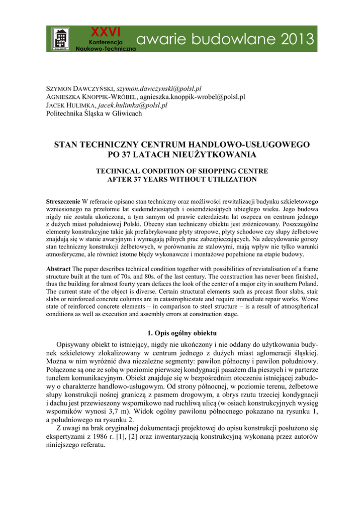 XXVI Konferencja Naukowo-Techniczna awarie budowlane 2013 SZYMON DAWCZYŃSKI, [email protected] AGNIESZKA KNOPPIK-WRÓBEL, [email protected] JACEK HULIMKA, [email protected] Politechnika Śląska w Gliwicach STAN TECHNICZNY CENTRUM HANDLOWO-USŁUGOWEGO PO 37 LATACH NIEUŻYTKOWANIA TECHNICAL CONDITION OF SHOPPING CENTRE AFTER 37 YEARS WITHOUT UTILIZATION Streszczenie W referacie opisano stan techniczny oraz możliwości rewitalizacji budynku szkieletowego wzniesionego na przełomie lat siedemdziesiątych i osiemdziesiątych ubiegłego wieku. Jego budowa nigdy nie została ukończona, a tym samym od prawie czterdziestu lat oszpeca on centrum jednego z dużych miast południowej Polski. Obecny stan techniczny obiektu jest zróżnicowany. Poszczególne elementy konstrukcyjne takie jak prefabrykowane płyty stropowe, płyty schodowe czy słupy żelbetowe znajdują się w stanie awaryjnym i wymagają pilnych prac zabezpieczających. Na zdecydowanie gorszy stan techniczny konstrukcji żelbetowych, w porównaniu ze stalowymi, mają wpływ nie tylko warunki atmosferyczne, ale również istotne błędy wykonawcze i montażowe popełnione na etapie budowy. Abstract The paper describes technical condition together with possibilities of reviatalisation of a frame structure built at the turn of 70s. and 80s. of the last century. The construction has never been finished, thus the building for almost fourty years defaces the look of the center of a major city in southern Poland. The current state of the object is diverse. Certain structural elements such as precast floor slabs, stair slabs or reinforced concrete columns are in catastrophicstate and require immediate repair works. Worse state of reinforced concrete elements – in comparison to steel structure – is a result of atmospherical conditions as well as execution and assembly errors at construction stage. 1. Opis ogólny obiektu Opisywany obiekt to istniejący, nigdy nie ukończony i nie oddany do użytkowania budynek szkieletowy zlokalizowany w centrum jednego z dużych miast aglomeracji śląskiej. Można w nim wyróżnić dwa niezależne segmenty: pawilon północny i pawilon południowy. Połączone są one ze sobą w poziomie pierwszej kondygnacji pasażem dla pieszych i w parterze tunelem komunikacyjnym. Obiekt znajduje się w bezpośrednim otoczeniu istniejącej zabudowy o charakterze handlowo-usługowym. Od strony północnej, w poziomie terenu, żelbetowe słupy konstrukcji nośnej graniczą z pasmem drogowym, a obrys rzutu trzeciej kondygnacji i dachu jest przewieszony wspornikowo nad ruchliwą ulicą (w osiach konstrukcyjnych wysięg wsporników wynosi 3,7 m). Widok ogólny pawilonu północnego pokazano na rysunku 1, a południowego na rysunku 2. Z uwagi na brak oryginalnej dokumentacji projektowej do opisu konstrukcji posłużono się ekspertyzami z 1986 r. [1], [2] oraz inwentaryzacją konstrukcyjną wykonaną przez autorów niniejszego referatu. 636 Dawczyński S. i in.: Stan techniczny Centrum Handlowo-Usługowego po 37 latach… W rzucie głównych osi konstrukcyjnych budynek pawilonu północnego ma następujące wymiary: szerokość 27,0 m (trzy przęsła po 9,0 m) i długość 57,4 m (dwa przęsła po 12,0 m, dwa przęsła po 11,6 m, od południa przęsło 6,5 m i od północy przęsło 3,7 m). Wysokość całego obiektu ponad poziom terenu to około 15,0 m. Tworzą go trzy kondygnacje nadziemne o wysokości 4,80 m każda. Na niewielkim fragmencie rzutu zinwentaryzowano dwie piwnice o wymiarach 16,68×0,76 m i 2,57×3,70 m (kanał sieci CO i pomieszczenie klimatyzacji); obecnie obydwa pomieszczenia są zalane wodą. Budynek pawilonu południowego ma regularną geometrię. Jego wymiary w rzucie głównych osi konstrukcyjnych to 30,6 m (trzy przęsła po 9,0 m i wspornikowo wysunięte przęsło 3,6 m od strony zachodniej) na 26,9 m (dwa przęsła po 11,6 m i wspornikowo wysunięte przęsło 3,7 m od południa). Pawilon tworzą trzy kondygnacje o wysokości 4,80 m każda. Ze względu na ukształtowanie otaczającego terenu pierwsza kondygnacja traktowana była jako podziemna. Rys. 1. Widok pawilonu północnego Rys. 2. Widok pawilonu południowego 2. Rys historyczny Budowę pawilonu północnego rozpoczęto w maju 1976 roku i kontynuowano do grudnia 1984 roku, a budowę pawilonu południowego rozpoczęto w grudniu 1975 roku i kontynuowano do połowy 1983 roku [2]. W okresie tym wzniesiono szkielet konstrukcji nośnej obejmujący stalowe i żelbetowe słupy oraz stalowe żebra i podciągi. Wykonano również, z żelbetowych płyt prefabrykowanych, stropy poszczególnych kondygnacji, a także fragment stropodachu, część trzonów komunikacyjnych oraz większość ścian zewnętrznych. Obecnie, z uwagi na długi okres czasu jaki minął od wstrzymania robót budowlanych, ze ścian zewnętrznych pozostały tylko fragmenty stalowej konstrukcji wsporczej oraz pojedyncze warstwowe płyty osłonowe PW8/B o okładzinach stalowych i rdzeniu z pianki poliuretanowej (rys. 1, 2). Zgodnie z planem funkcjonalnym obiektu, zawartym w ekspertyzach [1], [2] w pawilonie północnym na pierwszej kondygnacji miały być zlokalizowane pomieszczenia Okręgowej Spółdzielni Mleczarskiej (sala sprzedaży, magazyny, pomieszczenia pomocnicze i sanitarne) oraz WPHAPiS (sklep papierniczy i kiosk). Na drugiej kondygnacji miały się znaleźć również pomieszczenia OSM (sala konsumentów, magazyny podręczne, zmywalnia i pracownia deserów) oraz pomieszczenia PPWK „Ruch” (kiosk i salon). Na ostatniej, trzeciej kondygnacji planowano pomieszczenia Zakładów Gastronomicznych (kawiarnia i pomieszczenia towarzyszące). W pawilonie południowym docelowo miały się znaleźć pomieszczenia Zakładów Gastronomicznych i Zakładów Piwowarsko-Słodowniczych (magazyny, biura, sale sprzedaży, szatnie, pomieszczenia techniczne i sanitarne). Konstrukcje żelbetowe 637 3. Opis konstrukcji Obiekt zaprojektowany został według systemu U-75/ZLS. Konstrukcję noś