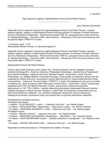 Pobrano z portalu Mapa Kultury 11.06.2015 Gala wręczenia nagród w Ogólnopolskim Konkursie Na Plakat Filmowy ____________________________ autor: Marzena Szychułda Nadszedł czas by nagrodzić zwycięzców Ogólnopolskiego Konkursu Na Plakat Filmowy. Laureaci odbiorą nagrody i dyplomy w Warszawskiej Szkole Filmowej podczas VI Festiwalu Filmoteki Szkolnej z rąk Anny Sienkiewicz-Rogowskiej – Pełnomocnik Dyrektor PISF ds. upowszechniania kultury filmowej, dr. Macieja Ślesickiego – Kanclerza WSF, Alicji Pacewicz – Wiceprezes CEO oraz jurora konkursu prof. Krzysztofa Hejke z PWSTiTV w Łodzi. 12 czerwca, godz. 11.00 Warszawska Szkoła Filmowa, ul. Generała Zajączka 7 Nadszedł czas by nagrodzić zwycięzców Ogólnopolskiego Konkursu Na Plakat Filmowy. Laureaci odbiorą nagrody i dyplomy w Warszawskiej Szkole Filmowej podczas VI Festiwalu Filmoteki Szkolnej z rąk Anny Sienkiewicz-Rogowskiej – Pełnomocnik Dyrektor PISF ds. upowszechniania kultury filmowej, dr. Macieja Ślesickiego – Kanclerza WSF, Alicji Pacewicz – Wiceprezes CEO oraz jurora konkursu prof. Krzysztofa Hejke z PWSTiTV w Łodzi. Ogólnopolski Konkurs Na Plakat Filmowy Konkurs łączył dwie dziedziny sztuki: plakat i film. Zachęcał młodych ludzi do oglądania arcydzieł polskiej kinematografii tj. „Rodzina człowiecza” Władysława Ślesickiego, „Historia kina w Popielawach” Jana Jakuba Kolskiego, „Usłyszcie mój krzyk” Macieja Drygasa, „Dwaj ludzie z szafą” Romana Polańskiego, czy „Mojego Nikifora” Krzysztofa Krauzego, w taki sposób, by obejrzane obrazy stały się inspiracją do działań twórczych i poszukiwań nowych palet barwnych w naszej niejednokrotnie szarej rzeczywistości – mówił prof. Krzysztof Hejke z PWSFTiT. Z około 100 nadesłanych prac grono jurorskie w składzie prof. Józef Jurczyszyn (ASP Warszawa), Dorota Petrus – dziennikarz, reżyser, scenarzysta, współpracownik TVP oraz Marek Pawłowski, reżyser, scenarzysta i producent programów telewizyjnych w TVP, TVN, CANAL+, wybrało najbardziej pomysłowe interpretacje filmowych kadrów, najlepiej rokujących młodych twórców. Dodajmy, z całej Polski. Do dyspozycji uczestników konkursu były techniki graficzno-malarskie. Jury oceniało umiejętności artystyczne, poziom artystyczny, nawiązanie do tematu, przekazanie treści oraz klimatu filmu za pomocą elementów malarskich. Przedstawiamy laureatów konkursu: W kategorii gimnazjum: • I miejsce – JULIA RAKOCZY ( Lublin ) – „Usłyszcie mój krzyk” – reż. Maciej Drygas • II miejsce – ZOFIA MOSTRĄG ( Baszkówka) – „Dwaj ludzie z szafą” – reż. Roman Polański • III miejsce – WERONIKA MALESZYK ( Lublin) - „Usłyszcie mój krzyk” – reż. Maciej Drygas W kategorii liceum: • I miejsce – MICHAŁ KOŁACZ - „Usłyszcie mój krzyk” – reż. Maciej Drygas • II miejsce – WERONIKA DUCHLIŃSKA ( Baszkówka) – „ Mój Nikifor” – reż. Krzysztof Krauze • III miejsce – MAJA SKOWRONEK (Łódź)) – „Rękopis znaleziony w Saragossie” – reż. Wojciech Jerzy Has • III miejsce – MICHAŁ WALCZAK( Łódź) – „Usłyszcie mój krzyk” – reż. Maciej Drygas Nagrodami w konkursie będą m.in. Professional pen tablety i Art peny. strona 1 / 2 Pobrano z portalu Mapa Kultury Prace nagrodzone i wyróżnione przechodzą na własność organizatora. Po raz pierwszy zostaną zaprezentowane w Warszawskiej Szkole Filmowej. Zwiedzający będą mogli je oglądać do 30 czerwca. Następnie plakaty wystawi Galeria Domu Kultury Zacisze, Galeria Kina Kultura i Galeria Kina Praha. Organizator: Dom Kultury „Zacisze” w Dzielnicy Targówek m.st. Warszawy Współorganizatorzy: Polski Instytut Sztuki Filmowej w Warszawie i Warszawska Szkoła Filmowa Festiwal Filmoteki Szkolnej Festiwal Filmoteki Szkolnej odbywa się już po raz szósty w dniach 11-12 czerwca 2015. Daje niepowtarzalną okazję do spotkania młodych kinomanów, którzy realizują swoje pierwsze filmy, świadomie dyskutują o oglądanych produkcjach oraz organizują filmowe akcje angażując w to szkoły i lokalne społeczności. W 6. edycji wydarzenia weźmie udział rekordowa liczba uczestników. Do Warszawy przyjedzie ponad 150 uczniów oraz 50 pedagogów z całej Polski! Niebywałą okazją będzie możliwość poznania twórców najlepszych plakatów Ogólnopolskie Konkursu Na Plakat Filmowy oraz obejrzenia z bliska nagrodzonych prac. Wystawa prezentowana będzie w Warszawskiej Szkole Filmowej do 30 czerwca 2015. 12 czerwca 2015 oprócz gali wręczenia nagród w naszym konkursie uczniowie spotkają się z reżyserami, aktorami, operatorami i krytykami filmowymi. Goście zasiądą przy stolikach tematycznych, do których młodzież będzie dołączać w grupach na 12 minut rozmowy. Zaproszeni eksperci poradzą, zainspirują i przede wszystkim opowiedzą o tajnikach swojego zawodu. Gośćmi Festiwalu będą m.in.: reżyser Tomasz Wasilewski (Płynące wieżowce), aktorzy Magdalena Czerwińska (Bogowie) i Sebastian Fabijański (Jeziorak), prof. Krzysztof Hejke z PWSTiTV w Łodzi. Więcej: http://www.zacisze.waw.pl/pl/artykul/2431 strona 2 / 2
