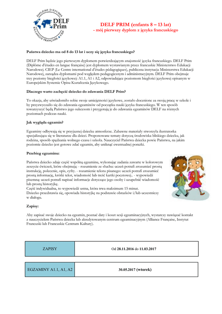 DELF PRIM (enfants 8 – 13 lat) - mój pierwszy dyplom z języka francuskiego Państwa dziecko ma od 8 do 13 lat i uczy się języka francuskiego? DELF Prim będzie jego pierwszym dyplomem potwierdzającym znajomość języka francuskiego. DELF Prim (Diplôme d’études en langue française) jest dyplomem wystawianym przez francuskie Ministerstwo Edukacji Narodowej. CIEP (Le Centre international d’études pédagogiques), publiczna instytucja Ministerstwa Edukacji Narodowej, zarządza dyplomami pod względem pedagogicznym i administracyjnym. DELF Prim obejmuje trzy poziomy biegłości językowej: A1.1, A1 i A2, odpowiadające poziomom biegłości językowej opisanym w Europejskim Systemie Opisu Kształcenia Językowego. Dlaczego warto zachęcić dziecko do zdawania DELF Prim? To okazja, aby uświadomiło sobie swoje umiejętności językowe, zostało docenione za swoją pracę w szkole i by przyzwyczaiło się do zdawania egzaminów od początku nauki języka francuskiego. W ten sposób towarzyszyć będą Państwo jego sukcesom i przygotują je do zdawania egzaminów DELF na różnych poziomach podczas nauki. Jak wygląda egzamin? Egzaminy odbywają się w przyjaznej dziecku atmosferze. Zabawne materiały stworzyła ilustratorka specjalizująca się w literaturze dla dzieci. Proponowane tematy dotyczą środowiska bliskiego dziecku, jak rodzina, sposób spędzania wolnego czasu i szkoła. Nauczyciel Państwa dziecka powie Państwu, na jakim poziomie dziecko jest gotowe zdać egzamin, aby uniknąć ewentualnej porażki. Przebieg egzaminu: Państwa dziecko zdaje część wspólną egzaminu, wykonując zadania zawarte w kolorowym zeszycie ćwiczeń, które obejmują: - rozumienie ze słuchu: uczeń potrafi zrozumieć prostą instrukcję, polecenie, opis, cyfry. - rozumienie tekstu pisanego: uczeń potrafi zrozumieć prostą informację, krótki tekst, wiadomość lub treść kartki pocztowej.. - wypowiedź pisemną: uczeń potrafi napisać informacje dotyczące jego osoby i uzupełnić wiadomość lub prostą historyjkę. Część indywidualna, to wypowiedź ustna, która trwa maksimum 15 minut. Dziecko przedstawia się, opowiada historyjkę na podstawie obrazków i/lub uczestniczy w dialogu. Zapisy: Aby zapisać swoje dziecko na egzamin, poznać daty i koszt sesji egzaminacyjnych, wystarczy nawiązać kontakt z nauczycielem Państwa dziecka lub akredytowanym centrum egzaminacyjnym (Alliance Française, Instytut Francuski lub Francuskie Centrum Kultury). ZAPISY EGZAMINY A1.1, A1, A2 Od 28.11.2016 do 11.03.2017 30.05.2017 (wtorek)