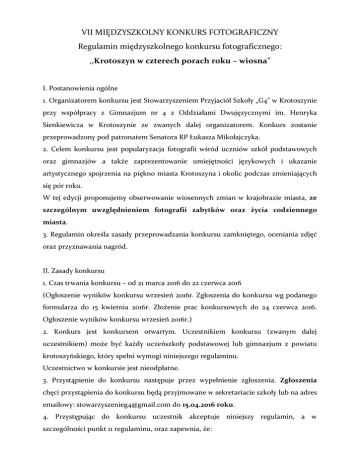 VII MIĘDZYSZKOLNY KONKURS FOTOGRAFICZNY Regulamin międzyszkolnego konkursu fotograficznego: ,,Krotoszyn w czterech porach roku – wiosna” I. Postanowienia ogólne 1. Organizatorem konkursu jest Stowarzyszeniem Przyjaciół Szkoły „G4” w Krotoszynie przy współpracy z Gimnazjum nr 4 z Oddziałami Dwujęzycznymi im. Henryka Sienkiewicza w Krotoszynie ze zwanych dalej organizatorem. Konkurs zostanie przeprowadzony pod patronatem Senatora RP Łukasza Mikołajczyka. 2. Celem konkursu jest popularyzacja fotografii wśród uczniów szkół podstawowych oraz gimnazjów a także zaprezentowanie umiejętności językowych i ukazanie artystycznego spojrzenia na piękno miasta Krotoszyna i okolic podczas zmieniających się pór roku. W tej edycji proponujemy obserwowanie wiosennych zmian w krajobrazie miasta, ze szczególnym uwzględnieniem fotografii zabytków oraz życia codziennego miasta. 3. Regulamin określa zasady przeprowadzania konkursu zamkniętego, oceniania zdjęć oraz przyznawania nagród. II. Zasady konkursu 1. Czas trwania konkursu – od 21 marca 2016 do 22 czerwca 2016 (Ogłoszenie wyników konkursu wrzesień 2016r. Zgłoszenia do konkursu wg podanego formularza do 15 kwietnia 2016r. Złożenie prac konkursowych do 24 czerwca 2016. Ogłoszenie wyników konkursu wrzesień 2016r.) 2. Konkurs jest konkursem otwartym. Uczestnikiem konkursu (zwanym dalej uczestnikiem) może być każdy uczeńszkoły podstawowej lub gimnazjum z powiatu krotoszyńskiego, który spełni wymogi niniejszego regulaminu. Uczestnictwo w konkursie jest nieodpłatne. 3. Przystąpienie do konkursu następuje przez wypełnienie zgłoszenia. Zgłoszenia chęci przystąpienia do konkursu będą przyjmowane w sekretariacie szkoły lub na adres emailowy: [email protected] do 15.04.2016 roku. 4. Przystępując do konkursu uczestnik akceptuje niniejszy regulamin, a w szczególności punkt 11 regulaminu, oraz zapewnia, że: a. posiada pełnię praw autorskich do zgłoszonej pracy, b. nie narusza praw autorskich osób trzecich, c. nie narusza dóbr osobistych osób, które zostały na nich przedstawione oraz innych dóbr prawnie chronionych, d. praca konkursowa zawiera wyłącznie oryginalne,niepublikowane i nienagradzalne, samodzielnie wykonane przez uczniów materiały. 5. Do konkursu uczniowie przystępują pojedynczo. 6. Zadaniem uczniów jest przygotowanie prezentacji multimedialnej, która podlega ocenie, a także skomentowanie poszczególnych fotografii w j. polskim i niemieckim lub angielskim. Ocenie podlegają: -prezentacja w programie Power Point (maksymalnie do 10 zdjęć) -podpisy pod zdjęciami – trafność i poprawność językowa (zdjęcia powinny być opisane w języku polskim i j. angielskim lub j. polskim i j. niemieckim) Dodatkowo należy załączyć WSZYSTKIE ZDJĘCIA Z PREZENTACJI W FORMACIE JPG. 7. Zgłaszane fotografie nie mogą być modyfikowane elektronicznie (żadnych fotomontaży), zezwala się jedynie poprawić jakość zdjęcia (kontrast, nasycenie). 8. Prace konkursowe należy składać bezpośrednio w sekretariacie Gimnazjum nr 4 przy ul. 23. Stycznia 20 w Krotoszynie. Prace powinny zostać złożone w zaklejonej kopercie z dopiskiem „Krotoszyn w czterech porach roku – wiosna”. W kopercie powinna się znajdować opisana płyta CD. Koperta powinna zawierać: a. imię i nazwisko autora oraz klasę, b. szkołę, którą reprezentuje, c. imię i nazwisko opiekuna. 9. Termin składania prac upływa 24 czerwca 2016 roku. 10. Zgłoszone prace będą eksponowane na wystawie pokonkursowej w Gimnazjum nr 4 oraz na stronie internetowej stowarzyszenia. III. Zasady rozstrzygnięcia konkursu 1. Prace zostaną ocenione przez jury w składzie powołanym przez organizatorów (przedstawiciel Urzędu Miejskiego, n-l germanista, n-l anglista oraz profesjonalny fotograf) 2. Decyzja jury jest ostateczna i nie przysługuje od niej tryb odwoławczy. 3. Jury zastrzega sobie prawo do przyznania wyróżnień. 4. Jury zastrzega sobie prawo do nieprzyznania pierwszej nagrody. 5. Organizator zastrzega sobie prawo do przyznania nagrody publiczności osobie/grupie osób, które zdobędą najwięcej „lubię to” pod zdjęciem na facebooku organizatora. www.facebook.com/stowarzyszenieg4 6. Uczestnicy konkursu zostaną powiadomieni o czasie i miejscu rozstrzygnięcia konkursu oraz wręczenia nagród. 7. Organizatorzy nie zwracają zgłoszonych prac. 8. Organizatorzy przewidują nagrody. IV. Postanowienia końcowe 1. Wzięcie udziału w konkursie (przesłanie prac) jest równoznaczne z wyrażeniem zgody na wykorzystywanie danych osobowych uczestnika zgodnie z przepisami Ustawy z 29 sierpnia 1997 r. o ochronie danych osobowych. 2. Uczestnicy ponoszą pełną odpowiedzialność za zgodność z prawdą danych nadesłanych wraz z pracami wynikającą z przepisów Kodeksu Cywilnego z 23 kwietnia 1964 r. oraz Ustawy z 4 lutego 1994 r. o prawie autorskim i prawach pokrewnych. 3. Organizatorzy nie ponoszą odpowiedzialności prawnej za naruszenie praw autorskich osób trzecich przez uczestników konkursu. 4. Organizatorzy zastrzegają sobie prawo do skrócenia, przedłużenia, przerwania lub odwołania konkursu bez podania przyczyny. 5. Niniejszy dokument jest jedynym dokumentem określającym zasady konkursu. 6. Regulamin jest do dostępny w siedzibie oraz na stronach internetowych organizatora. 7. We wszystkich sprawach nieobjętych niniejszym regulaminem decyduje organizator o ile akty prawne wyższego rzędu nie stanowią inaczej. 8. Ze względu na charakter konkursu i czas jego trwania, prosimy wyznaczenie z każdej szkoły nauczyciela, z którym organizatorzy konkursu mogliby się kontaktować podczas VII edycji konkursu. Prosimy o przekazanie tej informacji na adres emailowy stowarzyszenia: Stowarzyszenie Przyjaciół Szkoły „G-4”, Krotoszyn, ul. 23 Stycznia 20 e-mail: [email protected]