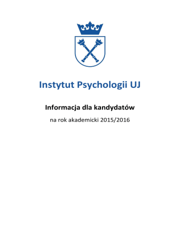 Instytut Psychologii UJ Informacja dla kandydatów na rok akademicki 2015/2016 Dlaczego warto studiować psychologię w Instytucie Psychologii UJ? Pięcioletnie studia magisterskie na kierunku Psychologia na Wydziale Filozoficznym to połączenie starannego przygotowania teoretycznego i możliwości nabycia podstawowych umiejętności niezbędnych w zawodzie psychologa na zajęciach praktycznych. Nasza kadra to pełni pasji, wysokiej klasy specjaliści w różnych dziedzinach psychologii i doświadczeni dydaktycy. Psychologia na Wydziale Filozoficznym UJ to szansa na rozwijanie zainteresowań, zdobycie gruntownej wiedzy wspartej licznymi zajęciami praktycznymi oraz gwarancja kształcenia na najwyższym poziomie potwierdzona Certyfikatem Jakości Kształcenia Konferencji Rektorów Uniwersytetów Polskich na lata 2011–2016. Umożliwiamy studentom indywidualne kształtowanie programu, samodzielne pogłębianie wiedzy w obszarach, które szczególnie ich interesują, i przygotowujemy zarówno do pracy w zawodzie (np. psycholog edukacyjny, psycholog kliniczny, biegły sądowy, specjalista ds. reklamy, marketingu i HR, psycholog sportu, doradca zawodowy, specjalista ds. rekrutacji i selekcji, specjalista ds. promocji zdrowia), jak i dalszej pracy badawczej. Wspieramy inicjatywy i aktywność naukową naszych Studentów. Wydawane jest cyklicznie studenckie pismo „Stimulus”. Ponadto osoby zainteresowane dodatkową aktywnością mają okazję zapisania się do Koła Naukowego Studentów Psychologii UJ. Obecnie w ramach Koła funkcjonują następujące sekcje: Sekcja Eksperymentalna, Sekcja Neuropsychologii, Sekcja Psychoanalityczna, Sekcja Psychologii Hermeneutycznej, Sekcja Psychologii Klinicznej, Sekcja Psychologii Sądowej, Sekcja Psychologii Sportu, Sekcja Psychologii Zdrowia „Zdrowy kontakt”, Sekcja Trenerska. Prężnie działa też Neolution, ciesząca się uznaniem organizacja realizująca zlecenia z zakresu psychologii biznesu. Starsi studenci i młodzi absolwenci mogą ponadto realizować się w Kole Młodych Psychologów Polskiego Towarzystwa Psychologicznego, z którym Instytut Psychologii współpracuje. Dysponujemy 150 miejscami na studiach stacjonarnych i 150 miejscami na studiach niestacjonarnych. Ramowy plan pierwszych lat studiów możesz zobaczyć tutaj. U nas, począwszy od trzeciego roku studiów, każdy student ma możliwość decydowania, na jakie zajęcia się zapisze. W obecnej ofercie proponujemy aż 110 kursów fakultatywnych. Studenci o sprecyzowanych zainteresowaniach mogą wybrać jedną lub dwie z siedmiu ścieżek specjalizacyjnych. Są to: 1. 2. 3. 4. 5. 6. 7. Psychologia kliniczna Psychologia kliniczna dziecka Psychologia organizacji i reklamy Psychologia rodziny i edukacji Psychologia sądowa Psychologia sportu Psychologia zdrowia Studenci o niesprecyzowanych wyraźnie zainteresowaniach nie muszą wybierać żadnej ścieżki specjalizacyjnej – po prostu realizują różne interesujące ich kursy, wybierając z bogatej oferty naszego Instytutu. Jeśli masz jakieś pytania lub wątpliwości, prosimy pisać na adres: [email protected]. Informacji na temat rekrutacji udziela wyłącznie Dział Rekrutacji UJ.
