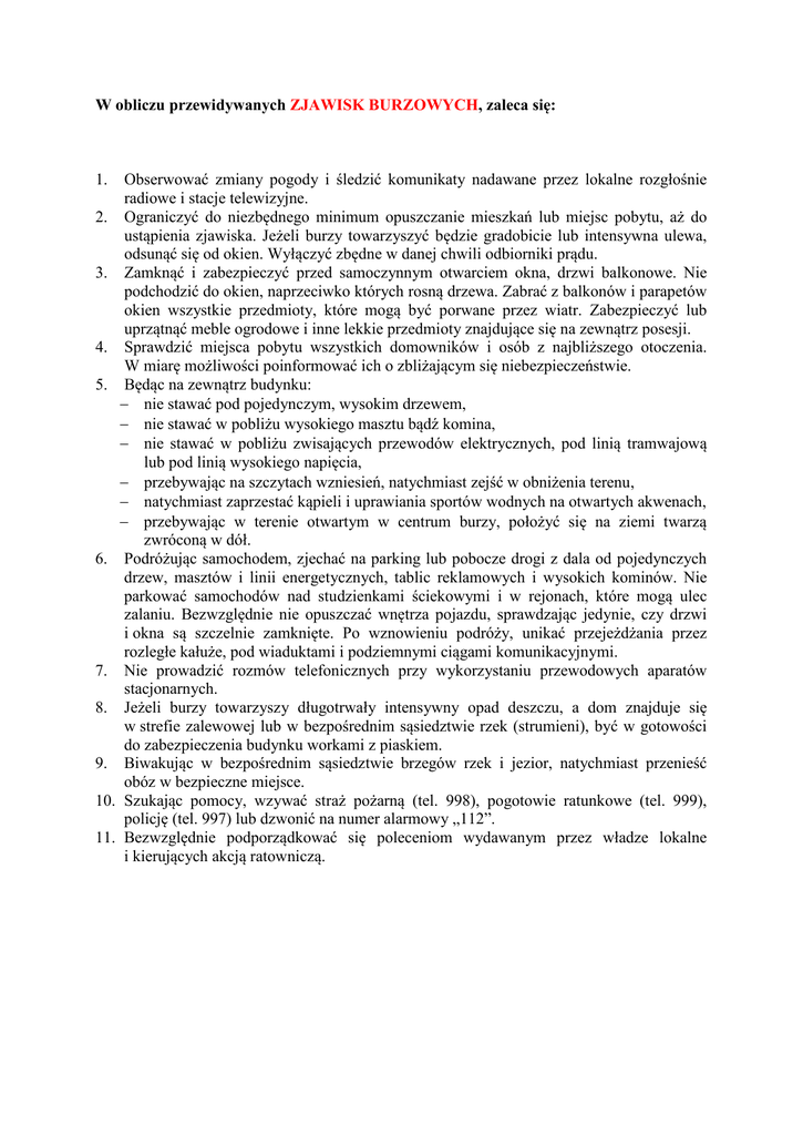 W obliczu przewidywanych ZJAWISK BURZOWYCH, zaleca się: Obserwować zmiany pogody i śledzić komunikaty nadawane przez lokalne rozgłośnie radiowe i stacje telewizyjne. 2. Ograniczyć do niezbędnego minimum opuszczanie mieszkań lub miejsc pobytu, aż do ustąpienia zjawiska. Jeżeli burzy towarzyszyć będzie gradobicie lub intensywna ulewa, odsunąć się od okien. Wyłączyć zbędne w danej chwili odbiorniki prądu. 3. Zamknąć i zabezpieczyć przed samoczynnym otwarciem okna, drzwi balkonowe. Nie podchodzić do okien, naprzeciwko których rosną drzewa. Zabrać z balkonów i parapetów okien wszystkie przedmioty, które mogą być porwane przez wiatr. Zabezpieczyć lub uprzątnąć meble ogrodowe i inne lekkie przedmioty znajdujące się na zewnątrz posesji. 4. Sprawdzić miejsca pobytu wszystkich domowników i osób z najbliższego otoczenia. W miarę możliwości poinformować ich o zbliżającym się niebezpieczeństwie. 5. Będąc na zewnątrz budynku: − nie stawać pod pojedynczym, wysokim drzewem, − nie stawać w pobliżu wysokiego masztu bądź komina, − nie stawać w pobliżu zwisających przewodów elektrycznych, pod linią tramwajową lub pod linią wysokiego napięcia, − przebywając na szczytach wzniesień, natychmiast zejść w obniżenia terenu, − natychmiast zaprzestać kąpieli i uprawiania sportów wodnych na otwartych akwenach, − przebywając w terenie otwartym w centrum burzy, położyć się na ziemi twarzą zwróconą w dół. 6. Podróżując samochodem, zjechać na parking lub pobocze drogi z dala od pojedynczych drzew, masztów i linii energetycznych, tablic reklamowych i wysokich kominów. Nie parkować samochodów nad studzienkami ściekowymi i w rejonach, które mogą ulec zalaniu. Bezwzględnie nie opuszczać wnętrza pojazdu, sprawdzając jedynie, czy drzwi i okna są szczelnie zamknięte. Po wznowieniu podróży, unikać przejeżdżania przez rozległe kałuże, pod wiaduktami i podziemnymi ciągami komunikacyjnymi. 7. Nie prowadzić rozmów telefonicznych przy wykorzystaniu przewodowych aparatów stacjonarnych. 8. Jeżeli burzy towarzyszy długotrwały intensywny opad deszczu, a dom znajduje się w strefie zalewowej lub w bezpośrednim sąsiedztwie rzek (strumieni), być w gotowości do zabezpieczenia budynku workami z piaskiem. 9. Biwakując w bezpośrednim sąsiedztwie brzegów rzek i jezior, natychmiast przenieść obóz w bezpieczne miejsce. 10. Szukając pomocy, wzywać straż pożarną (tel. 998), pogotowie ratunkowe (tel. 999), policję (tel. 997) lub dzwonić na numer alarmowy „112”. 11. Bezwzględnie podporządkować się poleceniom wydawanym przez władze lokalne i kierujących akcją ratowniczą. 1.