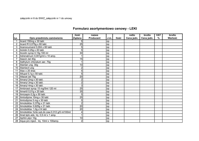 załącznik nr 6 do SIWZ_załącznik nr 1 do umowy Formularz asortymentowo cenowy - LEKI Lp. 1 2 3 4 5 6 7 8 9 10 11 12 13 14 15 16 17 18 19 20 21 22 23 24 25 26 27 28 Opis przedmiotu zamówienia Acard 150mg x 30 tabl. Acard R 0,075g x 60 tabl. Acenocumarol 0,004 x 60 tabl. Aclotin 0,25g x 20 tabl. Acodin syrop 0,15g 100 ml Adrenalinum 0,001g/ml x 10 amp. Aescin żel 40g Aethylum chloratum aer. 70g Alantan ung. 30g Alantavit ung Alax x 20 draż. Allupol 0,1g x 50 tabl. Altacet żel 75g Amaryl 2mg x 30 tabl. Amaryl 3mg x 30 tabl. Amaryl 4mg x 30 tabl. Ambrosol syrop 15 mg/5ml 120 ml Amertil 0,01g x 20 tabl. Amizepin 0,2g x 50 tabl. Amlodipine 10mg x 30 tabl. Amlodipine 5 mg x 30 tabl. Amoksiklav 0,375g x 21 tabl. Amoksiklav 0,625g x 21 tabl. Amoksiklav 1,0g x14 tabl. Amoksiklav forte sub.do zaw.0,312 g/5 ml100ml Anat.tężc.ads. Inj. 0,5 ml x 1 amp. Aphtin płyn 10g Aqua pro inject. Inj. 10ml x 100amp. ilość Żądana 5 25 5 5 30 1 15 1 10 2 5 5 20 2 2 3 25 35 5 25 5 2 20 20 4 1 10 2 nazwa Producent J.m. op op op op op op op op op op op op op op op op op op op op op op op op op op op op Ilość netto Cena jedn. brutto Cena jedn. VAT % brutto Wartość 29 30 31 32 33 34 35 36 37 38 39 40 41 42 43 44 45 46 47 48 49 50 51 52 53 54 55 56 57 58 59 60 61 62 63 64 Aquacel Hydrofibre Ag opatr. 10x10cm x1szt Argosulfan 2% krem 40g Asertin 50mg x 30 tabl. Aspargin x 75 tabl. Atecortin zaw.5ml x 1 Atrauman Ag opatr.jał. 10x10cm x1szt Atropinum sulf. Inj. 0,001g /1ml x 10 amp. Atropinum sulf. Inj. 0,5mg /1ml x 10 amp. Augmentin 457mg/5ml 70ml Avedol 12,5mg x 30 tabl.powl. Avedol 25mg x 30 tabl.powl. Avedol 6,25mg x 30 tabl.powl. Baclofen 0,01g x 50 tabl. Baclofen 0,025g x 50 tabl. Bemecor 0,1mg x 30 tabl. Benzyna 85g Berodual N aerozol 200 dawek Berodual płyn do inh. 20 ml Berotec 100 N aerozol 10ml x 1 Betadrin gutt.opht.2 x 5ml Betadrin krople do nosa 10ml Betaloc 0,005/5ml x 5 amp Betaserc 24mg x 50 tabl Betaserc 8mg x 100 tabl. Biodacyna 0,5g x 1 fiol. Biodacyna opht.0,3% 5ml krople do oczu Biofuroksym 0,75g x 1 fiol. Biofuroksym 1,5g x 1 fiol. Biosotal 0,04g x 60tabl Biosotal 0,08g x 20tabl Bioxetin 20mg x 30 tabl. Bisacodyl 0,005g x 30 tabl. Bisacodyl czop. 0,01g 5 szt Biseptol 0,48g x 20 tabl. Biseptol 0,96g x 10 tabl. Biseptol zaw. 0,24 g/5ml 100 ml 5 3 6 1 4 5 1 1 1 10 1 6 3 3 2 2 2 6 2 2 15 3 5 1 40 5 20 120 5 5 10 2 20 25 30 20 op op op op op op op op op op op op op op op op op op op op op op op op op op op op op op op op op op op op 65 66 67 68 69 70 71 72 73 74 75 76 77 78 79 80 81 82 83 84 85 86 87 88 89 90 91 92 93 94 95 96 97 98 99 100 Bisocard 10mg x 30 tabl. Bisocard 5mg x 30 tabl. Buderhin aer. do nosa 0,05 mg/daw. 10 ml Butapirazol 5% ung. 30 g Calcium 1,55g x 12 tabl.mus. Calcium syrop 150 ml Captopril 0,0125g x 30 tabl. Captopril 0,025g x 40 tabl. Captopril 0,05g x 40 tabl. Carbo medicinalis 0,3g x 20 tabl. Ceclor 250mg zawiesina 100 ml Cerutin x 125 tabl. Cinnarizinum 0,025g x 50 tabl.. Ciprofloxacin Kabi 200mg /100ml x 1 Ciprofloxacin Kabi 400mg /200ml x 1 Cipronex 0,5g x 10 tabl. Clemastinum 0,001g x 30 tabl. Clemastinum syrop 0,01 g/100 ml Clexane 40 mg x 10 amp. Clexane 80 mg x 10 amp. Clonazepamum 0,002g x 30 tabl. Clonazepamum 0,5mg x 30 tabl. Clopidogrel 75mg x 28 tabl. Cloranxen 5mg x 30 tabl. Clotrimazolum 1% krem 20 g Coaxil 12,5mg x 30 tabl.powl. Colchicum - Dispert x 50 draż. Concor Cor 2,5mg x 28 tabl. powl. Concor Cor 5mg x 28 tabl. powl. Cordarone 150mg/3ml x 6 amp Corhydron 0,1g x 5 amp. Cyclonamine 0,25g x 30 tabl. Cyclonamine 0,25g/2ml x 5amp. Czopki glicerynowe 1 g 10 szt. Czopki glicerynowe 2 g 10 szt. Dalacin C 0,15g x 16 kaps. 10 20 10 2 80 20 5 5 1 4 1 40 2 60 30 20 4 40 45 5 1 1 5 2 5 2 2 2 10 1 2 5 2 3 20 1 op op op op op op op op op op op op op op op op op op op op op op op op op op op op op op op op op op op op 101 102 103 104 105 106 107 108 109 110 111 112 113 114 115 116 117 118 119 120 121 122 123 124 125 126 127 128 129 130 131 132 133 134 135 136 Debretin x 30tabl. Debridat gran.d/przyg.zaw. 250ml Depakine Chrono 0,3g x 30 tabl. Depakine Chrono 0,5g x 30 tabl. Depakine syrop 150ml Detreomycyna 1% ung. 5 g tuba Detreomycyna 2% ung. 5 g tuba Dexaven 0,004 g/1ml 10 amp. Dexaven 0,008 g/2ml 10 amp. Diaprel MR 0,03g x 60 tabl. Diclac 0,075g x 5 amp. Diclofenac czop. 0,1 g 10 szt Dicortineff zaw. do oczu 5 ml Digoxin 0,1mg x 30 tabl. Digoxin 0,25mg x 30 tabl. Diosminex x 30 tabl. Diphergan syrop 150 ml Diprophos 7mg/ml x 5 amp. Dopaminum h/chl. 4% 200mg/5ml x 10 amp. Doreta x 30 tabl Doxyratio M 0,1g x 10 kaps. Duomox tabl. 0,5 g x 20 tabl. Duomox tabl. 0,75g x 20 tabl. Duomox tabl. 1g x 20 tabl. Duracef zaw.250mg/5ml 100ml Duracef zaw.500mg/5ml 100ml Effox 0,01g x 60 tabl. Effox 0,02g x 50 tabl.. Effox long 0,05g x 30 tabl. Enarenal 0,005g x 30 tabl. Enarenal 0,01g x 30 tabl. Encorton 1mg x 20 tabl. Encorton 5mg x 20 tabl. Ephedrinum h/chl. 25mg/ml x 10amp. Espumisan 0,04g x 100 kaps. Estazolam 0,002g x 20 tabl. 5 5 5 10 1 2 10 10 1 3 25 3 8 5 2 1 10 2 1 1 40 5 5 15 1 5 2 2 3 10 10 1 6 1 10 2 op op op op op op op op op op op op op op op op op op op op op op op op op op op op op op op op op op op op 137 138 139 140 141 142 143 144 145 146 147 148 149 150 151 152 153 154 155 156 157 158 159 160 161 162 163 164 165 166 167 168 169 170 171 172 Euphyllinum CR retard 0,25g x 30 tabl. Eurespal 2mg/ml syrop 150 ml Euthyrox N 50mg x 50 tabl. Fastum żel 50g Fenactil inj. dom. 0,025g/5ml 5 amp. Fenactil inj. doż. 0,05 g/2ml 10 amp. Fenistil 0,1% żel 30 g Fiolet gencj.r-r wodny 20ml 1% Flegamina 0,008g x 40 tabl.. Flegamina syrop 0,004 g/5ml 120 ml Fragmin 5000j/0,2ml x 10 ampstrzyk. Fragmin 7500j/0,3ml x 10 ampstrzyk. Furaginum 0,05g x 30 tabl. TEVA Furosemidum 0,02g x 5 amp. Furosemidum 0,04g x 30 tabl. Gastrolit proszek 15 sasz. Gelitaspon standard 80x50x10mm x 1 szt. Gentamycin 0,04g/1ml x 10 amp. Gentamycin 0,08g/2ml x 10 amp. Glucobay 50mg x 30 tabl. Glucosum 10%/ 500ml KabiPack Glucosum 20%/10ml x 10 amp. Glucosum 40%/10ml x 10 amp. Glucosum 5 % 50
